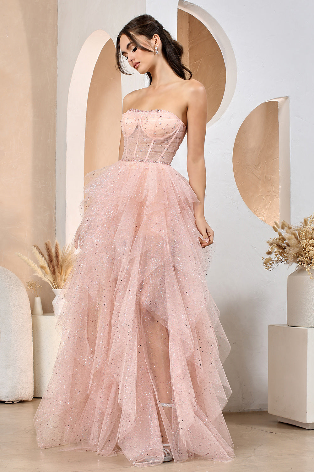 This gown offers a stunning, formal look built for impact at elegant events. It features a strapless corset-style bodice that provides a secure, flattering fit while highlighting the shoulders and neckline. The design flows into a full-length silhouette crafted from glitter tulle fabric that adds subtle sparkle and movement, giving the wearer a graceful and glamorous appearance. With its structured waistline and long flowing skirt, the gown creates an elongated, elegant profile — ideal for proms, galas, formal evenings, or any special occasion where refined glamour matters.