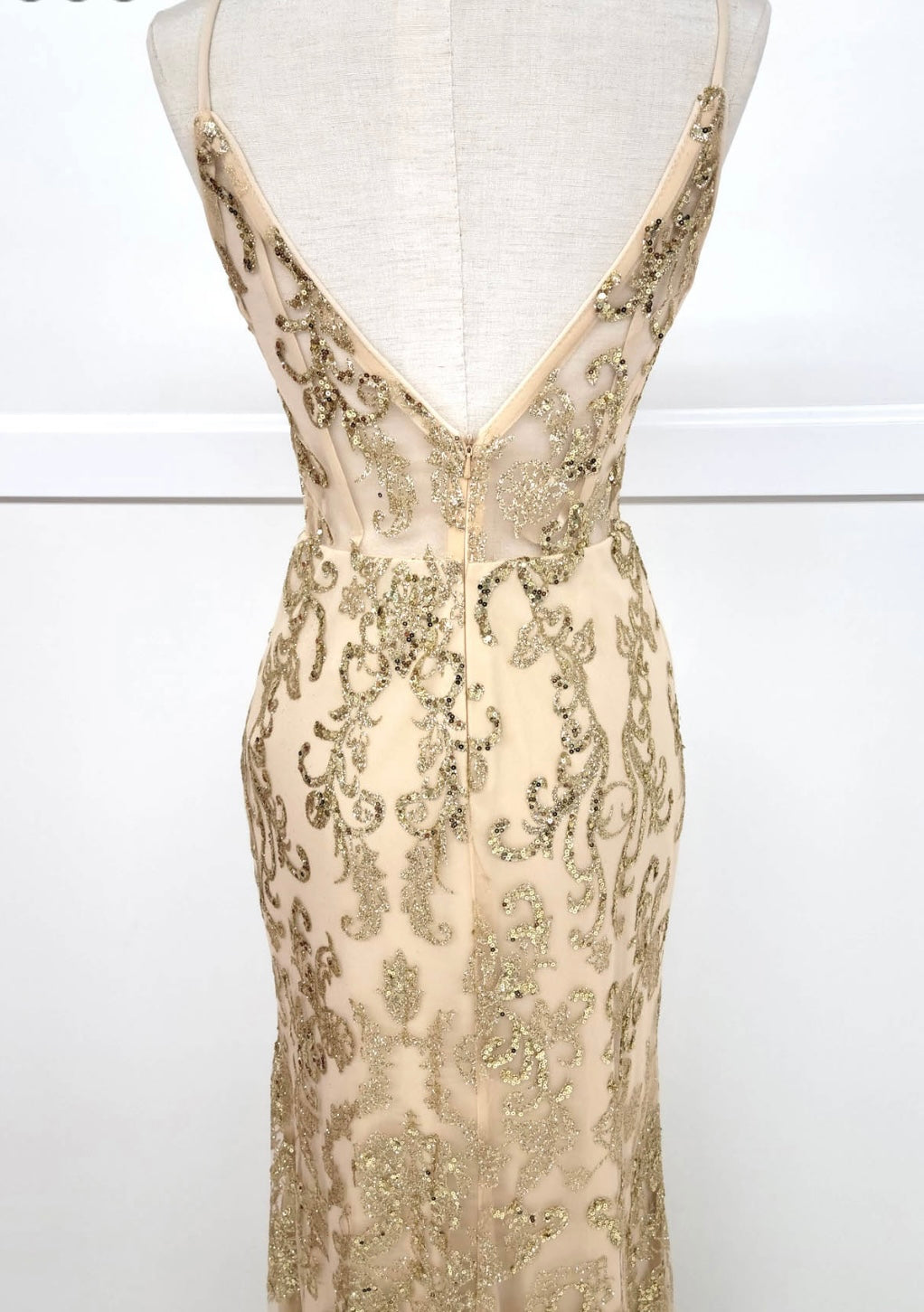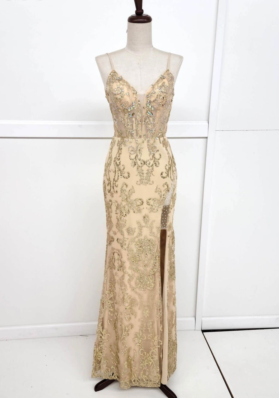 Turn heads in this glamorous nude evening gown by Chicas, style 4028. This fitted design features a sheer corset-style bodice with intricate gold beaded embroidery and dazzling rhinestone embellishments that catch the light beautifully. The delicate spaghetti straps and deep V neckline enhance the feminine silhouette, while the high slit adds a bold and elegant touch. Designed by Chicas, this gown is perfect for prom, pageants, or any formal affair where you want to shine.