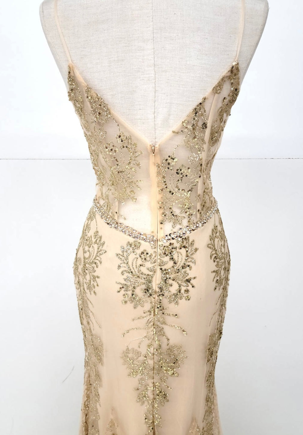 Radiate elegance in this stunning evening gown by Chicas, style 4030, designed by Chicas. This nude-toned dress features a fitted silhouette with a plunging V-neckline and delicate spaghetti straps. The bodice is richly adorned with intricate gold embroidery and shimmering sequins, flowing down into a gracefully embellished skirt. A jeweled waist detail adds a refined sparkle, enhancing the feminine silhouette. Perfect for formal events, galas, or special occasions where glamour is a must.