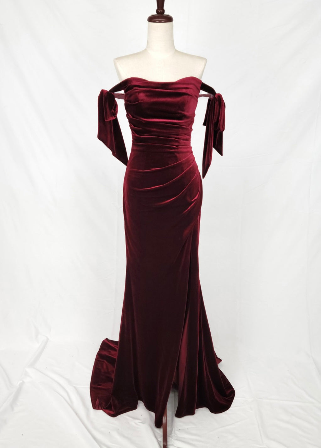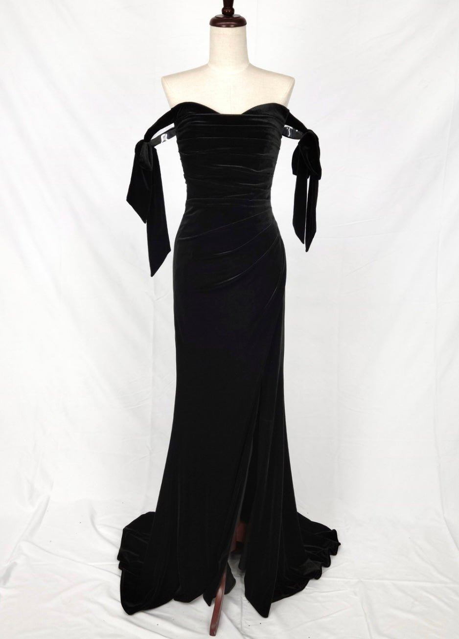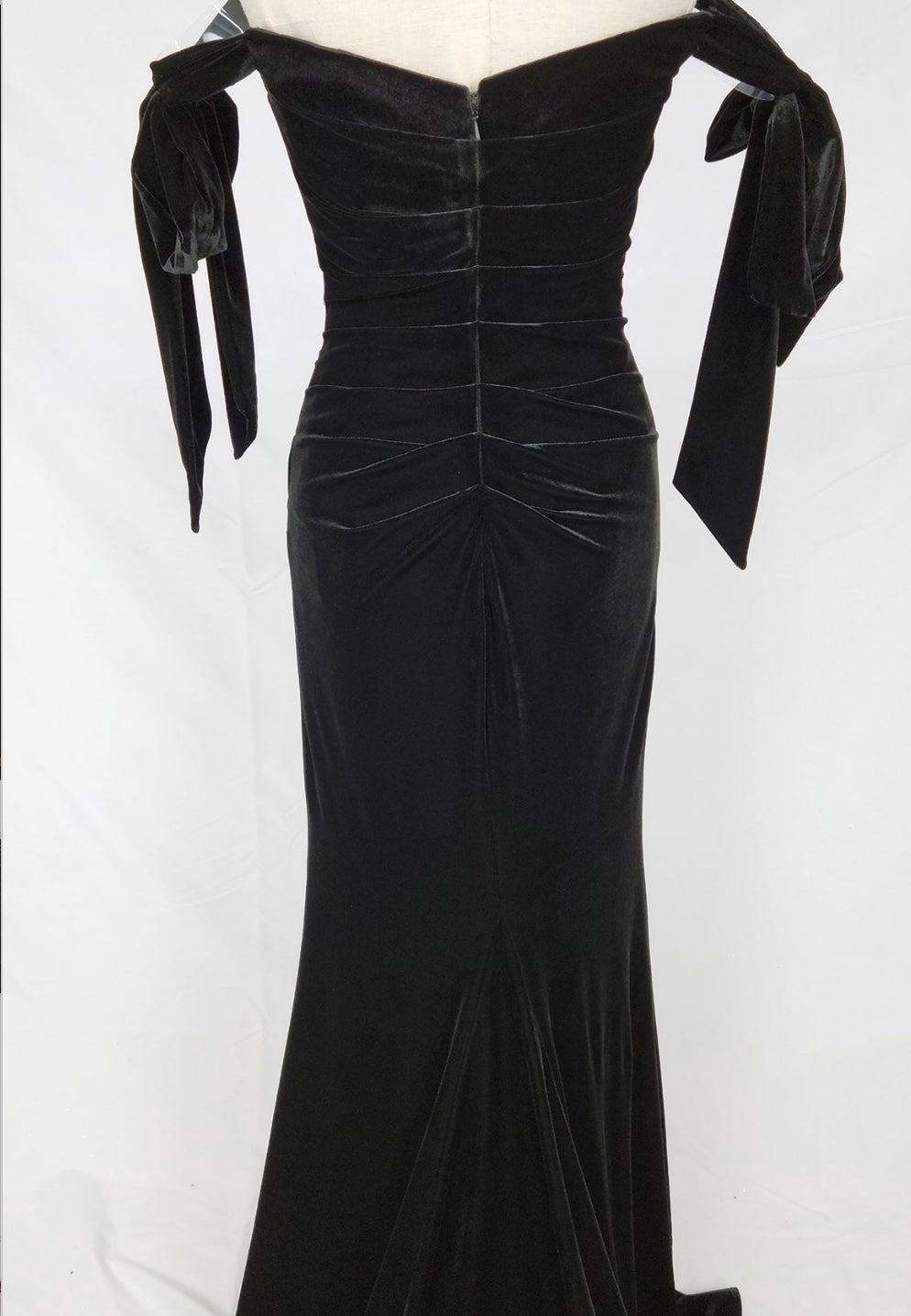 Step into timeless elegance with this stunning black velvet gown by Chicas, style 811, designed by Chicas. Featuring an off-the-shoulder neckline with charming velvet bows on each arm, this form-fitting dress showcases delicate ruching across the bodice and hips for a flattering silhouette. A subtle slit adds a touch of allure, while the flowing train completes this graceful and sophisticated evening look—perfect for formal occasions or black-tie events.