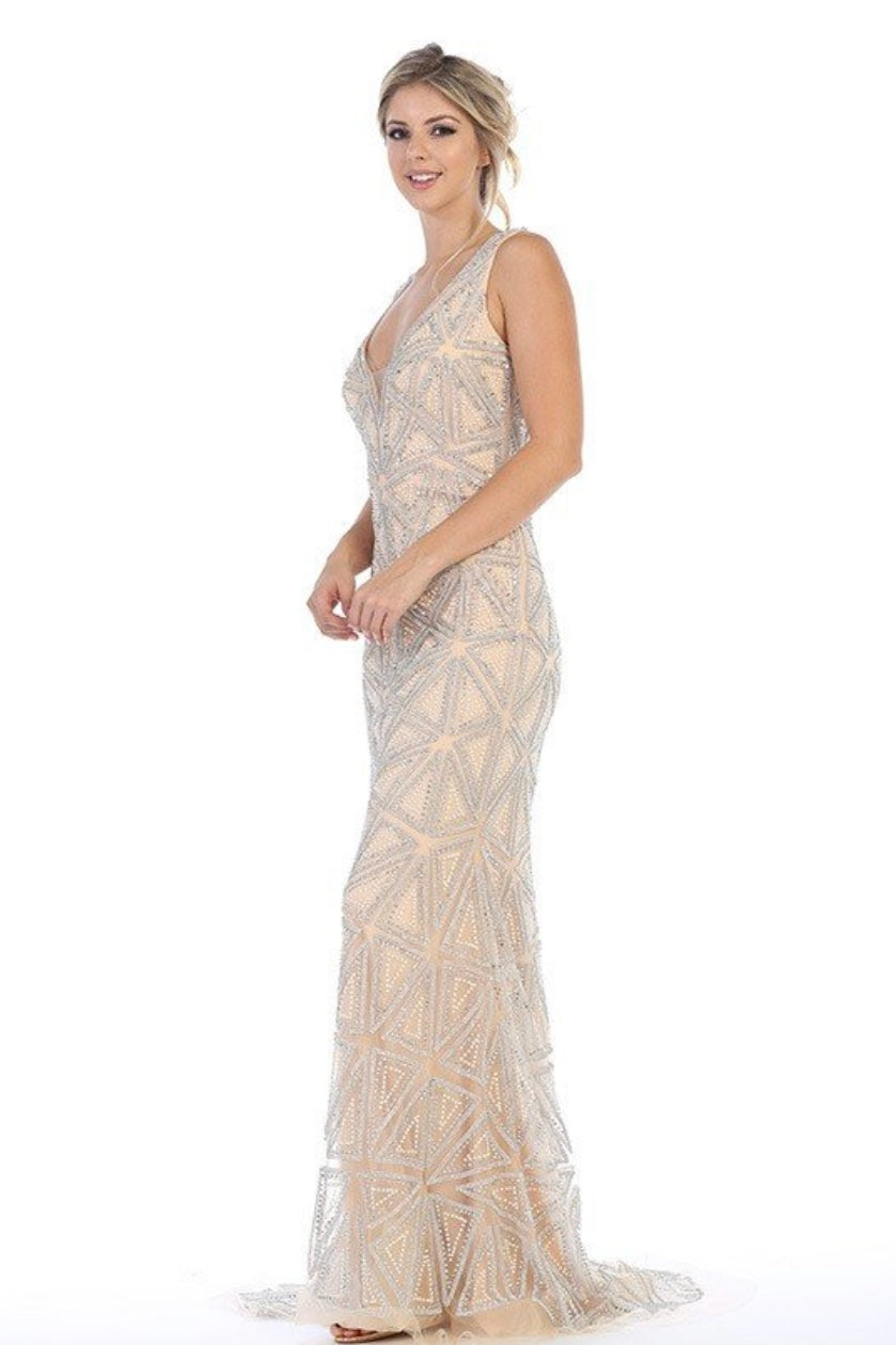 Make a dazzling entrance in this glamorous Chicas gown, style BT9011. Featuring a fitted silhouette, this dress is adorned with intricate geometric beadwork throughout, enhancing the modern and luxurious design. The plunging V-neckline and wide straps flatter the upper body, while the floor-length skirt hugs the curves and flares out gently for an elegant finish. Available in champagne and navy, this dress is perfect for formal evenings, galas, and red-carpet occasions.