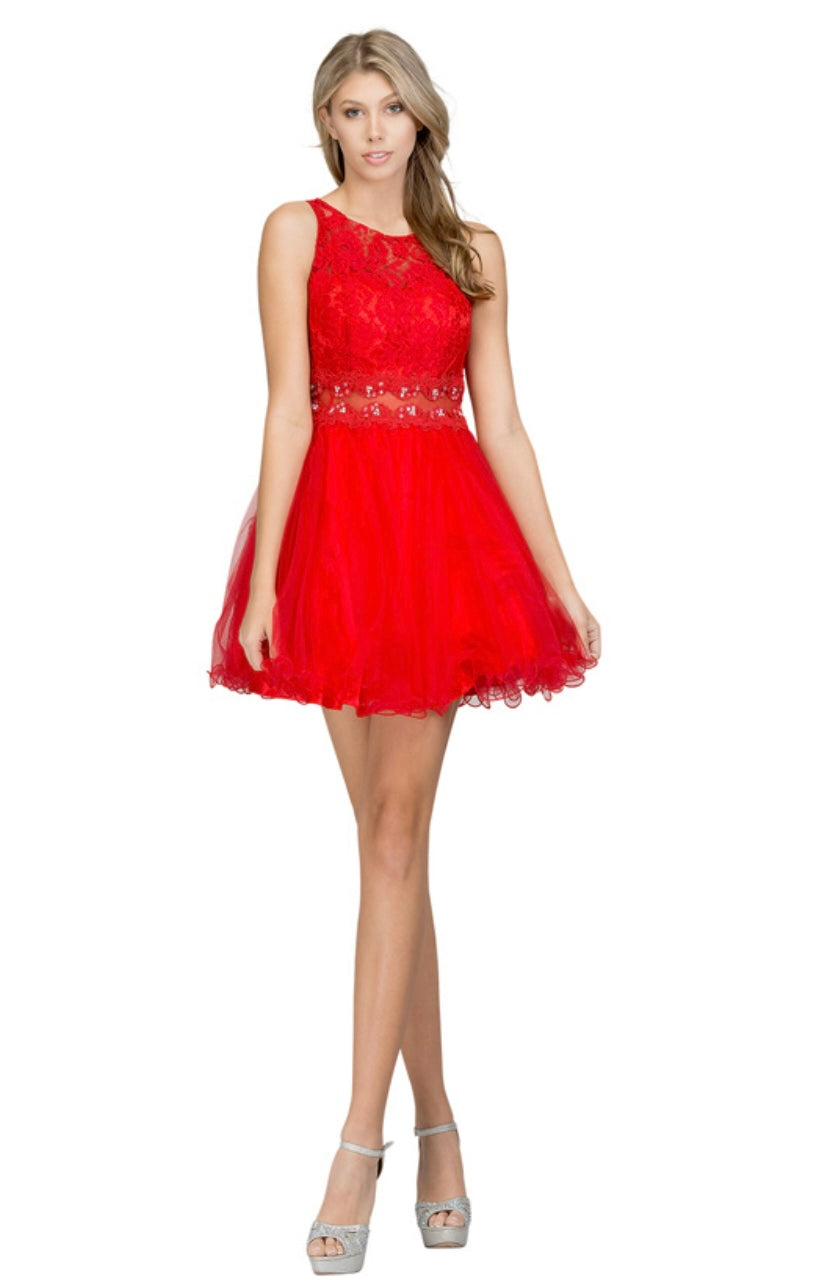 Turn heads with this charming short party dress by Chicas, style C1107. The sleeveless fitted lace bodice features a high illusion neckline and an elegant sheer waistband adorned with delicate beading. The playful tulle skirt flares out in soft layers, creating a fun and flirty silhouette perfect for special occasions. Available in colors: black, blush, burgundy, champagne, mint, pink, red, royal blue, silver, and white.