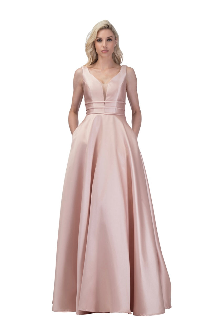 Elegance meets simplicity in this stunning evening gown by Chicas, style code C1522. Designed with a deep V-neckline and wide shoulder straps, this dress features a structured satin bodice and a flattering waistband that enhances the silhouette. The A-line skirt flows gracefully with box pleats for volume, while hidden side pockets add a touch of modern practicality. Crafted in smooth satin, this gown is ideal for formal events, weddings, and special occasions.