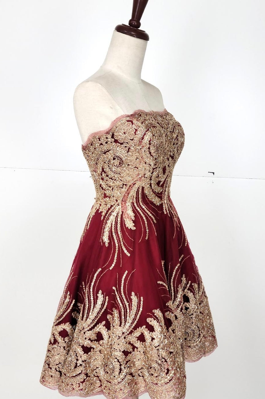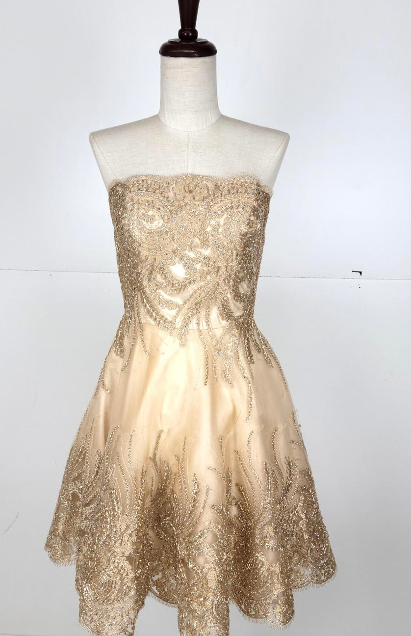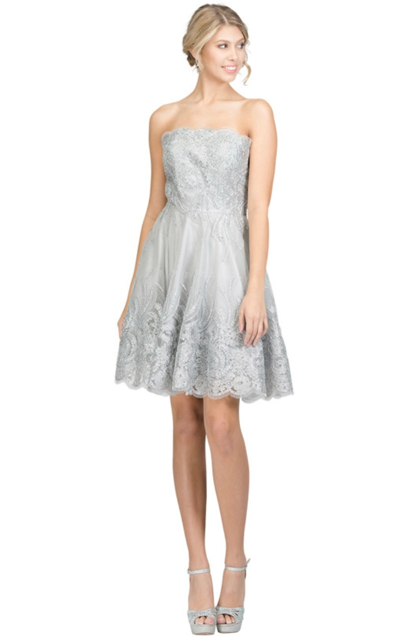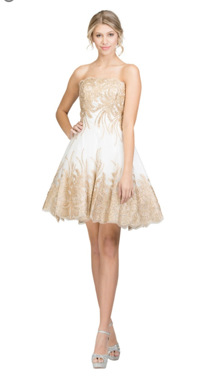 Make a statement in this stunning Chicas short strapless cocktail dress, style C1534. Designed with a flattering A-line silhouette, it features intricate gold embroidery that gracefully cascades from the bodice down to the hem. The sweetheart neckline adds a romantic touch, while the layered skirt adds volume and movement. Perfect for homecoming, graduation, or any special occasion, this dress is available in wine, champagne, white, silver, and royal blue.