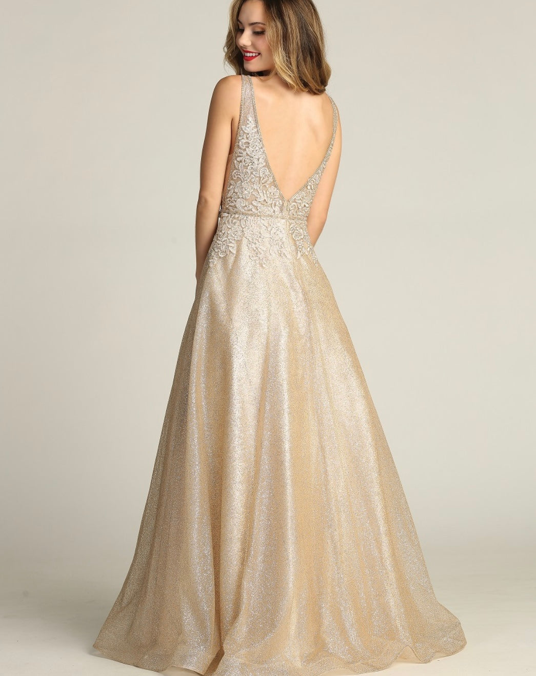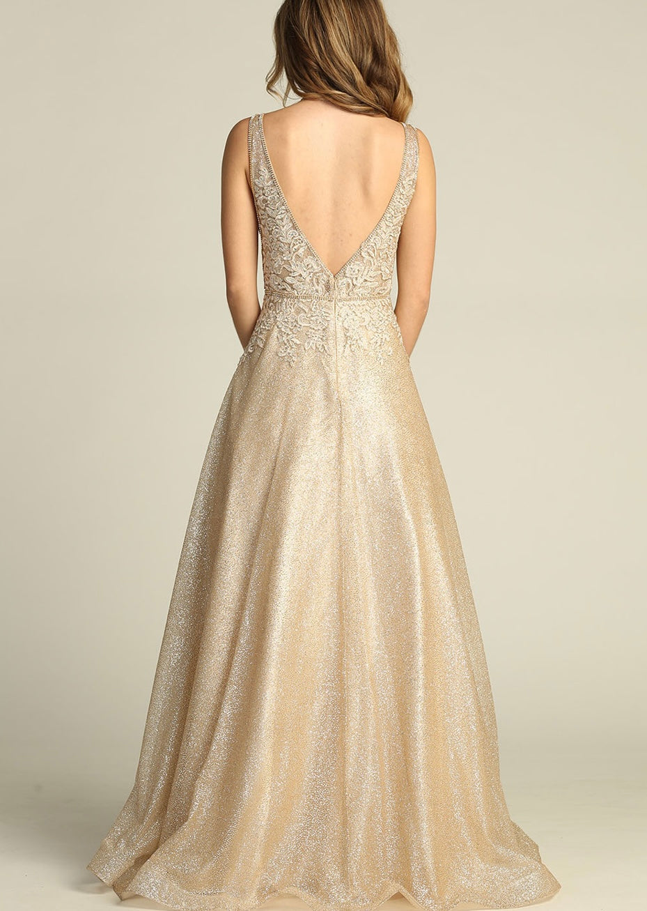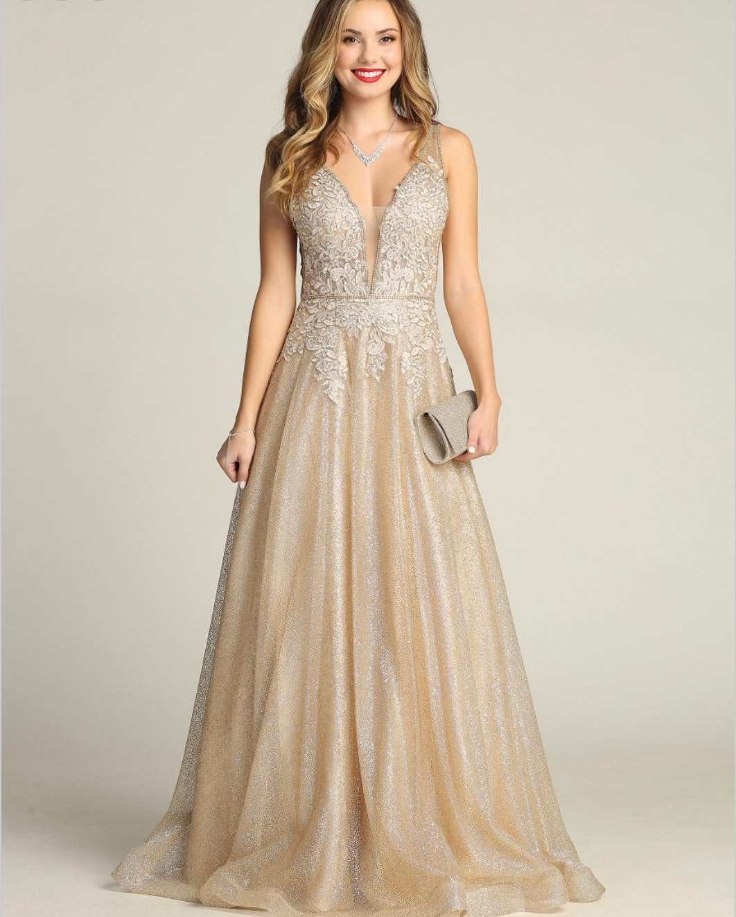 Radiate sophistication in this stunning A-line gown by Chicas, style C2425. Designed with a deep illusion V-neckline and delicate shoulder straps, the bodice features intricate lace embroidery and subtle beadwork that flows into a shimmering glitter skirt. A cinched waist enhances the silhouette, while the soft A-line shape adds graceful movement. Perfect for prom, galas, or any elegant evening, this gown is available in champagne and rose tones.