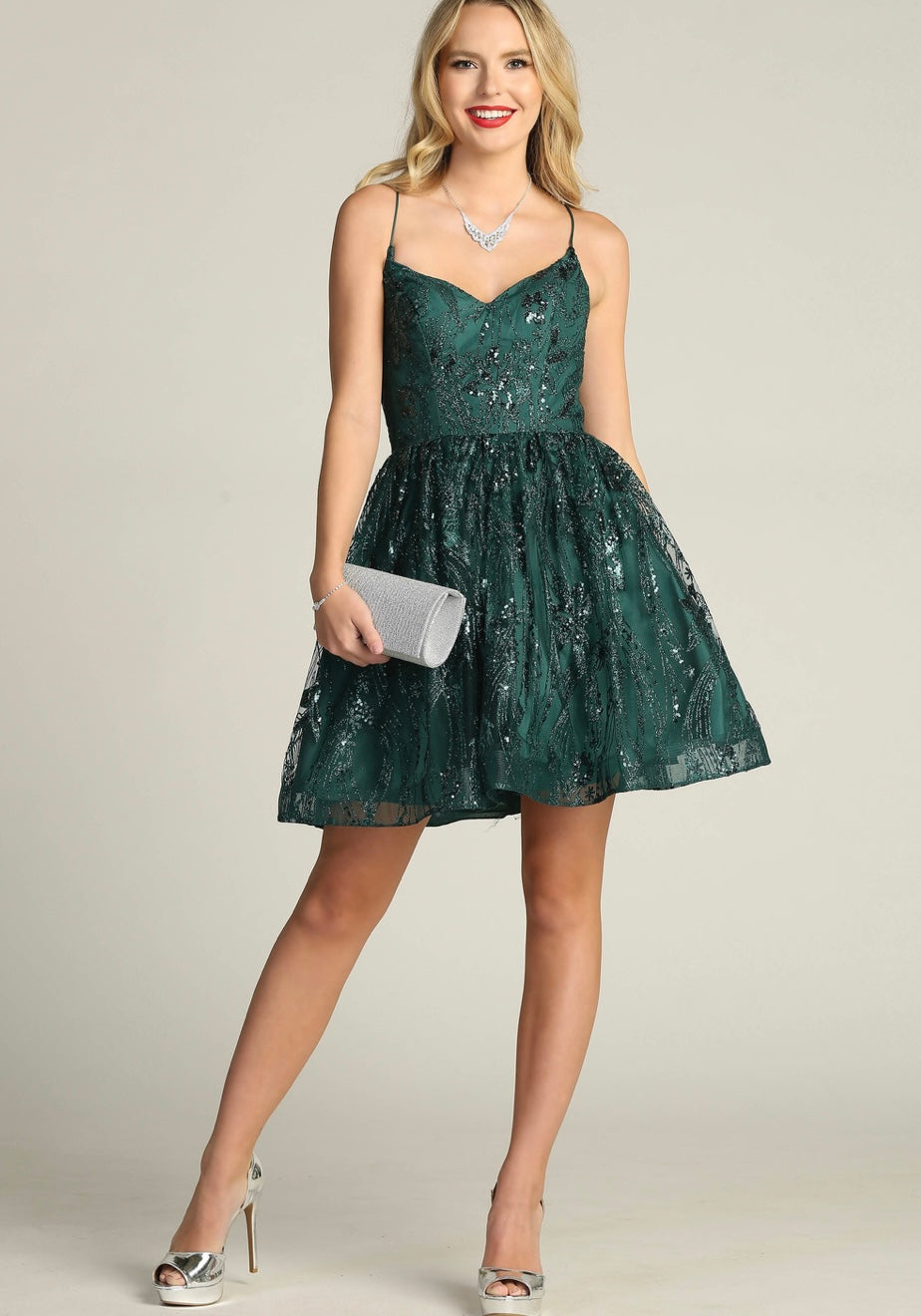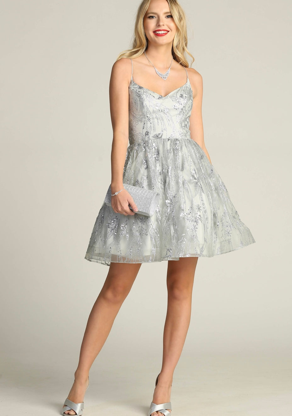 Chicas Design C317 is a dazzling short party dress that captures attention with its sparkling elegance. Featuring thin spaghetti straps and a sweetheart neckline, the fitted bodice is adorned with intricate sequin embroidery that continues down into the flared A-line skirt. The shimmering tulle overlay adds dimension and glamour, making it perfect for cocktail parties, graduations, or semi-formal events. Available in champagne, green, royal, and silver, this dress is designed to shine at any celebration.