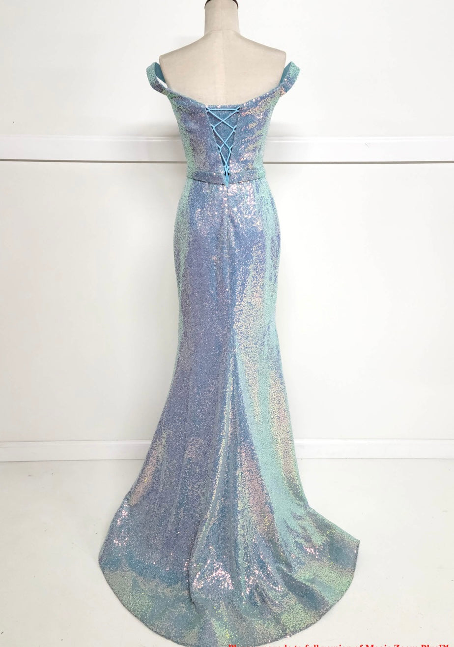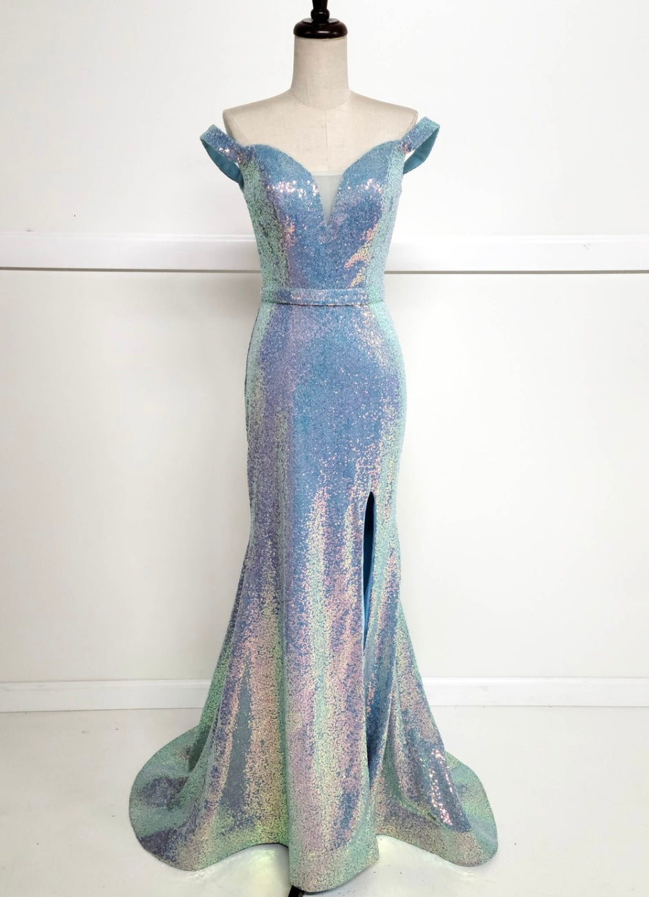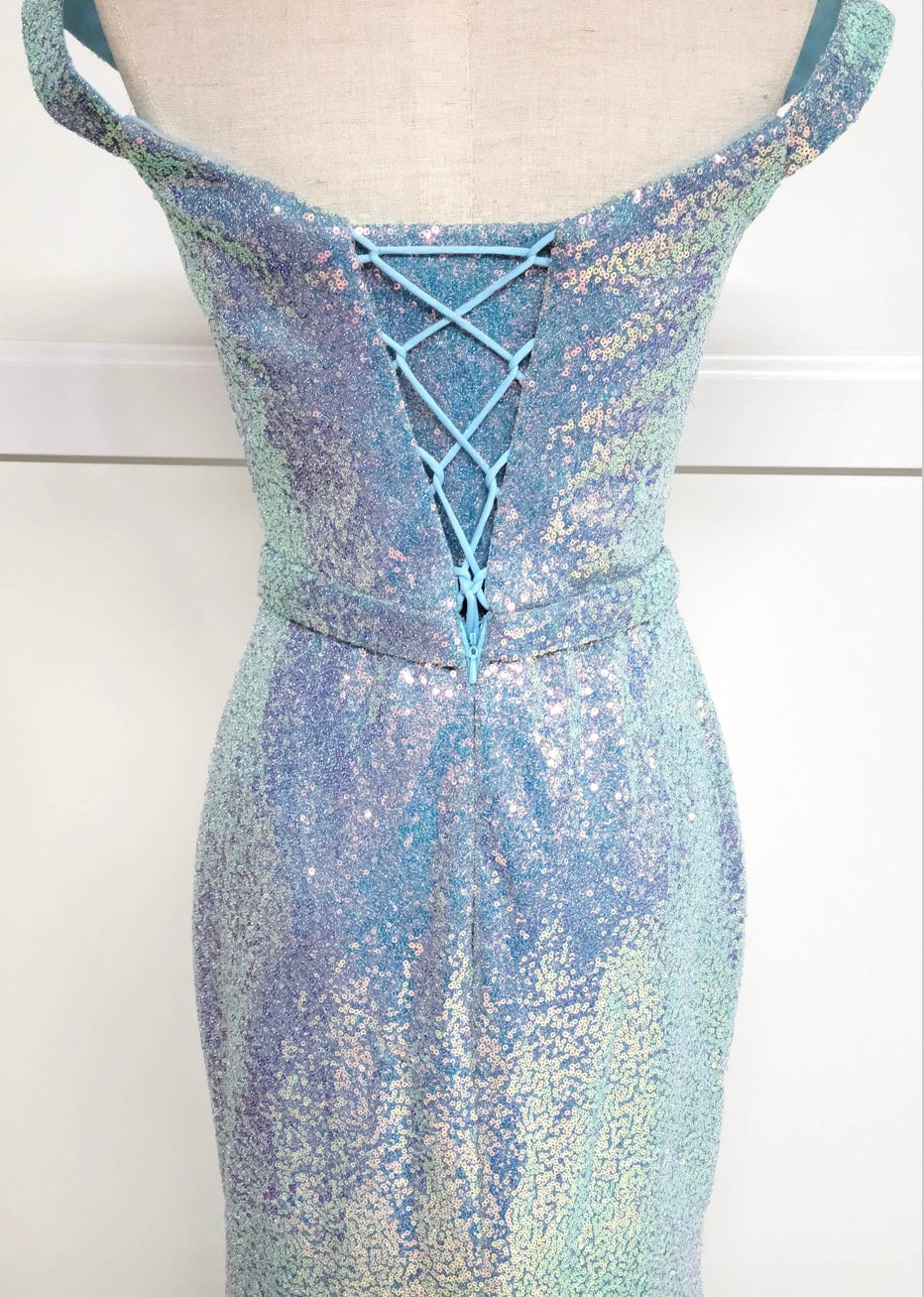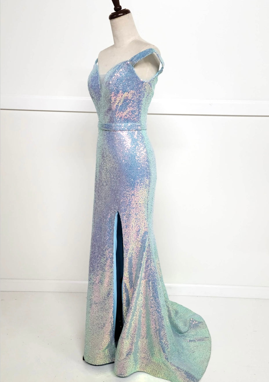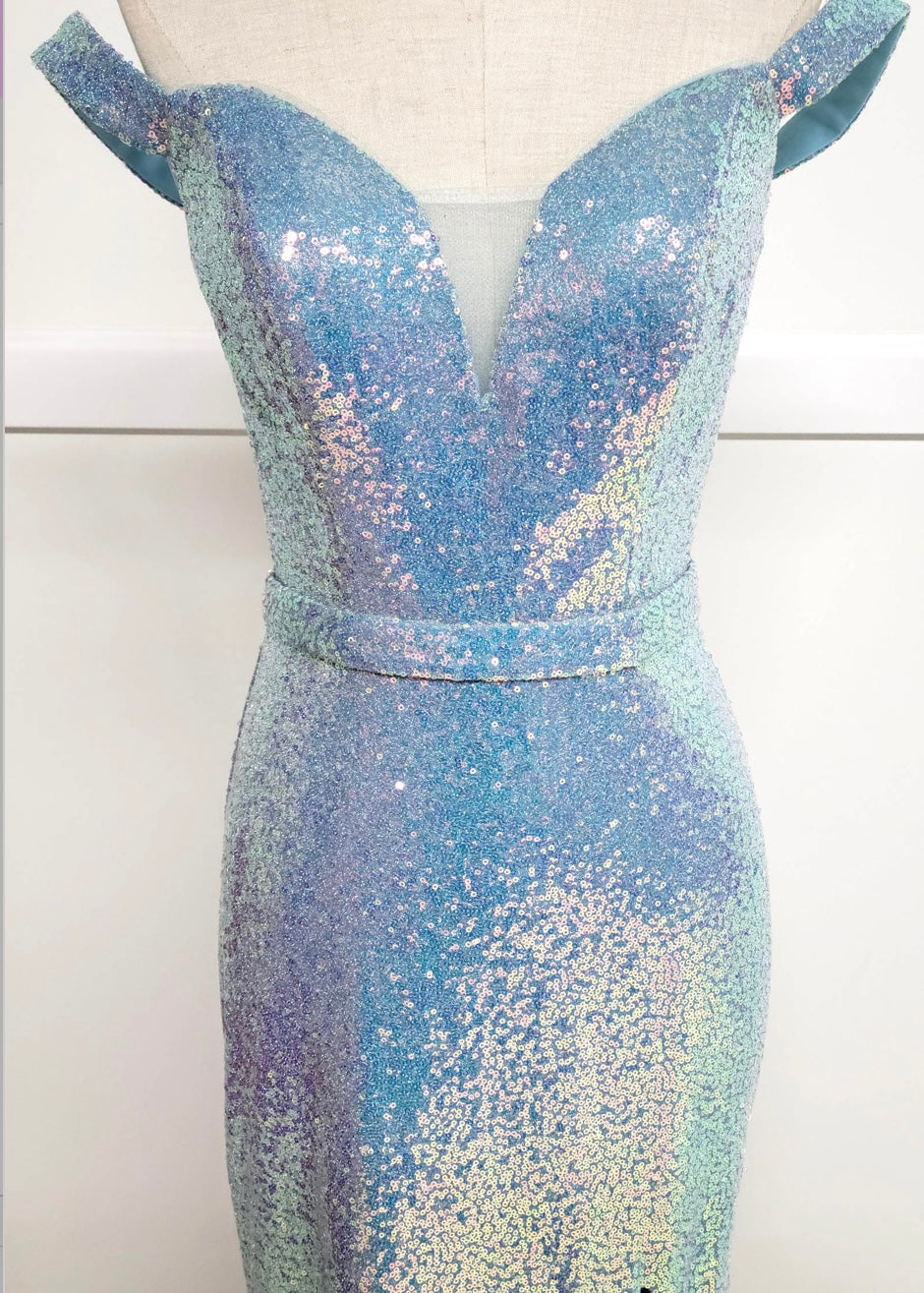 Sparkle with elegance in this shimmering fitted gown by Chicas, style C324. This off-the-shoulder design features a deep illusion neckline and a sleek, body-contouring silhouette covered in iridescent glitter fabric. A high front slit adds a touch of allure and movement, while the subtle train enhances the gown’s graceful finish. Perfect for prom, pageants, or formal evening events, this dress is available in blue, champagne, and lavender.