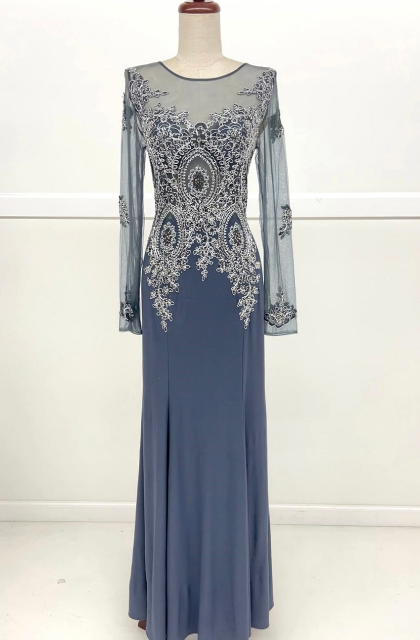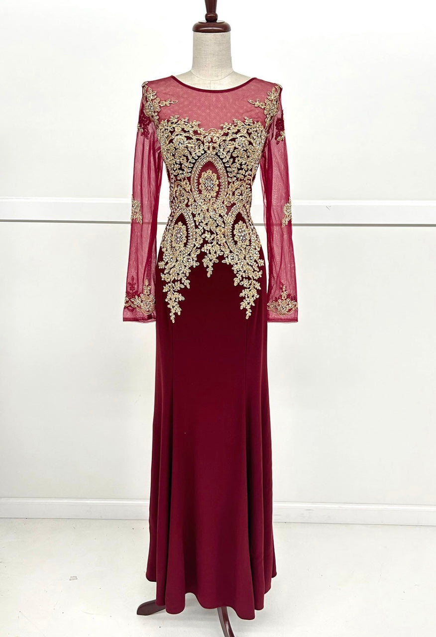 This gown from the brand Chicas, style code C3298, is an elegant long-sleeve evening dress featuring sheer mesh details on the bodice and sleeves. The top is richly adorned with intricate gold embroidery and beaded appliqués in a baroque-inspired pattern that adds sophistication and glamour. The sleek, floor-length skirt in a fitted mermaid silhouette complements the ornate top with a smooth, flowing finish. Perfect for formal events, this dress is available in wine and gray colors.