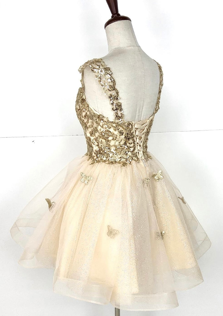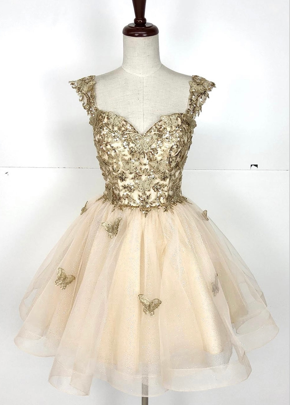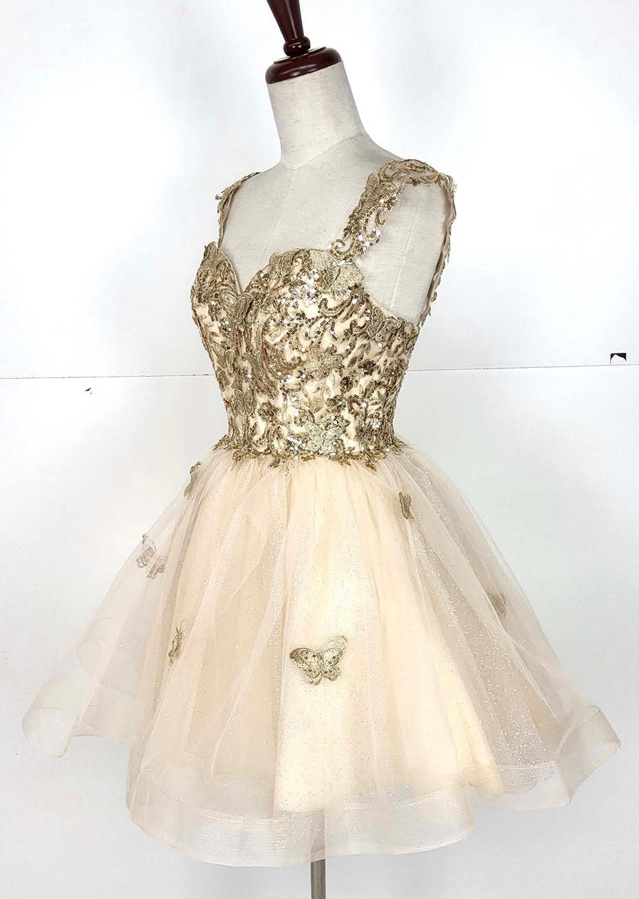 Make a fairytale entrance in this enchanting short dress by Chicas, style C330. Featuring a structured sweetheart neckline bodice richly adorned with intricate gold lace appliqués and sparkling embellishments, this dress captures elegance with a whimsical twist. Delicate butterfly accents are scattered along the soft, layered tulle skirt, adding a touch of fantasy and movement. The flattering A-line silhouette enhances the waist, making it perfect for quinceañeras, prom, or special occasions. Available in blush, champagne, lilac, off white, red, sage, and silver.
