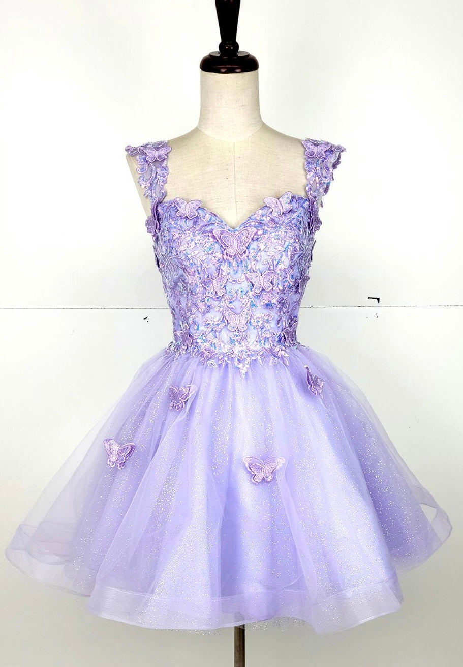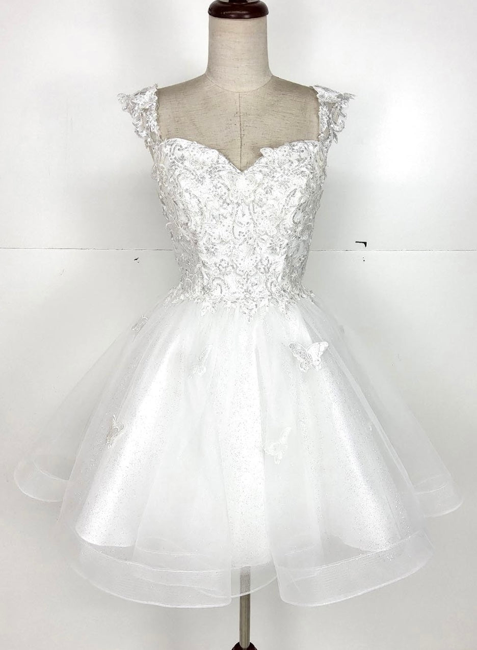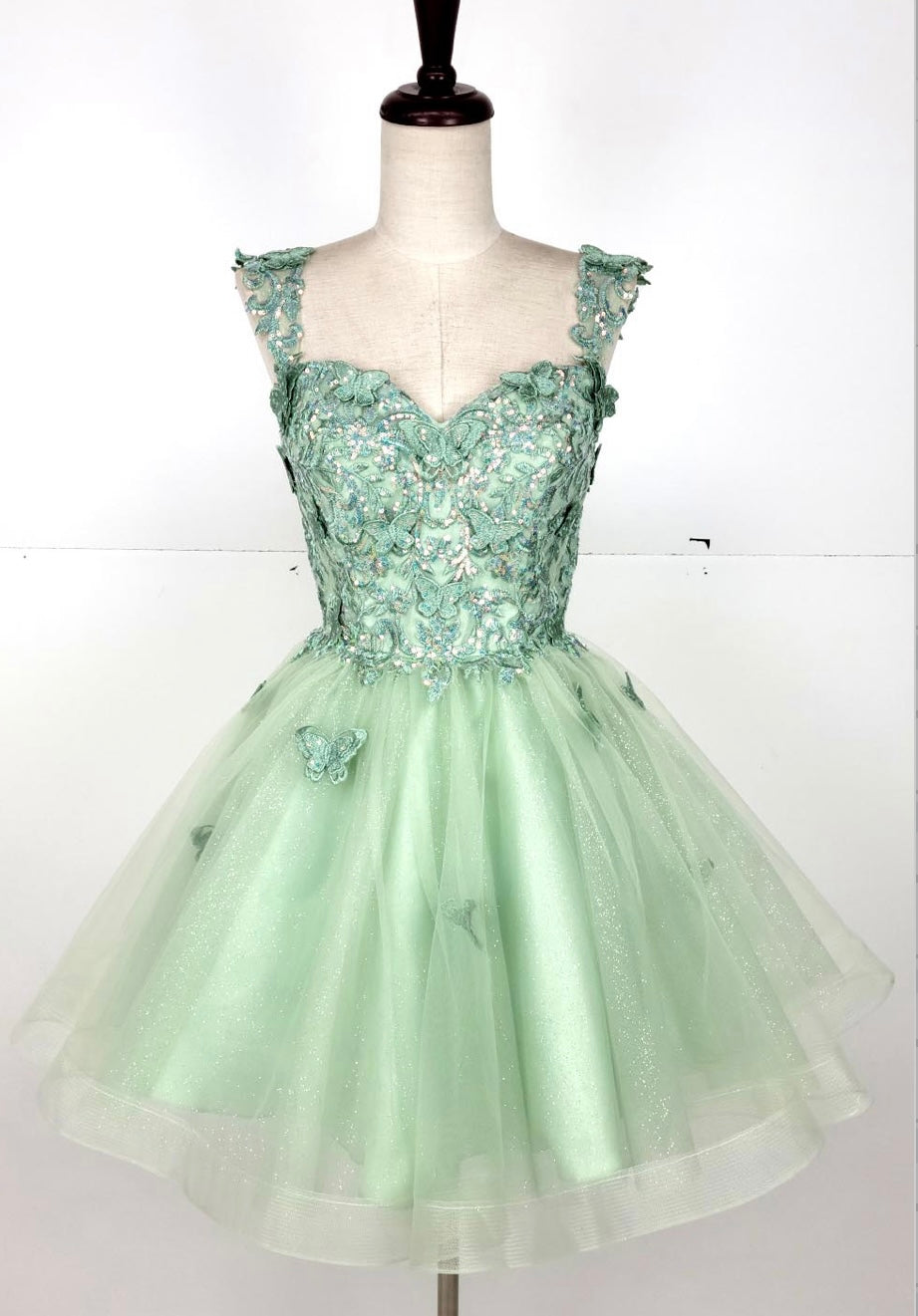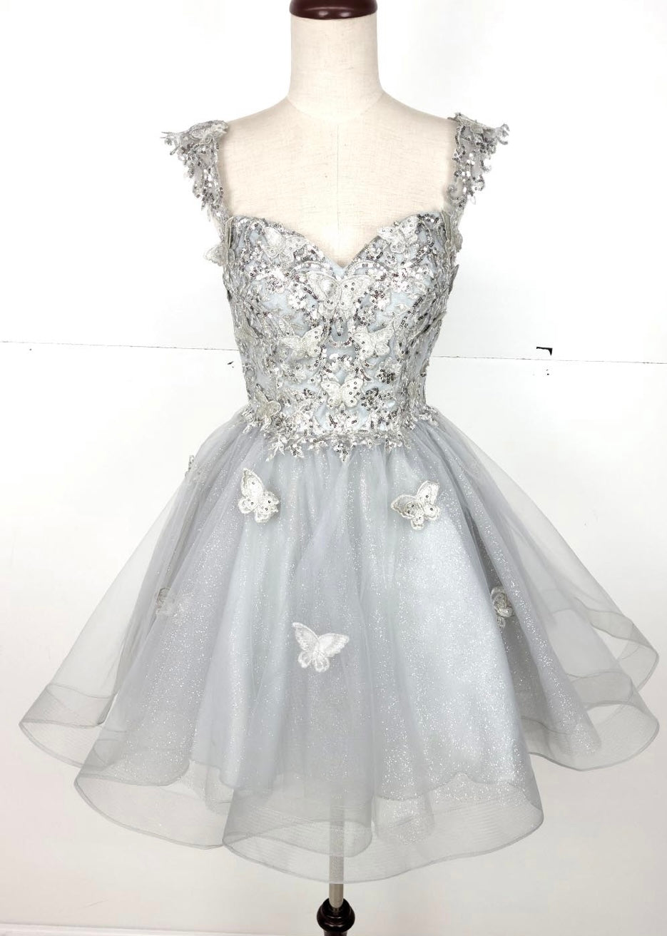 Make a fairytale entrance in this enchanting short dress by Chicas, style C330. Featuring a structured sweetheart neckline bodice richly adorned with intricate gold lace appliqués and sparkling embellishments, this dress captures elegance with a whimsical twist. Delicate butterfly accents are scattered along the soft, layered tulle skirt, adding a touch of fantasy and movement. The flattering A-line silhouette enhances the waist, making it perfect for quinceañeras, prom, or special occasions. Available in blush, champagne, lilac, off white, red, sage, and silver.