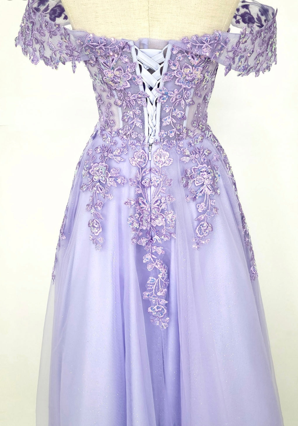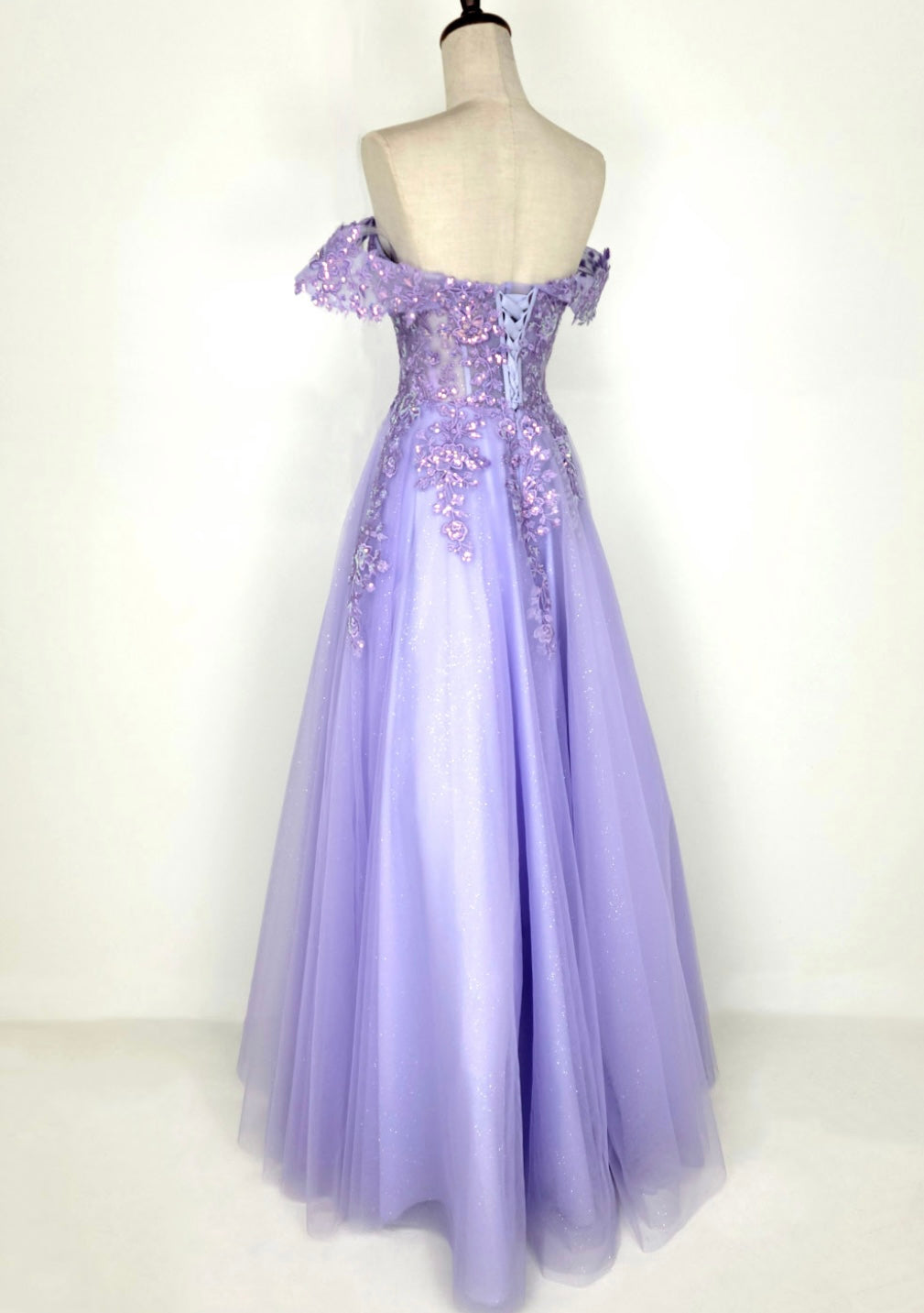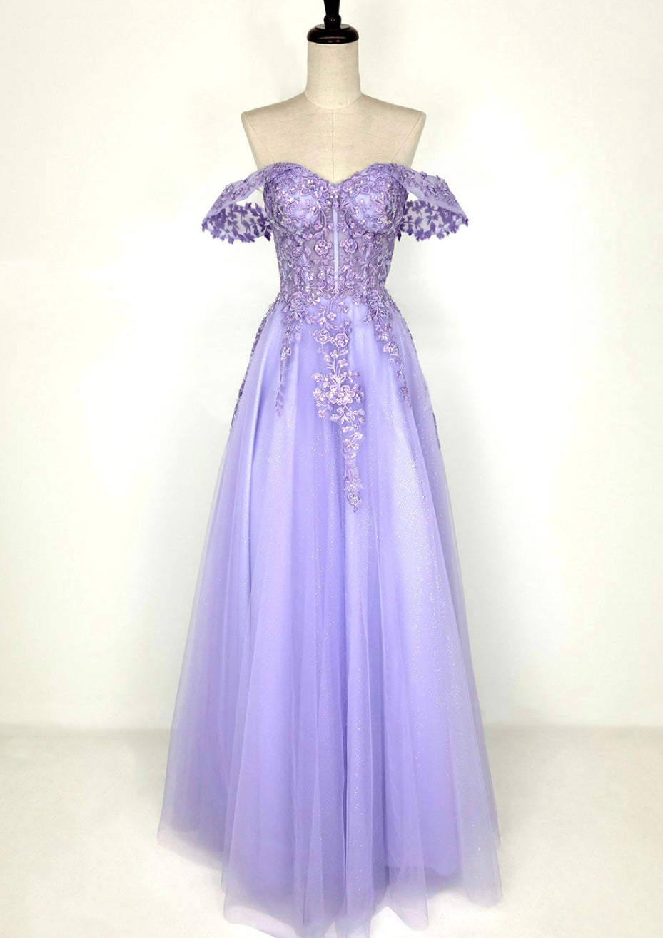 Radiating elegance and charm, this lavender gown by Chicas, style C335, designed by Chicas, features an off-the-shoulder sweetheart neckline with delicately draped lace sleeves. The fitted bodice is adorned with floral appliqué and intricate beading, adding a romantic touch. A soft, flowing tulle skirt sparkles subtly with glitter accents, creating a graceful and dreamy silhouette perfect for formal events or quinceañeras.