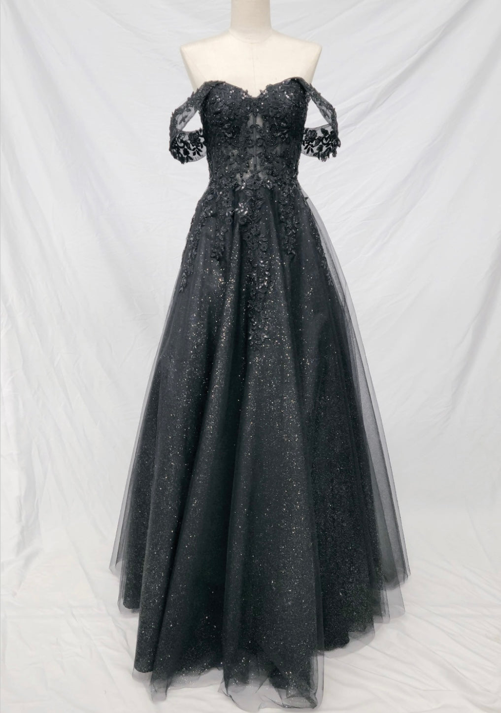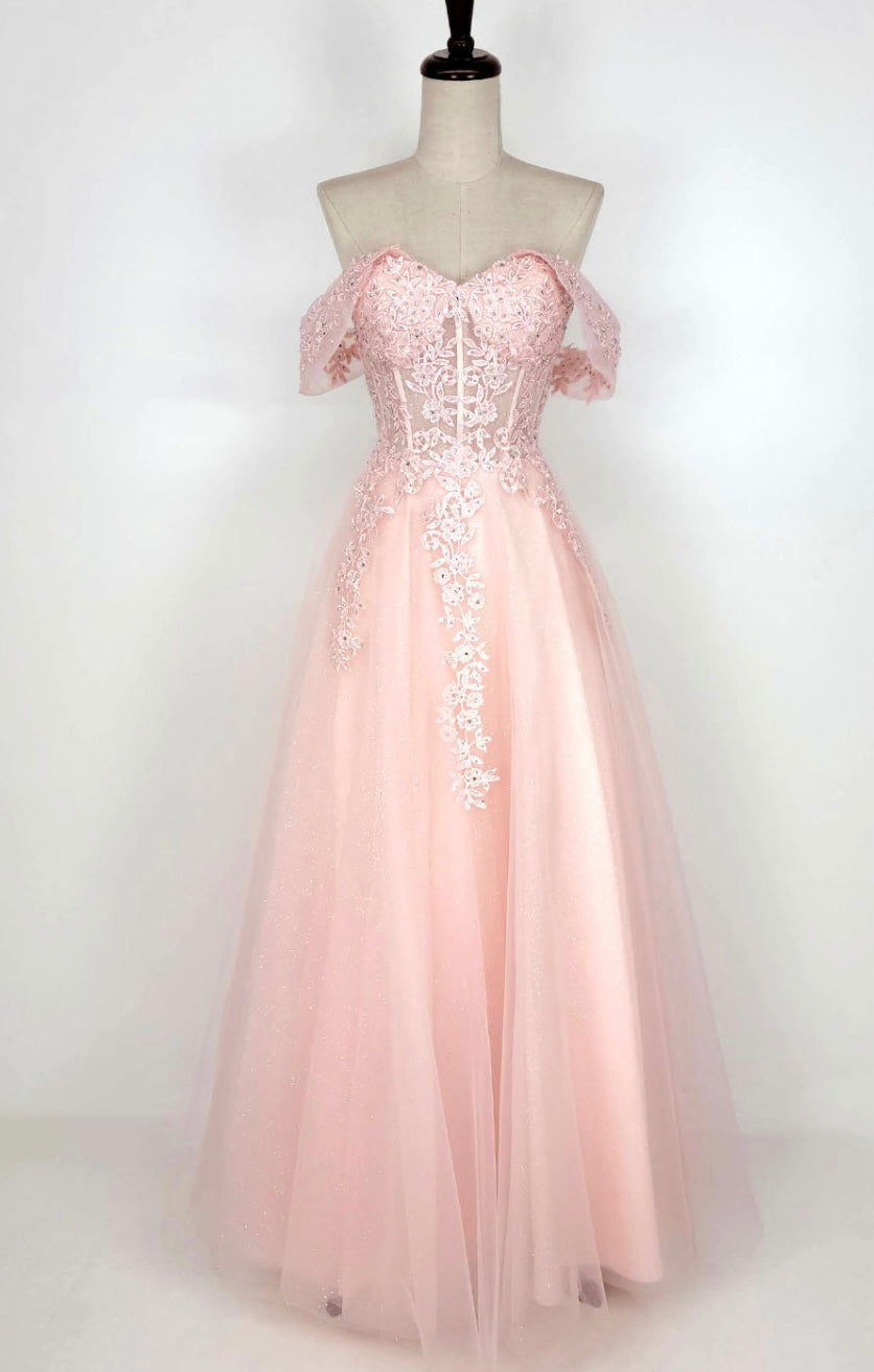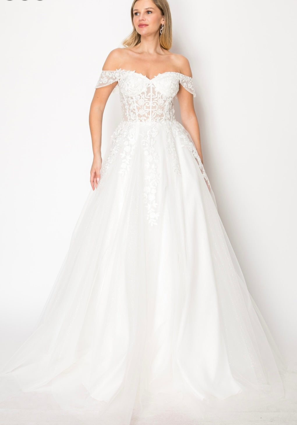 Radiate timeless charm in this romantic off-the-shoulder gown by Chicas, style C336. Featuring a structured corset bodice with delicate floral lace appliqués and a subtle sweetheart neckline, this dress enhances your natural elegance. The flowing A-line skirt is made of soft tulle that glides gracefully with every step. Available in a wide range of colors including black, blush, lilac, off white, perry blue, red, and sage, this gown is perfect for prom, bridesmaids, or any special occasion.