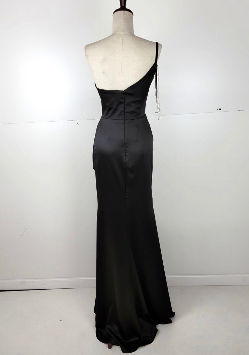 Make a statement in this sleek and modern black evening gown by Chicas, style C338, designed by Chicas. This one-shoulder satin dress features a dramatic asymmetrical neckline adorned with dazzling rhinestone embellishments and a cascading crystal fringe. The figure-hugging silhouette is enhanced with elegant draping at the waist, offering a flattering and sophisticated look perfect for formal occasions or red-carpet events.