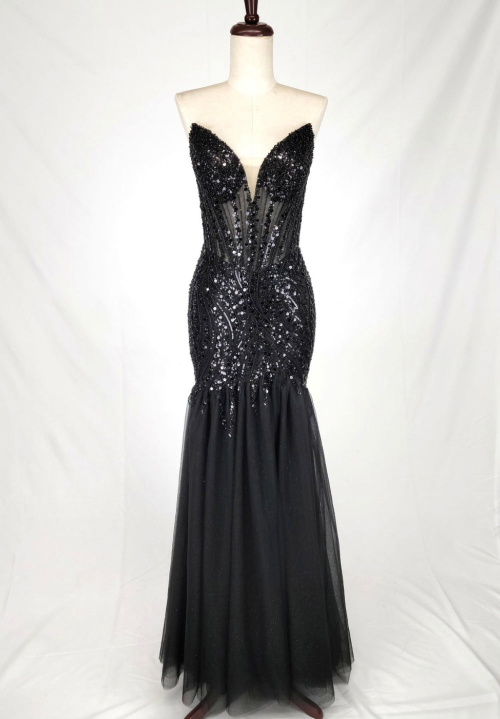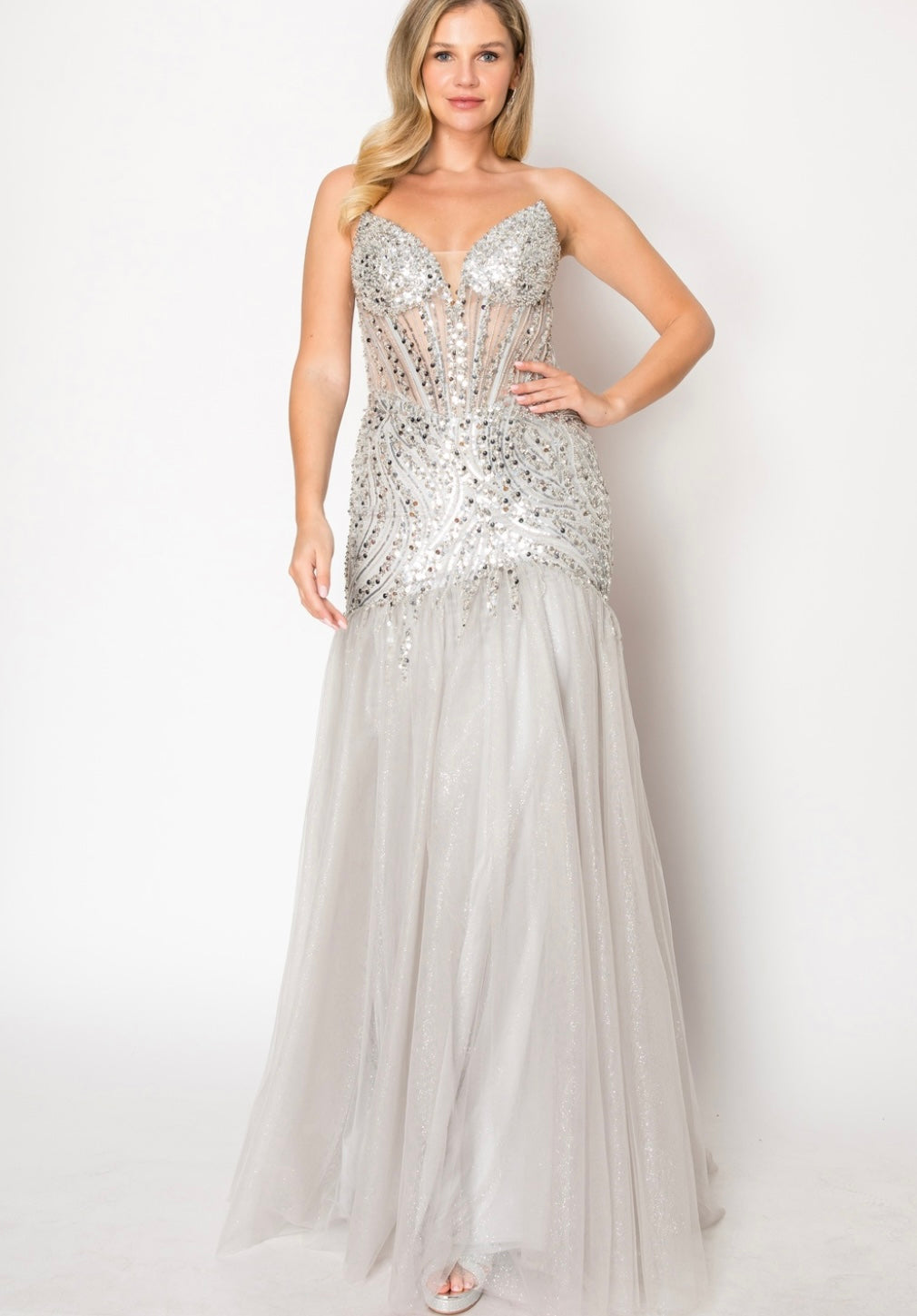 Ignite the room in this show-stopping red gown by Chicas, style C345. This strapless design features a sweetheart neckline and a corset-style bodice adorned with radiant red sequins and beading arranged in a sculpting, figure-enhancing pattern. The fitted silhouette flares into a flowing tulle skirt, adding drama and elegance to every step. Perfect for proms, galas, or formal events, this gown is designed to make a lasting impression with its bold color and dazzling detail.