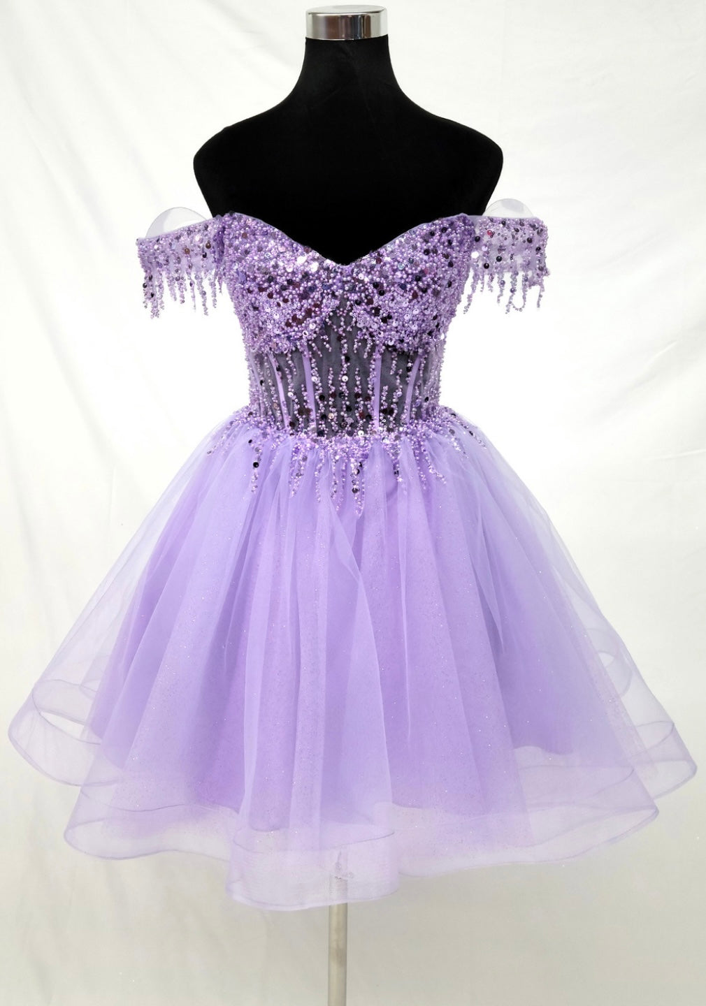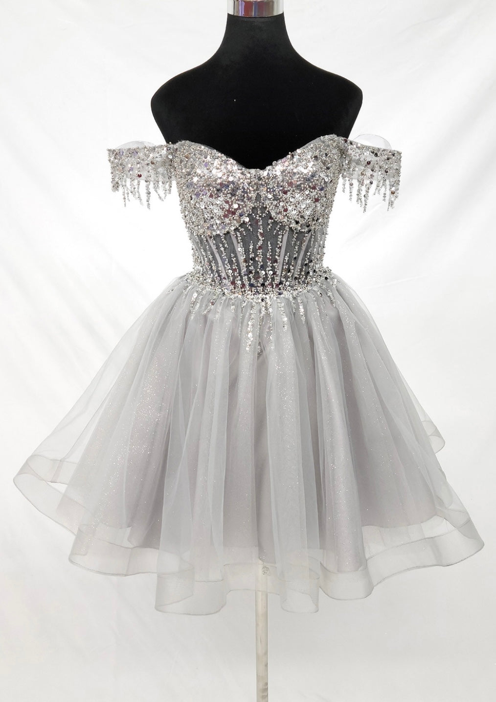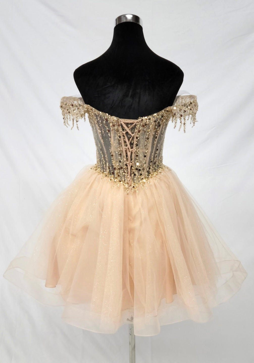 Radiate glamour in this stunning short dress by Chicas, style C356. This off-the-shoulder design features a fully sequined sweetheart bodice with dramatic hanging bead accents and a sheer corset-style waist that adds definition and elegance. The layered tulle skirt in a soft champagne hue brings volume and sparkle to every step. Designed by Chicas, this dazzling mini dress is ideal for homecoming, parties, or any special occasion that calls for a bold and sophisticated statement.