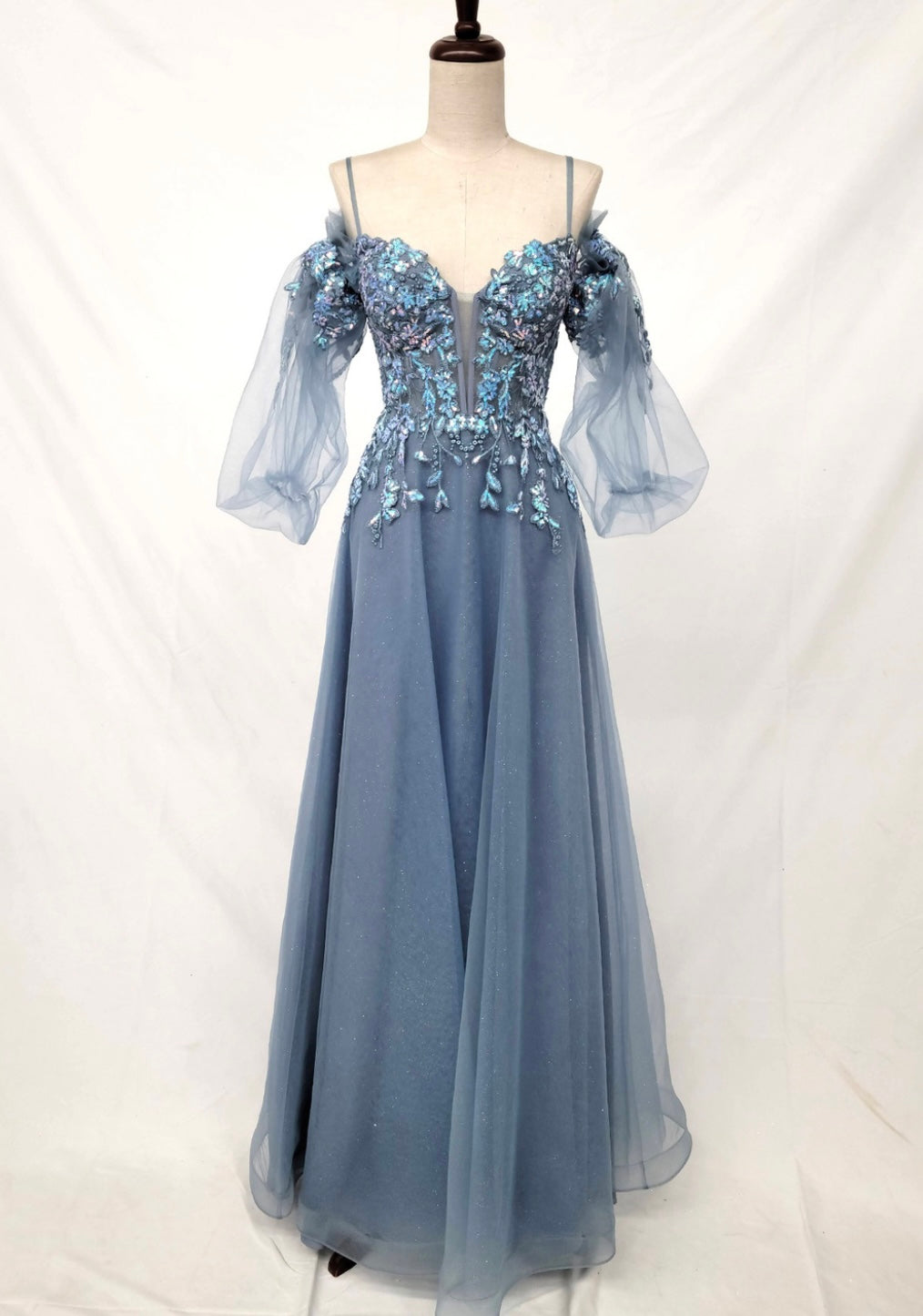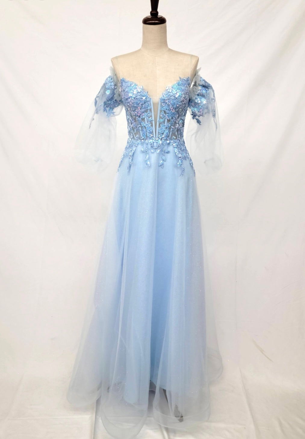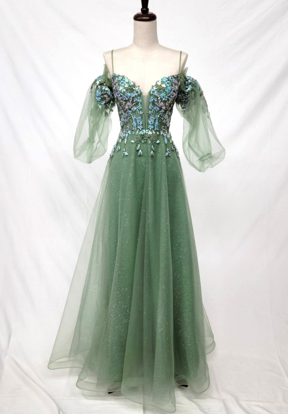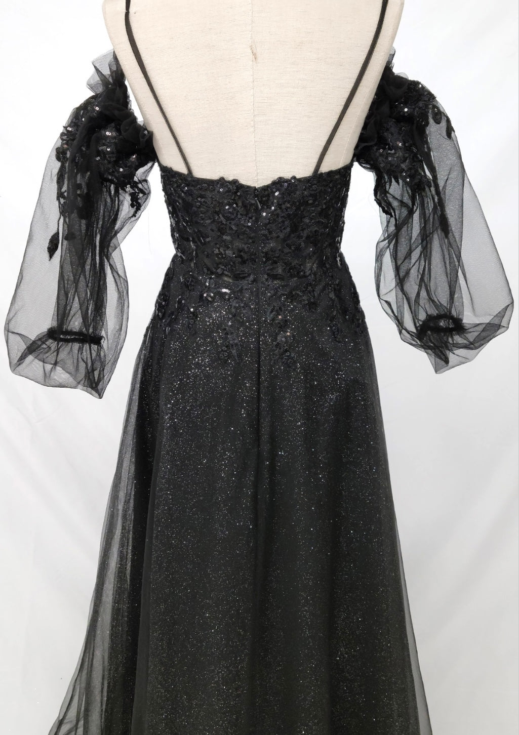 Turn heads in this enchanting black evening gown by Chicas, style C358. This off-the-shoulder design features sheer puffed sleeves and delicate spaghetti straps for a romantic and modern look. The fitted bodice is adorned with floral appliqués and subtle beading, leading into a glittery tulle A-line skirt that flows effortlessly to the floor. Designed by Chicas, this gown blends ethereal elegance with striking sophistication, perfect for galas, formal events, or prom nights.