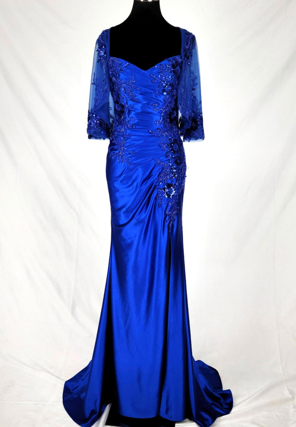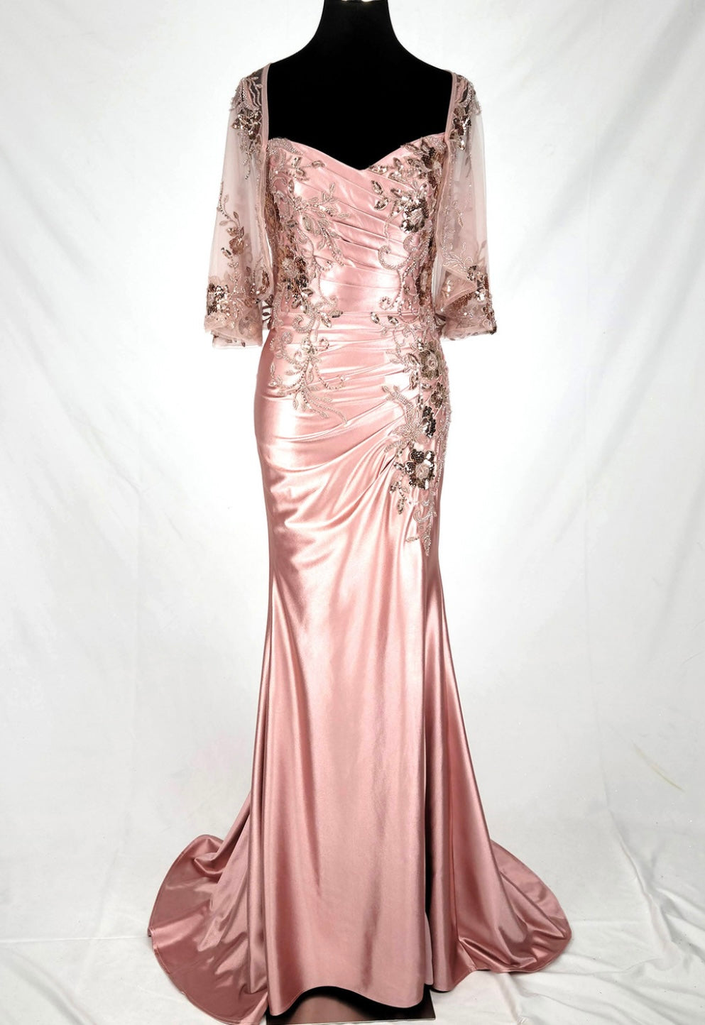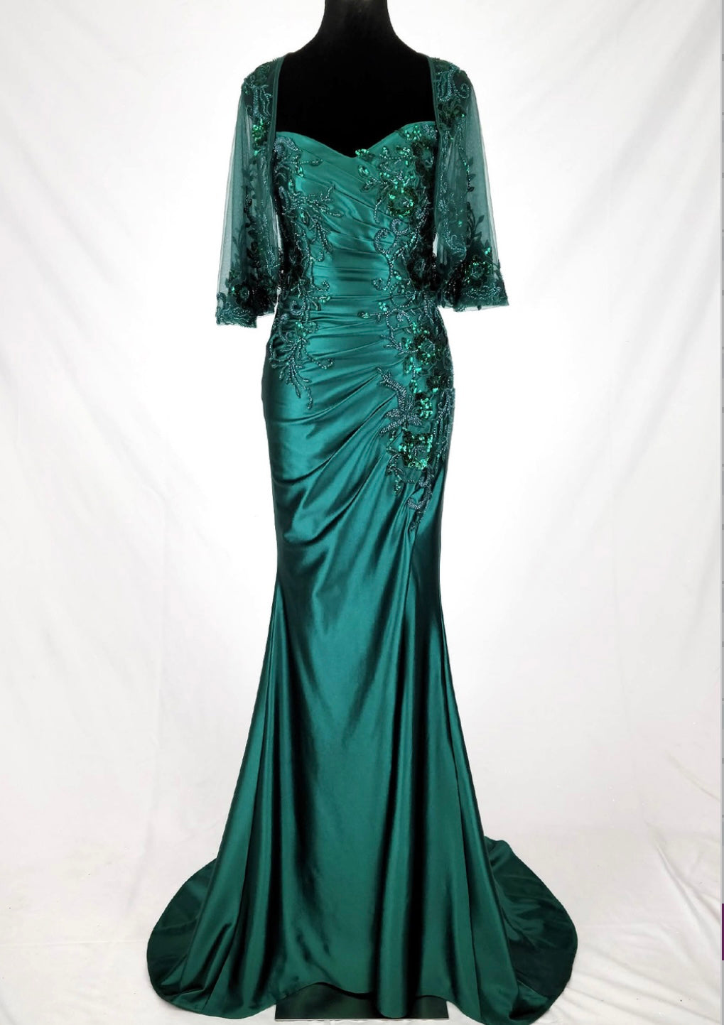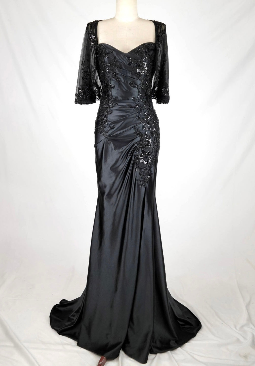 Timeless and elegant, this black evening gown by Chicas, style C364, is a sophisticated choice for formal occasions. The dress features a softly draped sweetheart neckline with delicate ruching along the bodice, creating a flattering silhouette. Sheer three-quarter length sleeves are adorned with sparkling black sequins and embroidery that complement the embellished appliqués cascading down the gown. The luxurious satin fabric flows into a graceful, floor-length skirt with a subtle train, making it ideal for mothers of the bride, evening galas, or special ceremonies.