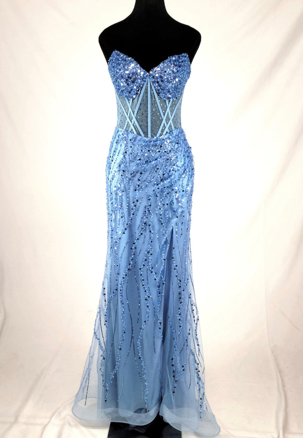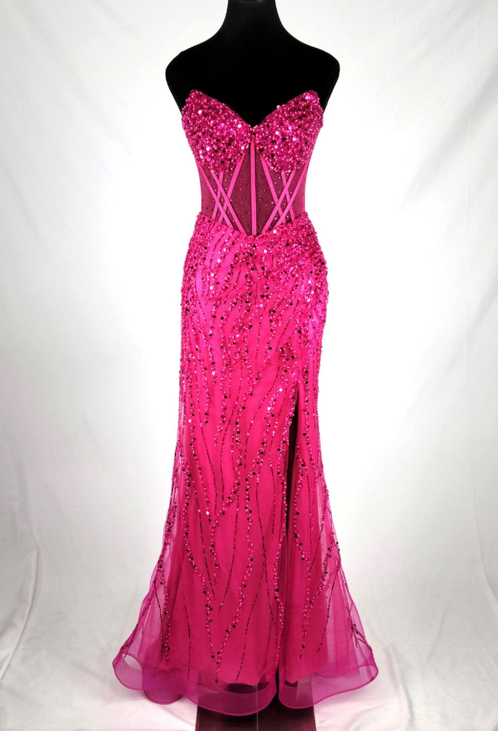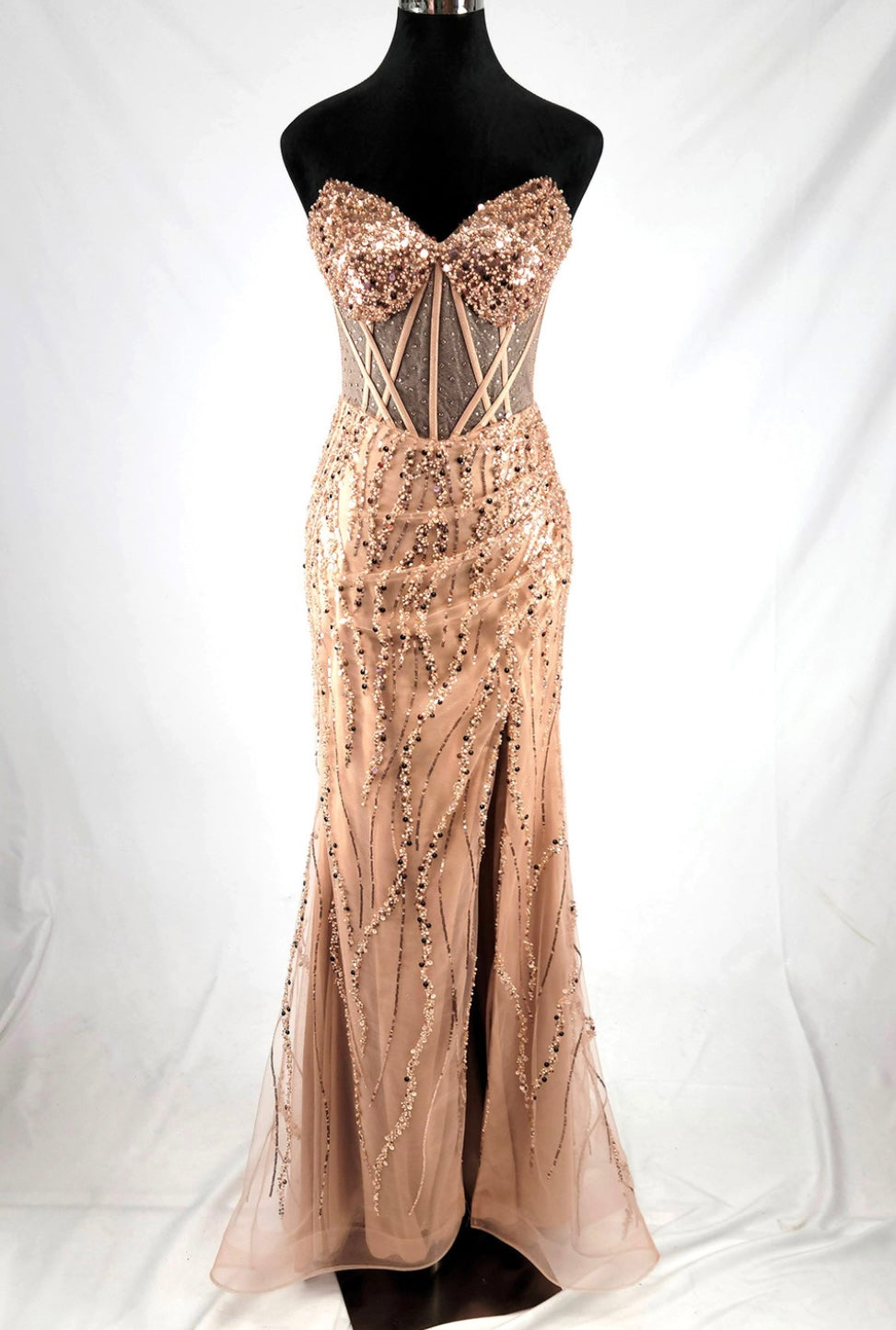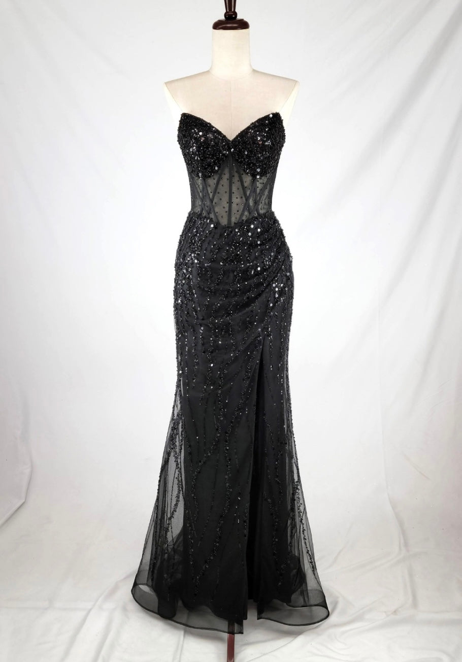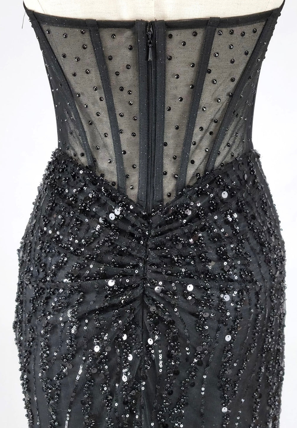 Dramatic and alluring, this black strapless evening gown by Chicas, style C366, is designed to captivate. The sweetheart neckline enhances the bust, while the sheer corset-style bodice with boning detail adds structure and seduction. Covered in shimmering black sequins and beadwork, the fitted silhouette flatters the figure and flows into a slightly flared hem with a subtle front slit for ease of movement. Ideal for formal galas, red carpet events, or any night where sophistication and glamour are essential.