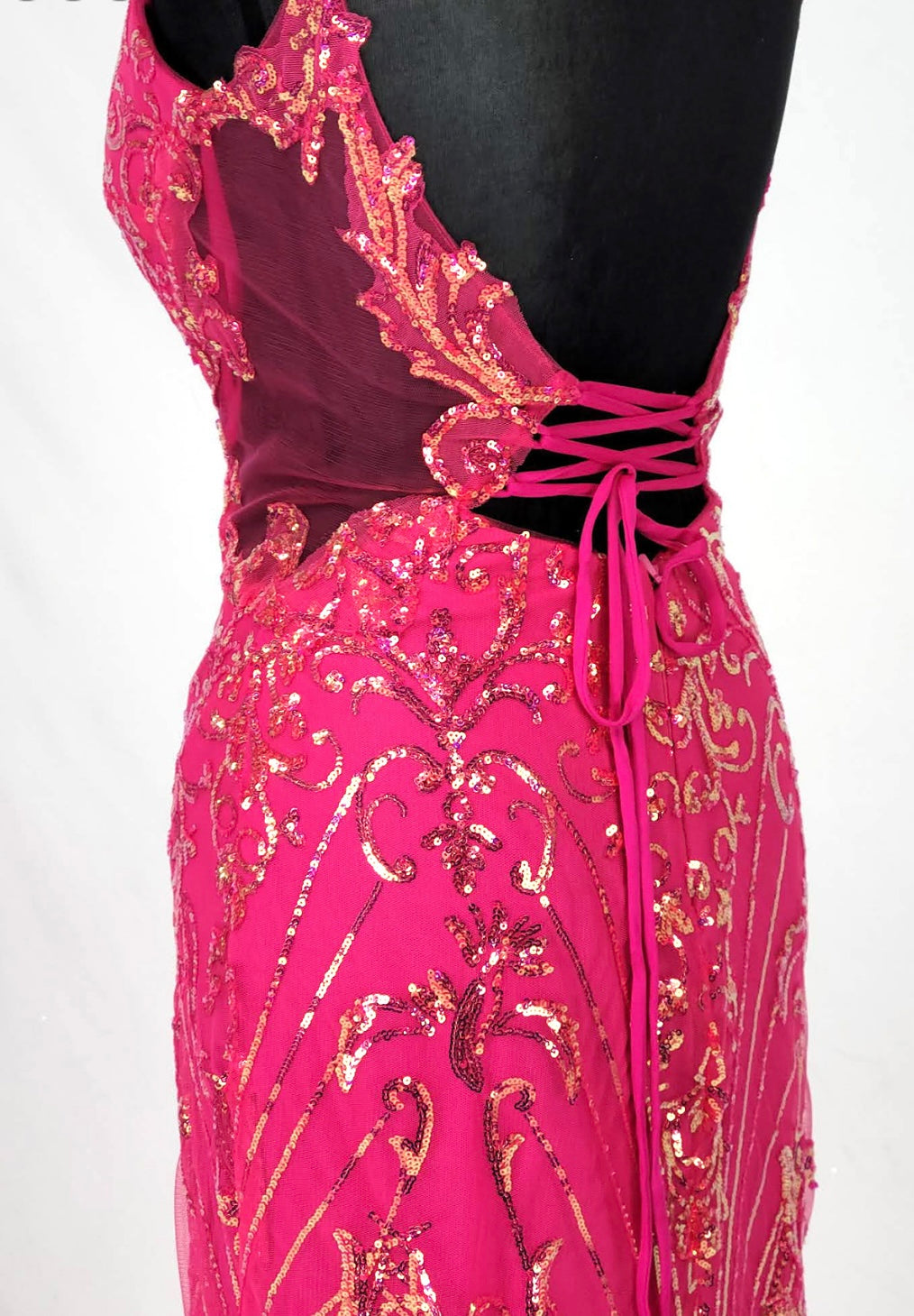 Make a bold statement in this vibrant hot pink gown by Chicas, style C369. Featuring delicate spaghetti straps and a plunging illusion neckline, this fitted silhouette is adorned with exquisite gold sequin embroidery in ornate patterns that shimmer with every step. The dress includes side cutouts for a modern touch and a high slit for added drama and movement. Perfect for pageants, evening galas, or any event where you want to stand out with elegance and confidence.