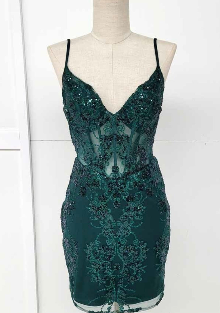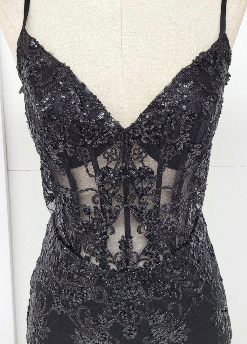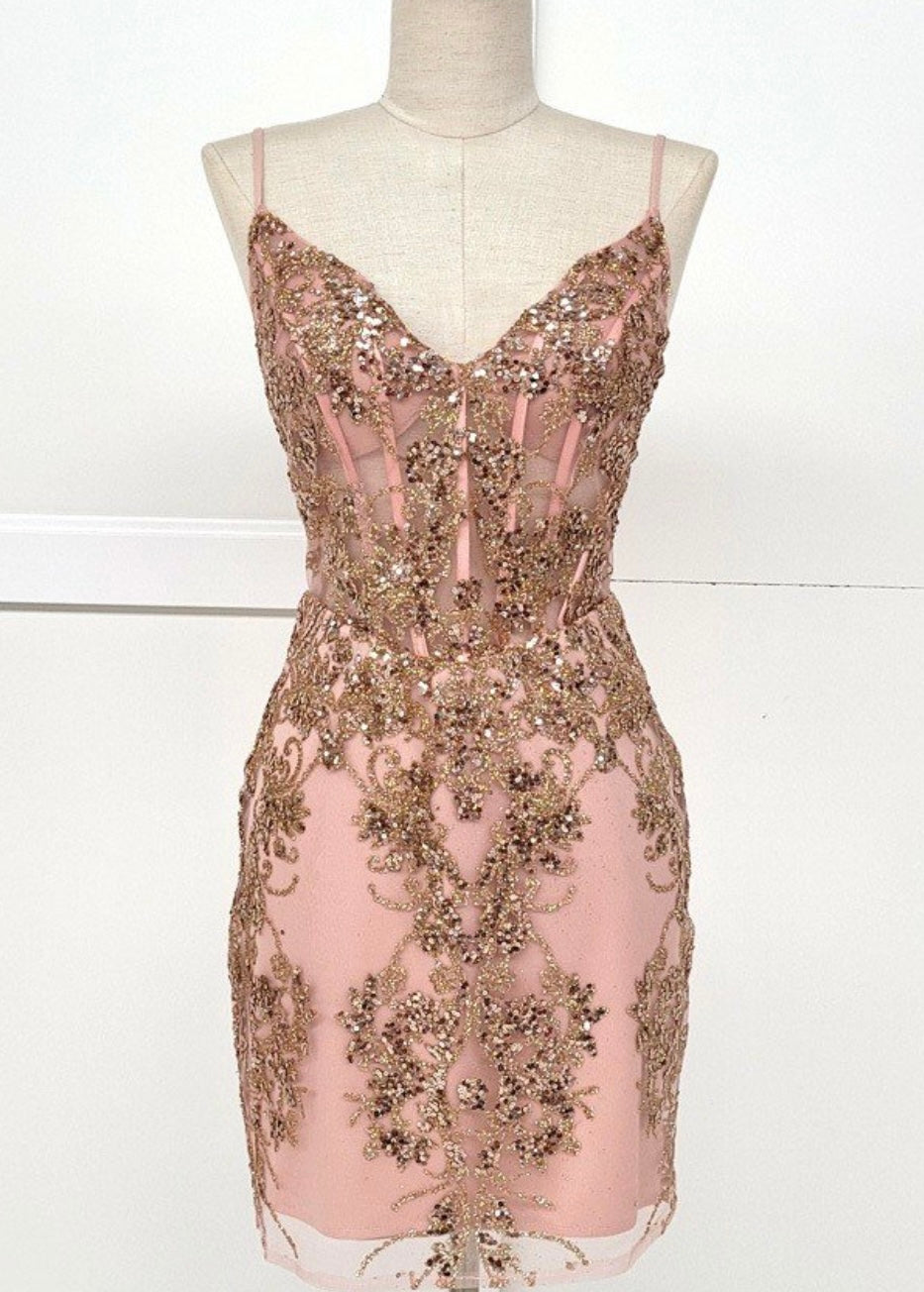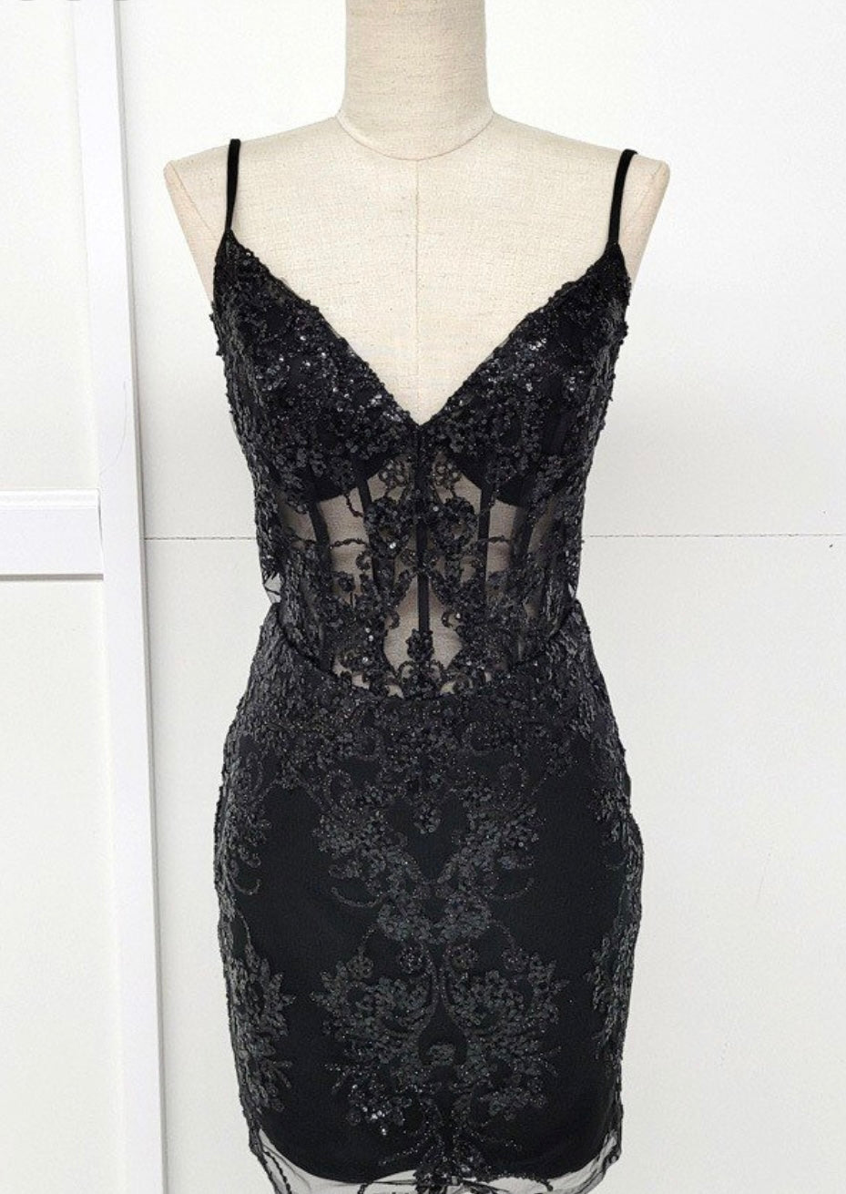 Turn heads in this stunning fitted short dress by Chicas, style C814. Designed with a deep V neckline and thin spaghetti straps, this body-hugging silhouette features an illusion corset bodice adorned with intricate sequin and bead embroidery. The sheer mesh panels add a sultry touch, while the allover sparkling appliqué creates a luxurious and elegant look. Perfect for cocktail parties, graduations, and glamorous nights out.