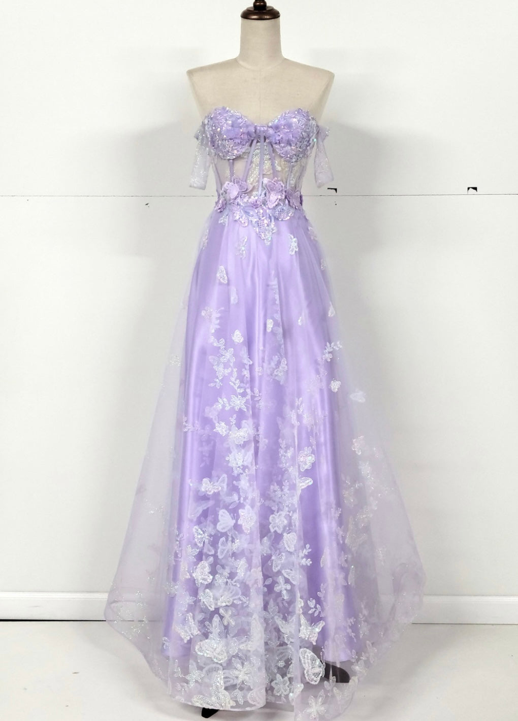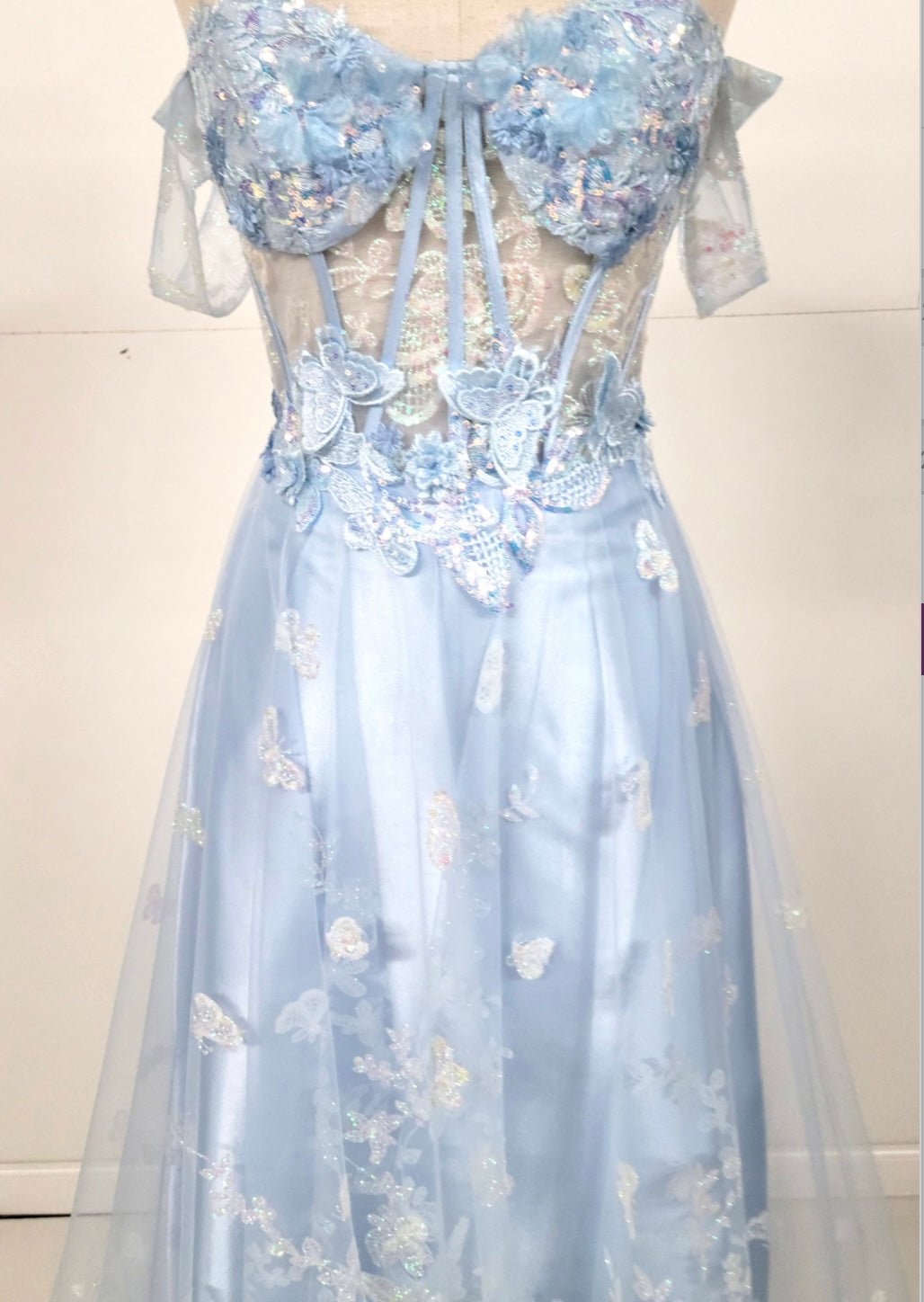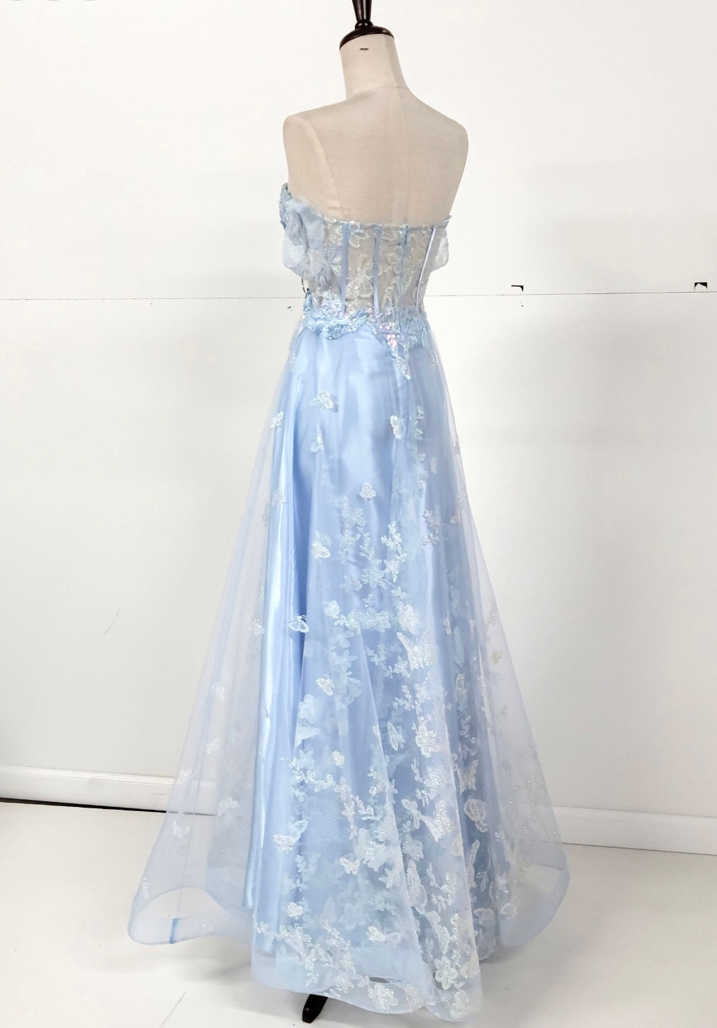 Step into a fairytale with this enchanting off-the-shoulder gown by Chicas, style C822. Designed with a sheer corset bodice and delicate draped sleeves, this dress captivates with floral appliqués, butterfly embroidery, and shimmering details throughout. The A-line silhouette flows in layers of ethereal light blue tulle, creating a dreamy and romantic look perfect for prom, quinceañeras, or any formal evening affair.