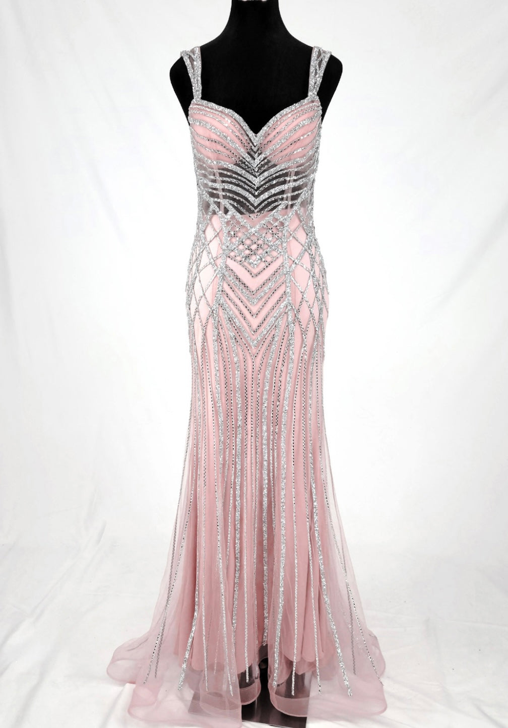Make a dazzling entrance in this stunning silver evening gown by Chicas, style C835. This fitted dress features wide straps and a sweetheart neckline that beautifully frames the décolletage. The gown is adorned with intricate geometric patterns of silver beading and sequins that contour the silhouette, adding glamour and sparkle from every angle. The sheer illusion detailing at the bodice adds a touch of allure, while the soft mermaid-style skirt flows elegantly to the floor with tulle and sequin-accented panels for a dramatic finish. Perfect for galas, pageants, or any formal event where you want to shine.