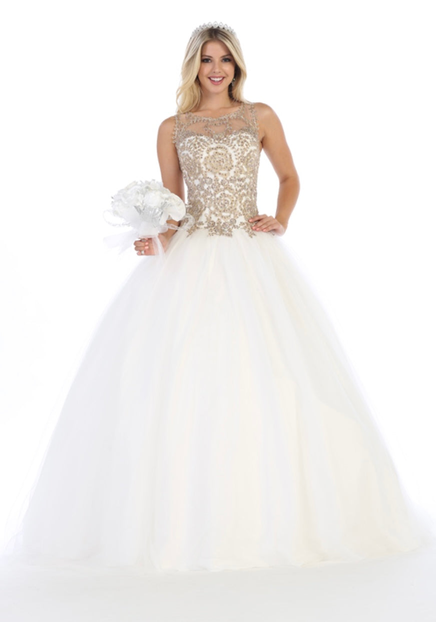 Make a grand entrance in this stunning ball gown from Chicas, style C9161. Featuring a high illusion neckline, the bodice is adorned with intricate gold embroidery and shimmering beadwork for a regal, princess-like look. The voluminous tulle skirt flows gracefully to the floor, creating a dramatic silhouette perfect for quinceañeras, sweet sixteens, or formal events. Available in rich red and elegant off-white, this dress is designed to make you feel like royalty.