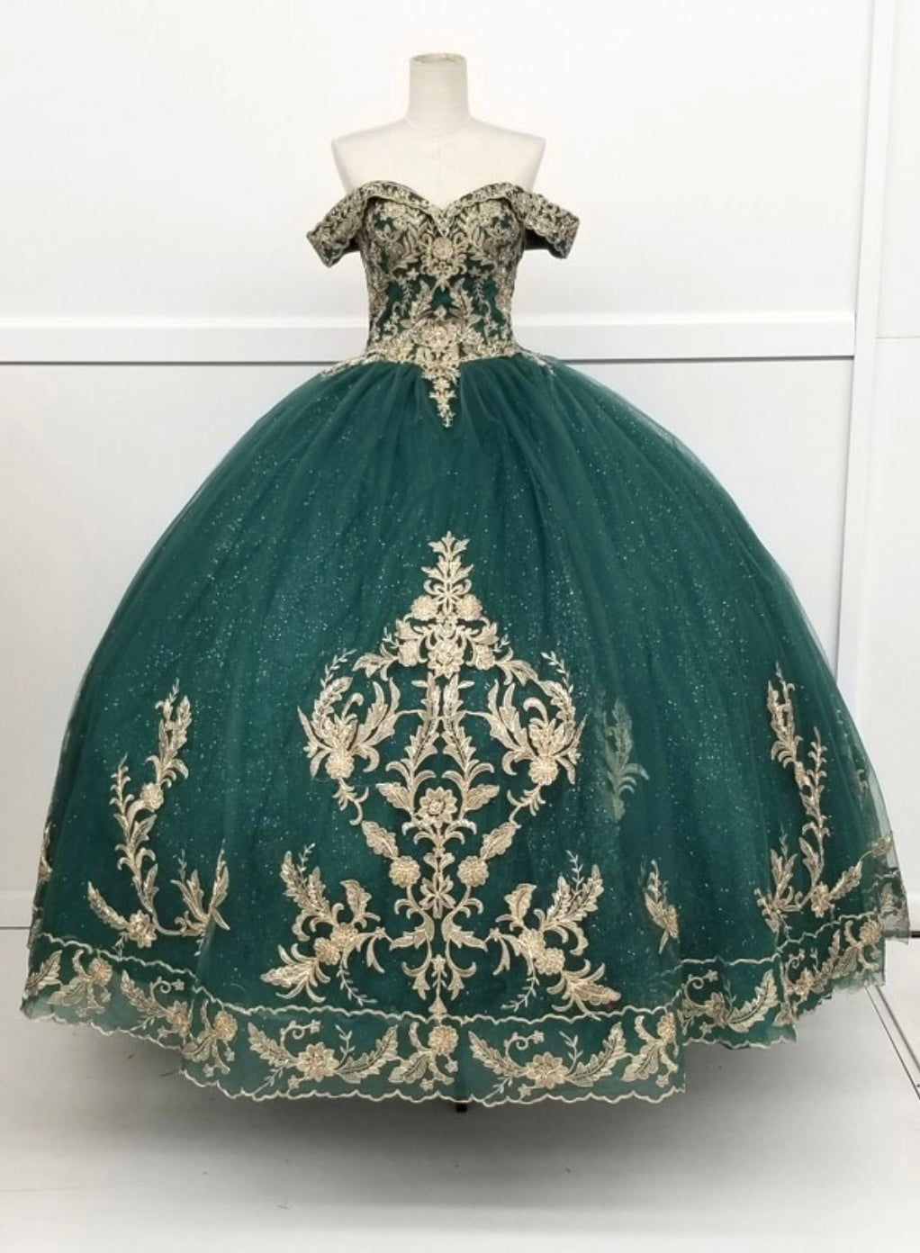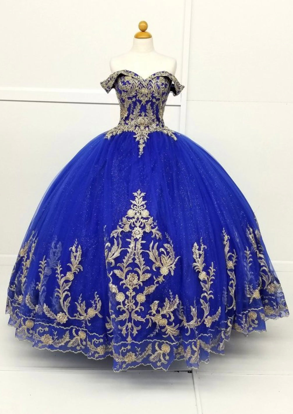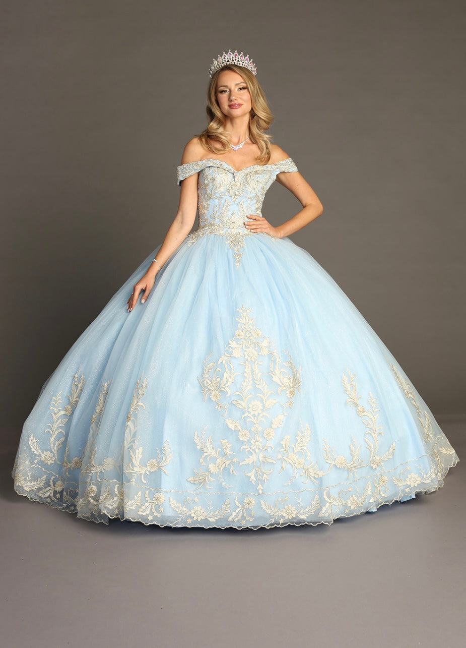 Step into a fairytale in this breathtaking quinceañera gown by Chicas, style CHF3006, designed by Chicas. This stunning off-the-shoulder ball gown features a sweetheart neckline and a corset-style bodice richly adorned with intricate gold embroidery. The voluminous sky blue tulle skirt sparkles with delicate gold floral appliqués that cascade throughout the hem, adding an air of elegance and royalty. Fit for a princess, this gown is perfect for making your grand entrance truly unforgettable.