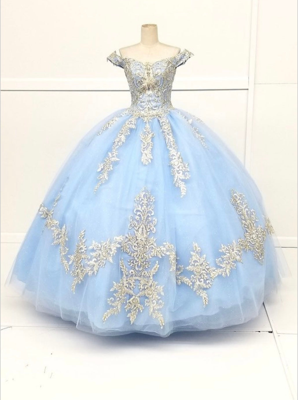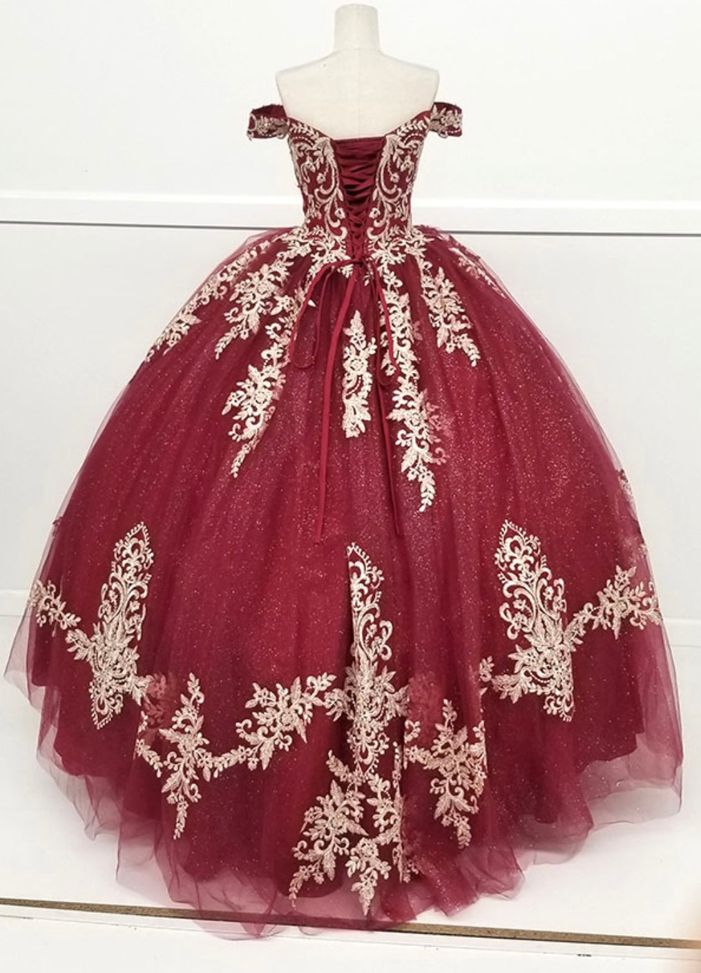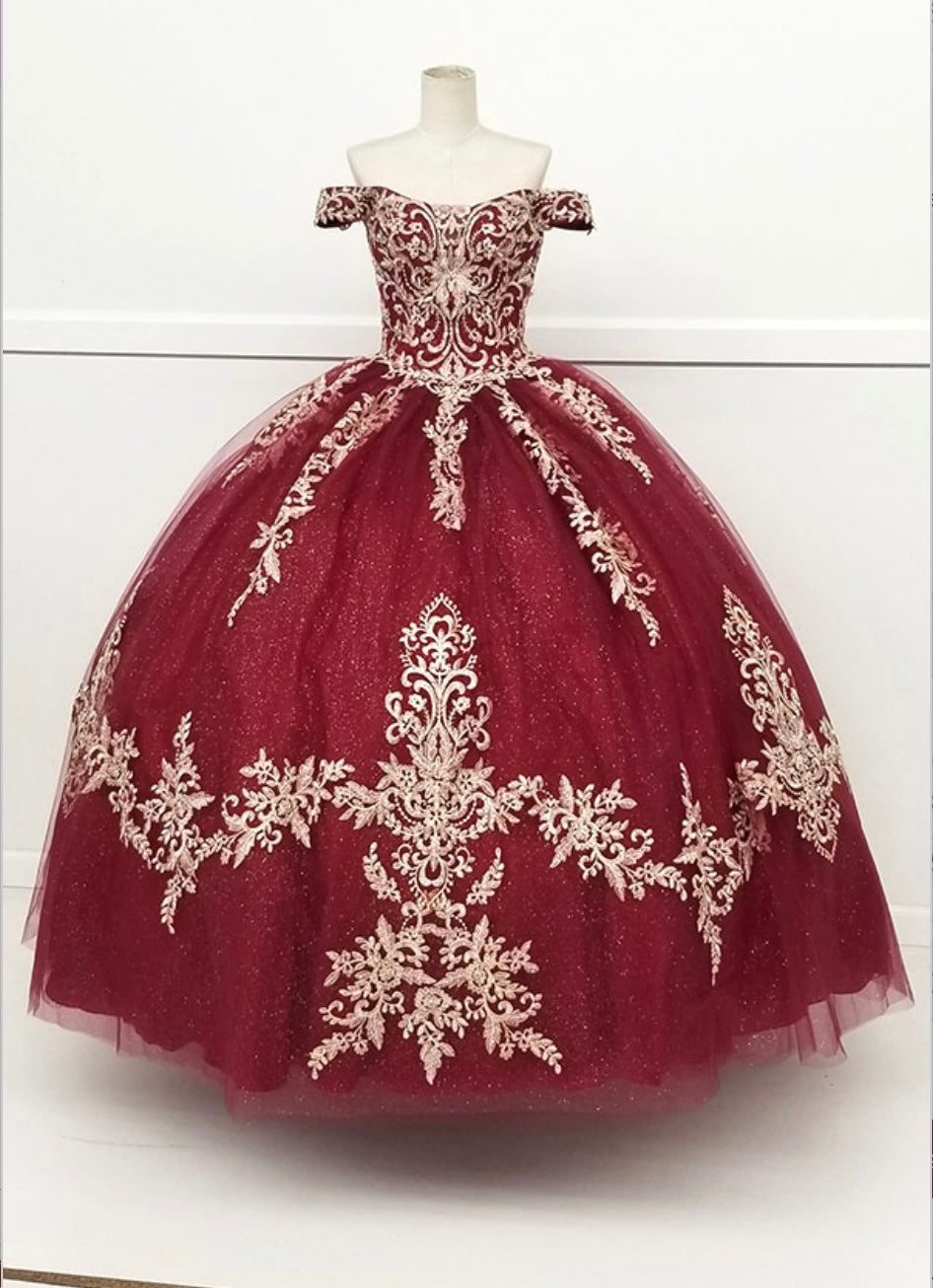 Make a grand entrance with this regal quinceañera gown by Chicas, style CHF3008, designed by Chicas. This stunning off-the-shoulder ball gown features a deep burgundy hue adorned with intricate champagne gold embroidery that cascades across the bodice and voluminous skirt. The glitter tulle overlay adds a radiant shimmer, while the structured silhouette creates a classic and elegant princess look. Perfect for a celebration filled with elegance and tradition, this dress is designed to make you shine.