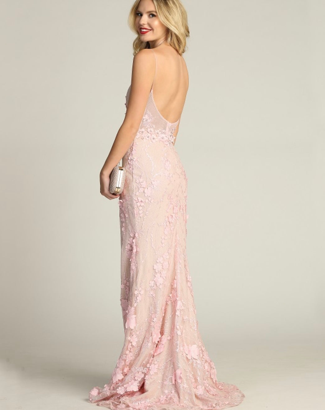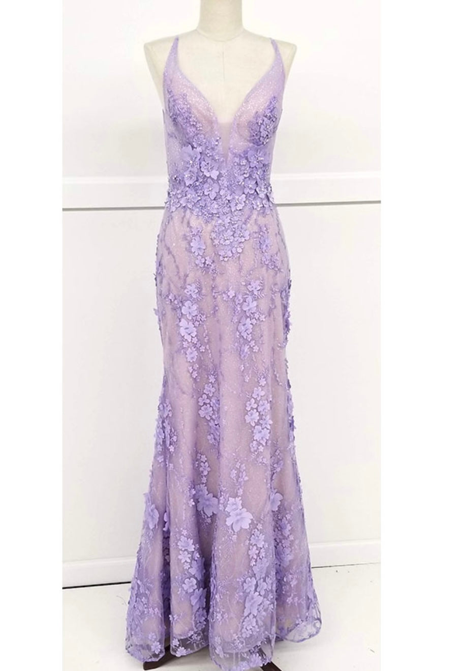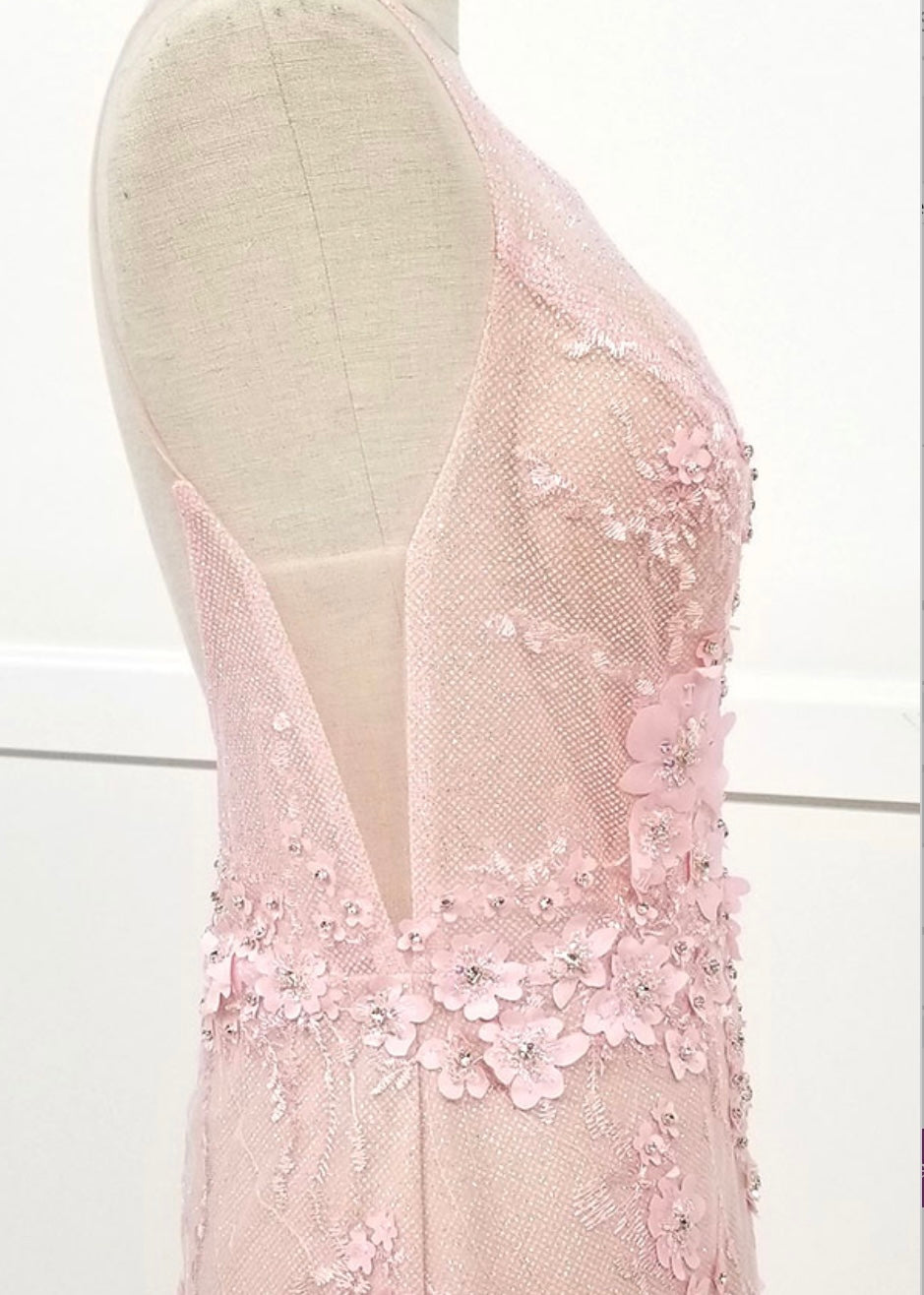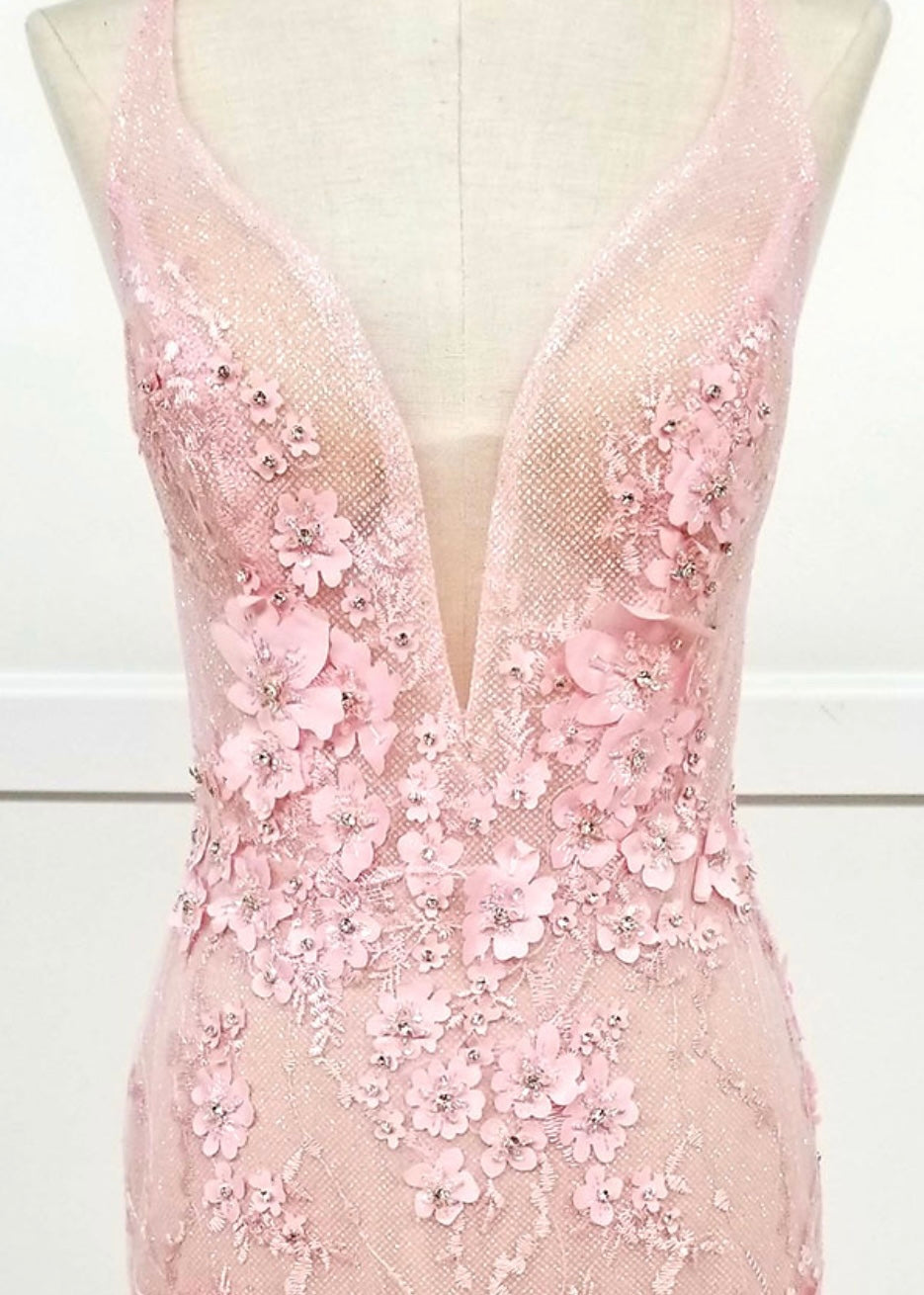 Step into elegance with this sophisticated fitted evening gown. Featuring a deep V neckline with illusion mesh, this dress is adorned with delicate 3D floral appliqués and shimmering sequins that cascade gracefully throughout the bodice and skirt. The sheer overlay adds a romantic touch, while the curve-hugging silhouette ensures a flattering fit. Ideal for formal events, prom, or special occasions, this dress is available in blush, champagne, and lilac.