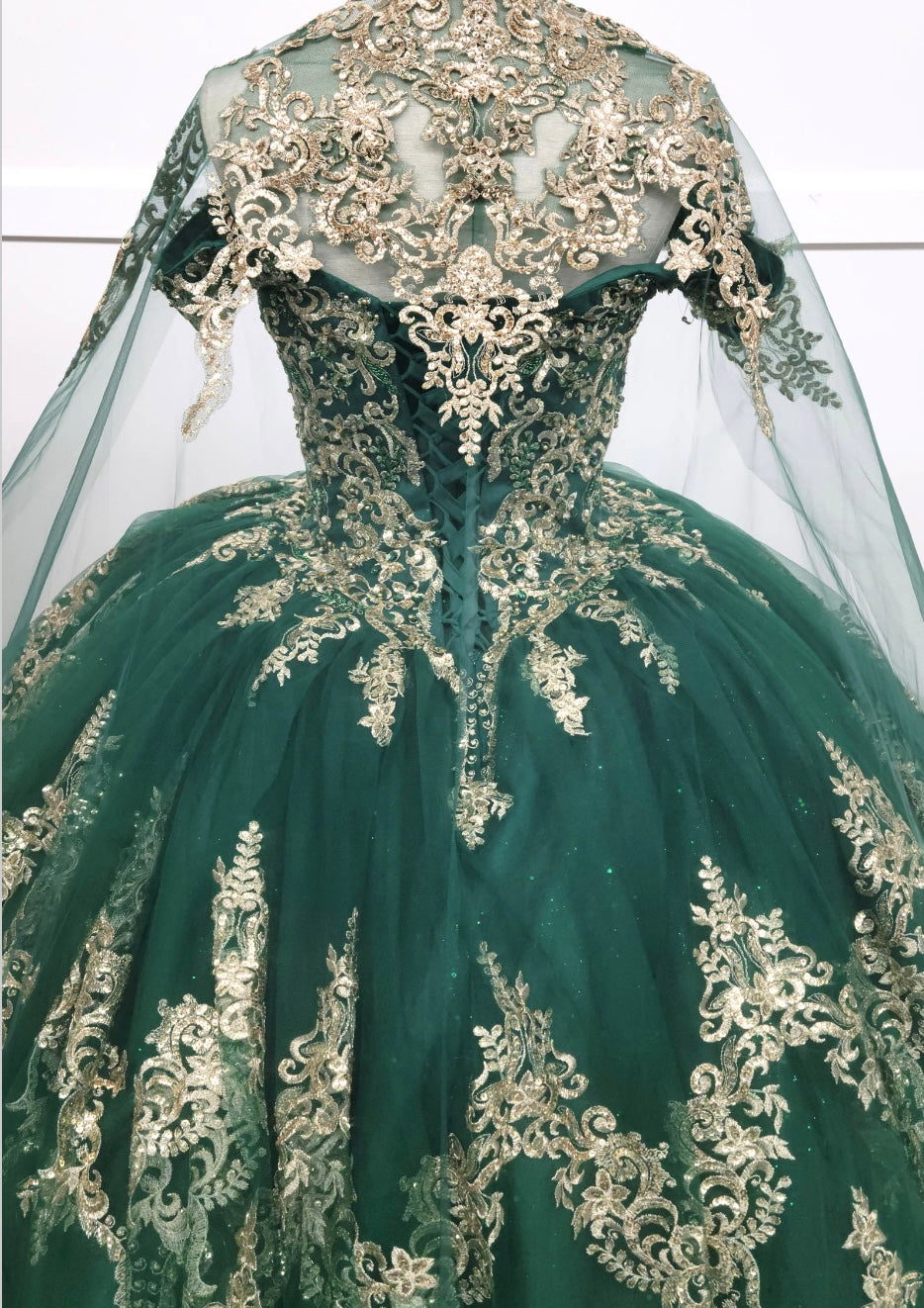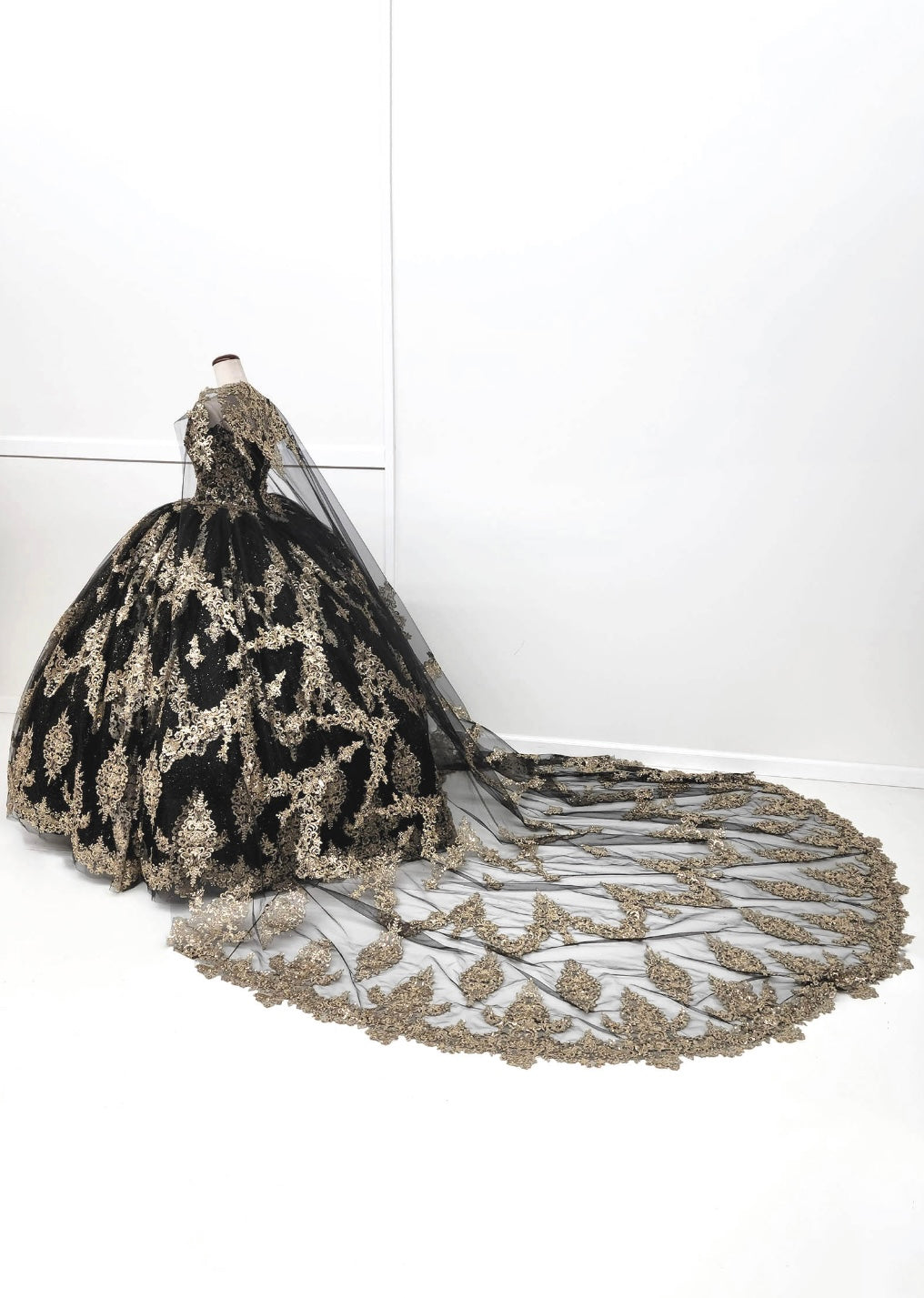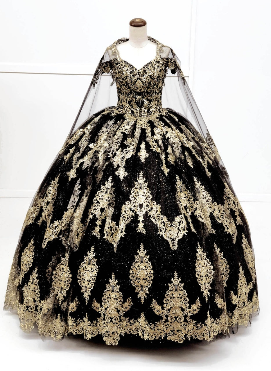 Make a majestic entrance in this regal quinceañera gown by Chicas, style CHF3090, designed by Chicas. This dramatic ball gown features a black glitter tulle base adorned with exquisite gold baroque embroidery throughout the voluminous skirt and structured bodice. The off-the-shoulder neckline is accented with matching embroidered straps, while a sheer tulle cape drapes elegantly from the shoulders for a grand, queen-like effect. This gown is a perfect blend of opulence and sophistication, ideal for those seeking a bold and unforgettable look.