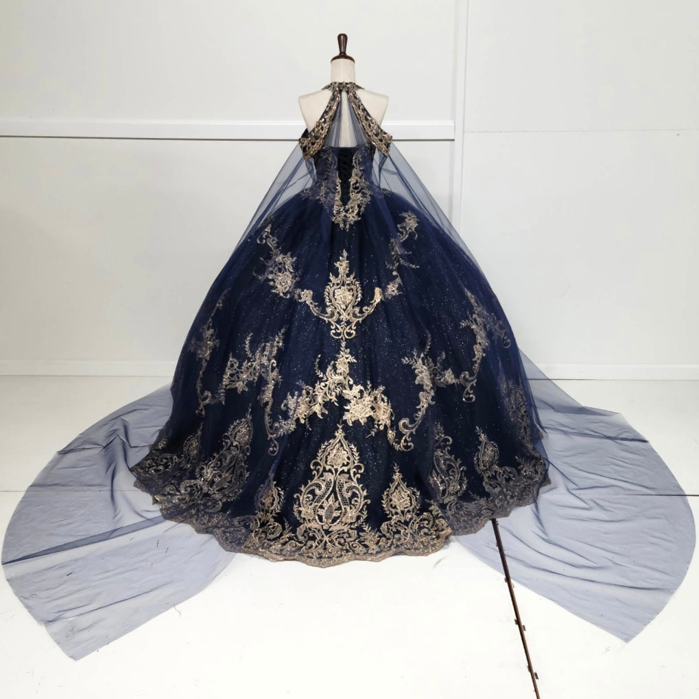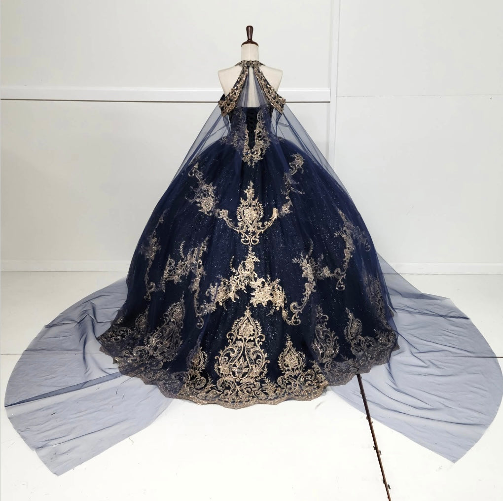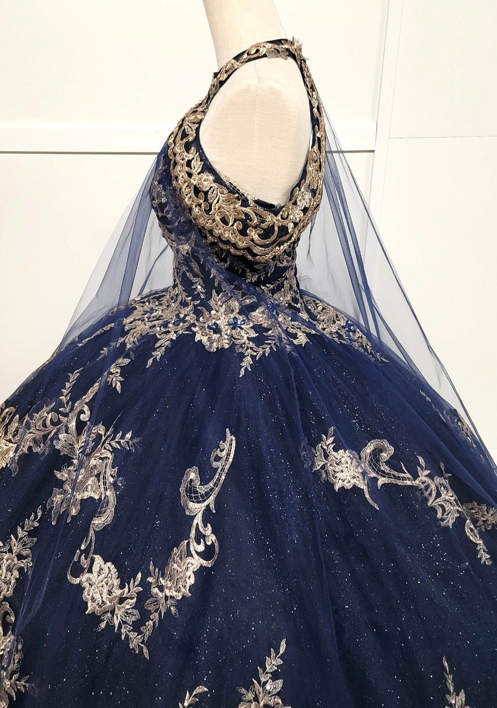 Make a royal statement in this luxurious ball gown by Chicas, style CHF3091. This stunning dress features a high halter neckline with an illusion panel and a dramatic detachable tulle cape, adding grandeur to the look. The deep navy fabric is richly embellished with intricate gold embroidery and glitter details that shimmer with every movement. The voluminous skirt and regal train make this gown perfect for quinceañeras, galas, or unforgettable formal events.