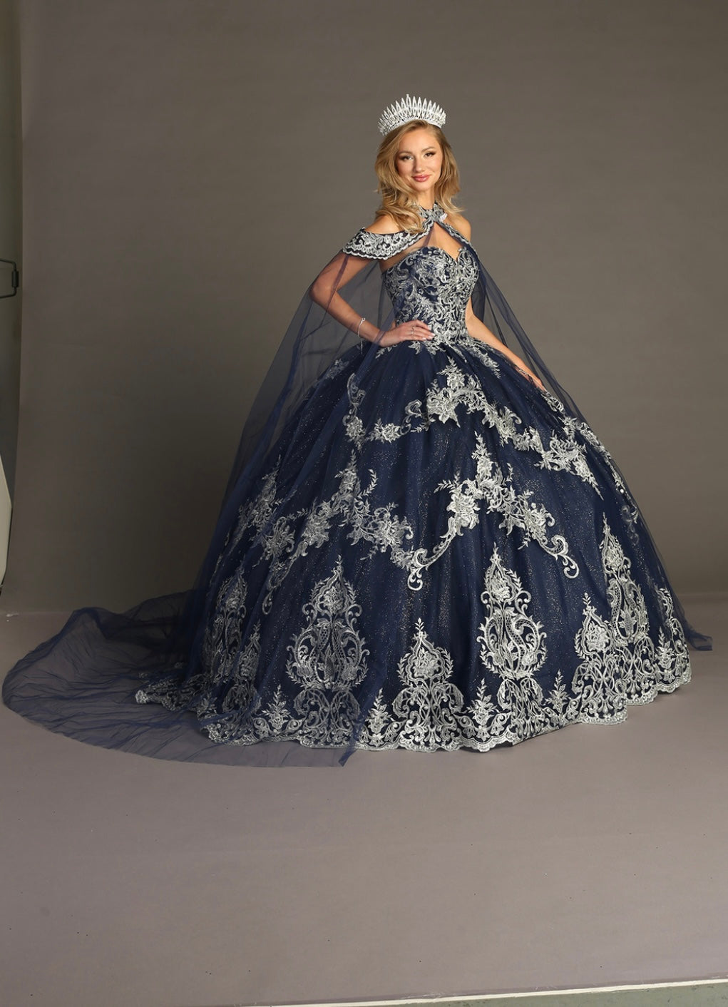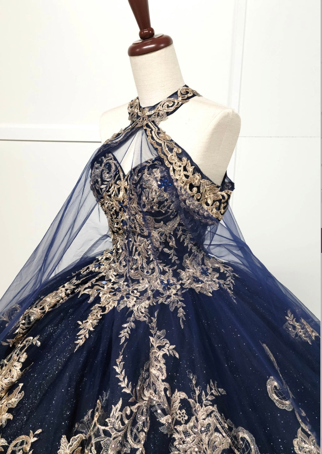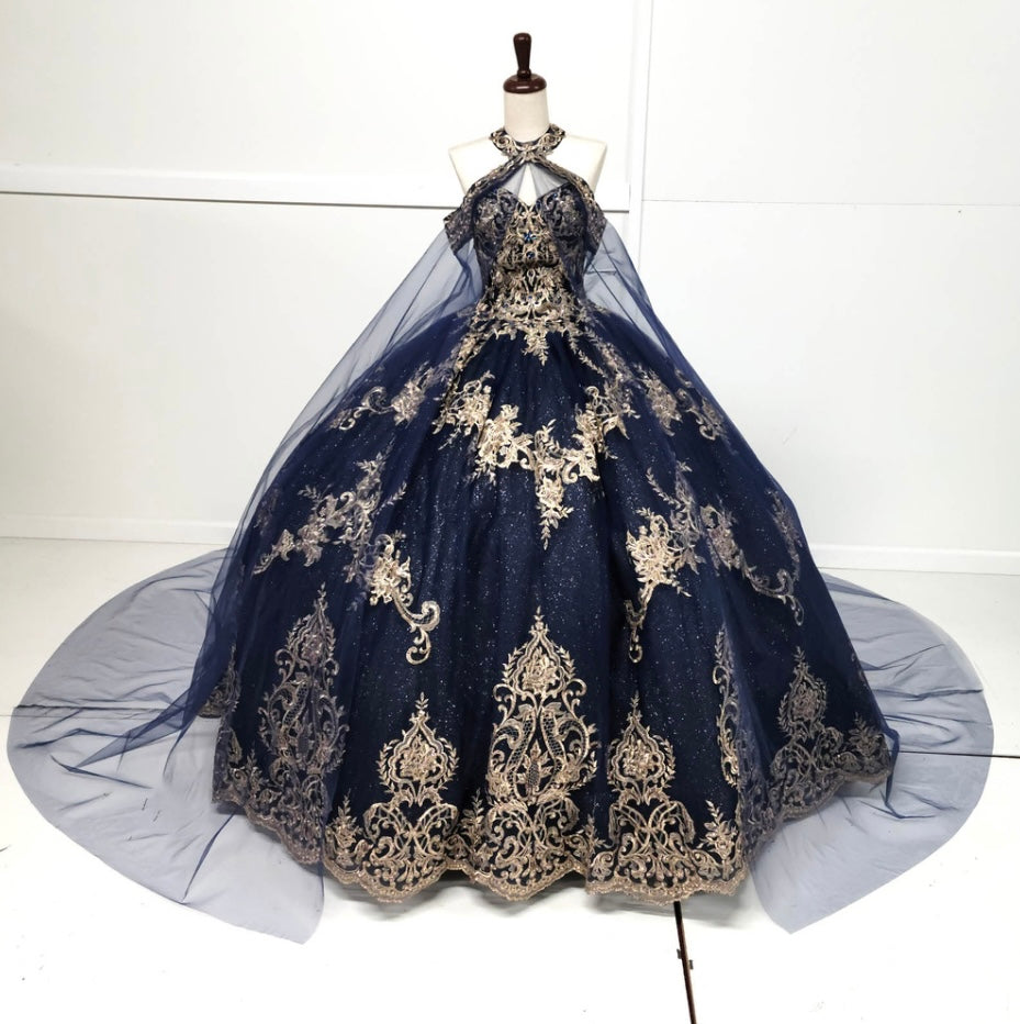 Make a royal statement in this luxurious ball gown by Chicas, style CHF3091. This stunning dress features a high halter neckline with an illusion panel and a dramatic detachable tulle cape, adding grandeur to the look. The deep navy fabric is richly embellished with intricate gold embroidery and glitter details that shimmer with every movement. The voluminous skirt and regal train make this gown perfect for quinceañeras, galas, or unforgettable formal events.