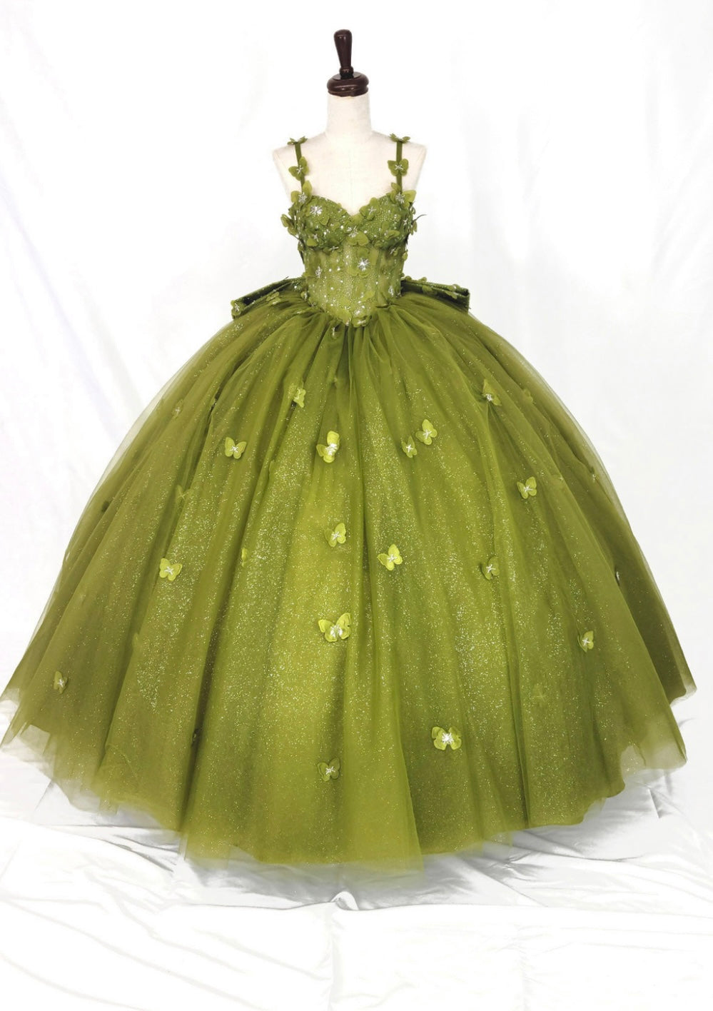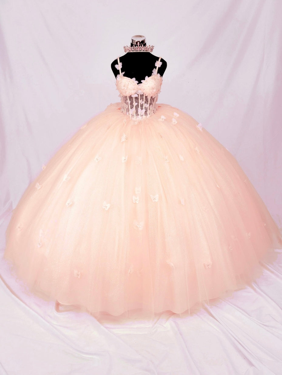 Radiate princess elegance in this enchanting blush pink ball gown by Chicas, style CHF3107. Featuring a fitted corset bodice with visible boning and delicate 3D floral appliqués, this gown brings a romantic and whimsical touch. The full tulle skirt is adorned with soft butterfly accents that float gracefully across the voluminous silhouette. Complete with dainty straps and a regal tiara, this design by Chicas is ideal for quinceañeras, sweet sixteen celebrations, or any fairy-tale occasion.