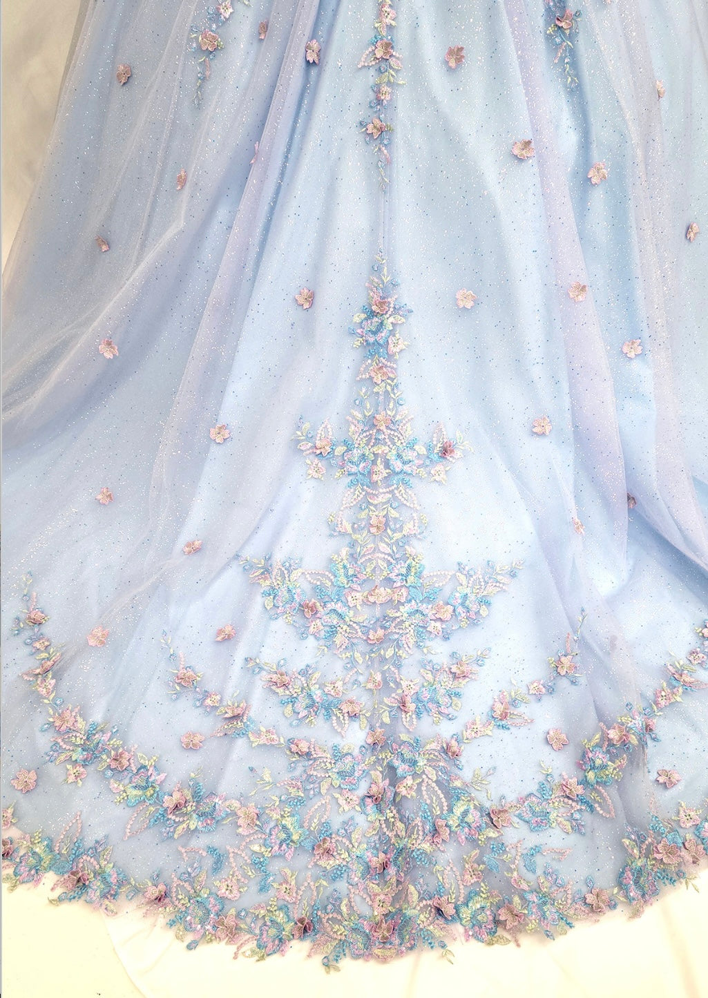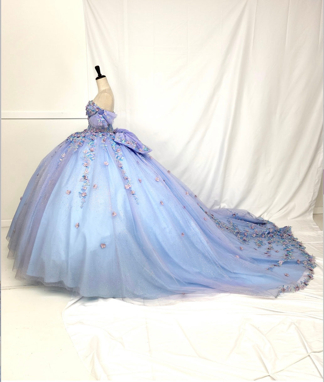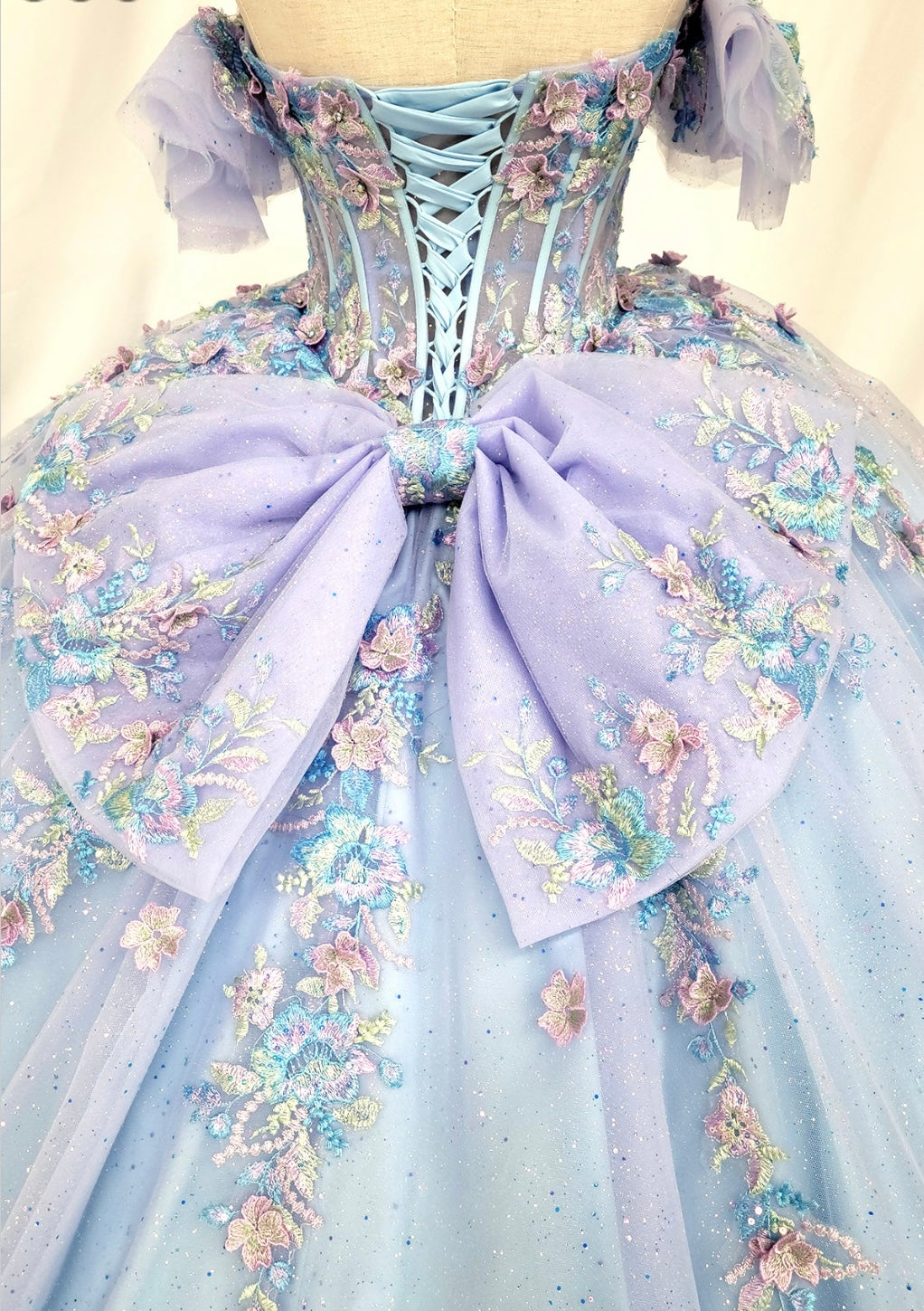 Live your dream moment in this fairytale-inspired ball gown by Chicas, style CHF3114. Designed by Chicas, this stunning off-the-shoulder dress features a structured corset bodice richly adorned with 3D floral appliqués in pastel hues. The full, voluminous skirt is crafted in shimmering tulle, sprinkled with delicate blossoms that cascade down gracefully. Ideal for quinceañeras, royal-themed events, or pageants, this gown embodies elegance and enchantment.