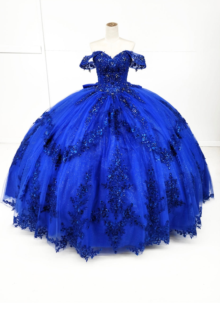 Dazzle like royalty in this majestic royal blue ball gown by Chicas, style CHF3122. This off-the-shoulder design features a sweetheart neckline and a fitted bodice embellished with sparkling sequins and 3D floral appliqués. The voluminous glitter tulle skirt is richly adorned with matching floral embroidery that cascades elegantly, creating a breathtaking silhouette. Ideal for quinceañeras, pageants, or any grand celebration, this gown delivers timeless elegance with a modern sparkle.