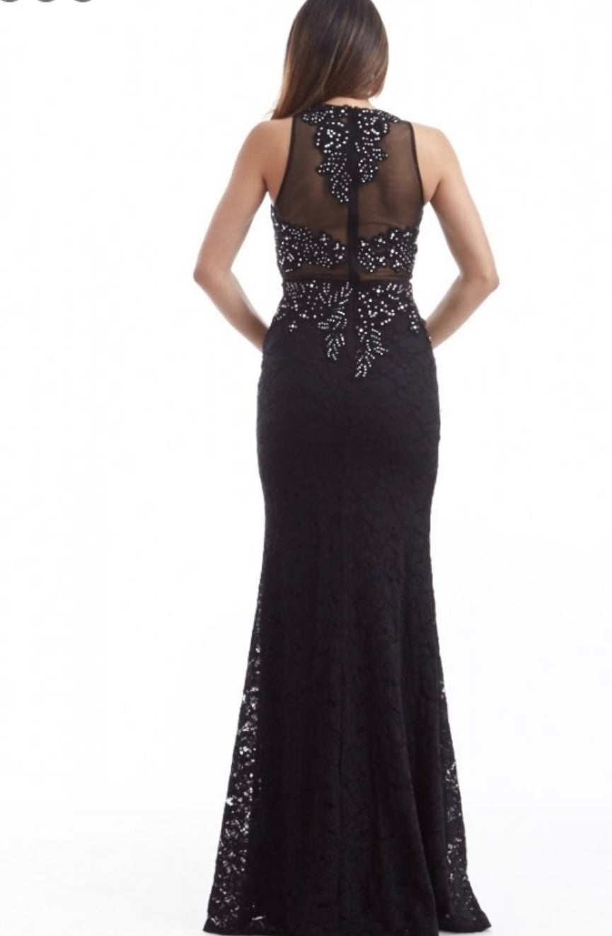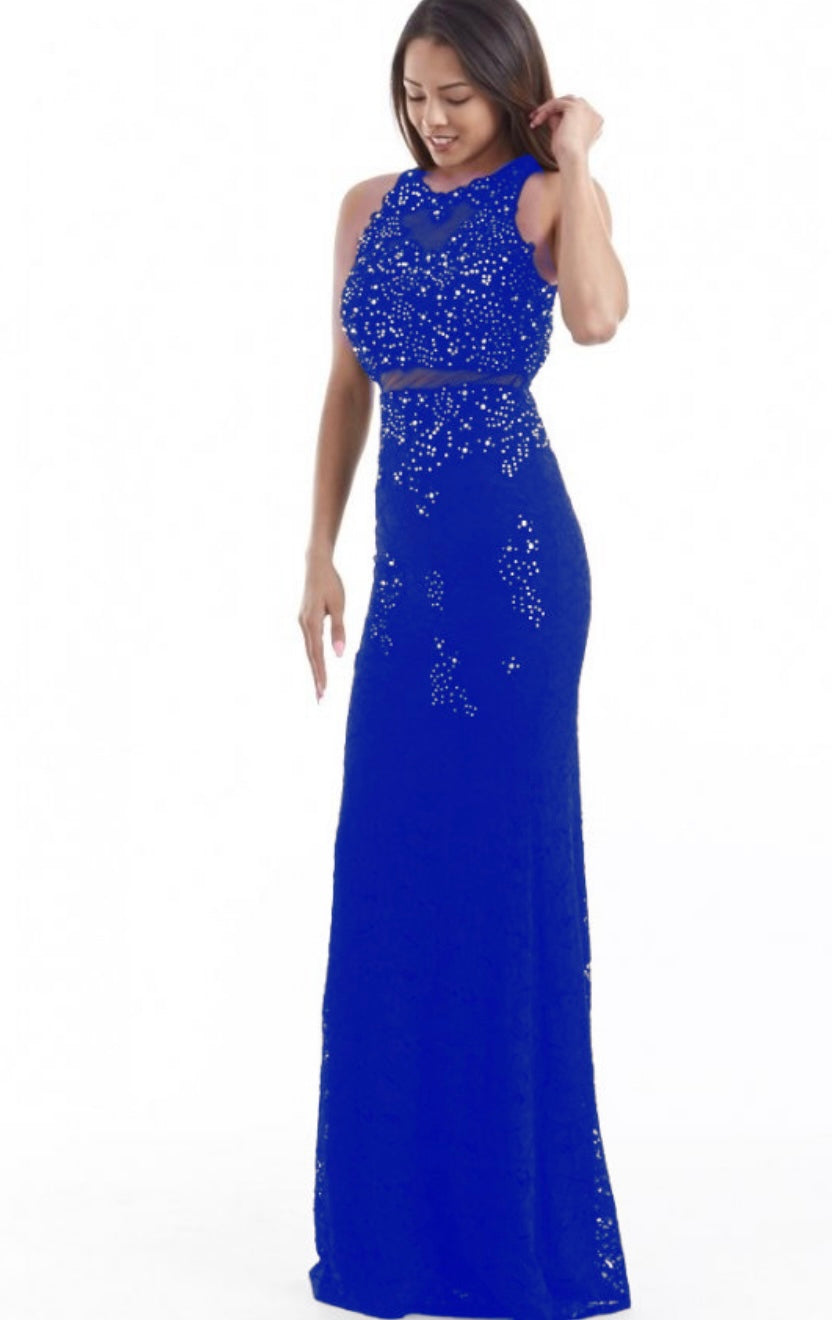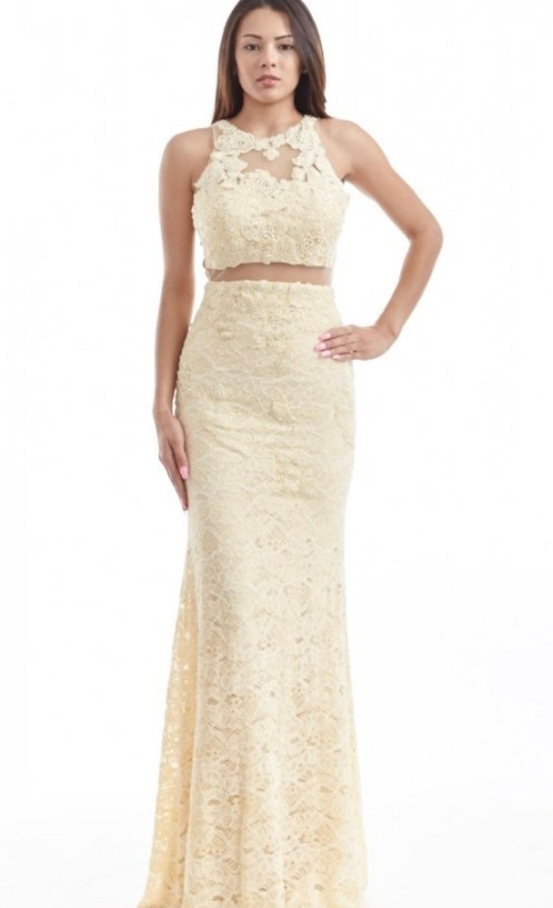 This stunning two-piece gown from Chicas, style code CR4225, is a modern showstopper crafted in delicate lace and adorned with shimmering rhinestones. The high neckline and sleeveless crop top are complemented by an illusion mesh inset, adding a touch of elegance. The fitted mermaid skirt hugs the silhouette gracefully and flows into a subtle flare, creating a sophisticated yet youthful look—perfect for prom, pageants, or formal evenings. Available in classic black, royal blue, ivory, and champagne.