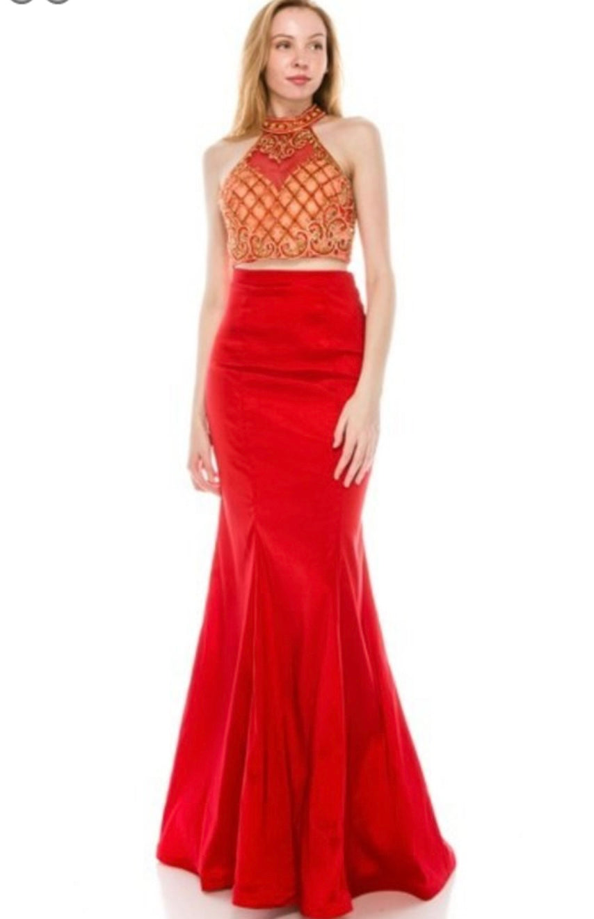 This stunning two-piece gown from Chicas, style CR7009, is designed to make a lasting impression. The high-neck crop top features intricate lattice-style embroidery with golden scrollwork and subtle illusion mesh, creating a regal and dramatic look. The fitted mermaid skirt in a silky satin finish hugs the figure and flares at the bottom for a graceful silhouette. Available in colors black, red, and wine, this gown is perfect for prom, formal events, or pageants.