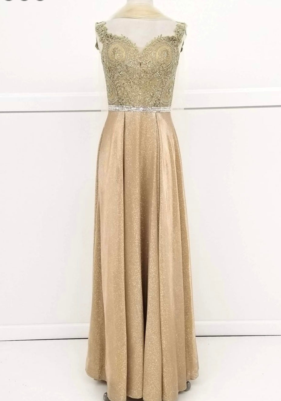 Elegant A-line evening gown with a shimmering glittery skirt and intricate beaded embroidery on the bodice. The dress features a sweetheart neckline with wide straps, a fitted waist accentuated by a rhinestone belt, and a flowy, floor-length skirt. Perfect for formal occasions, it combines sparkle and sophistication for a glamorous look.