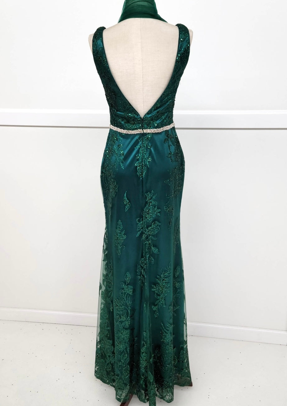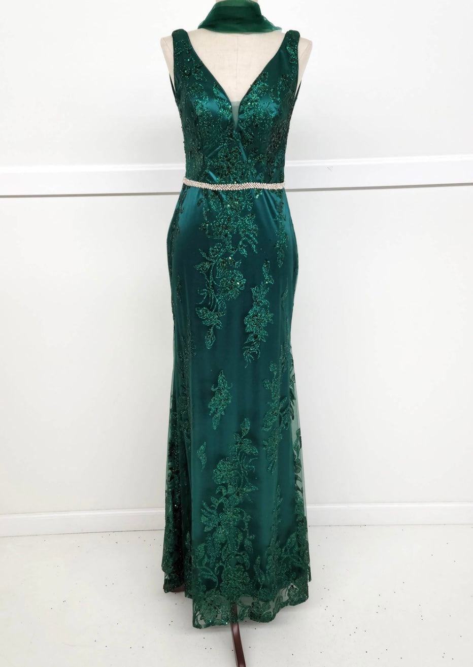 Chicas Design DM4026 is a sophisticated evening gown that radiates timeless elegance. Crafted in luxurious satin with a layer of delicate embroidered tulle, this dress features a deep V neckline and a flattering fitted silhouette that enhances the figure. The gown is adorned with intricate tone-on-tone floral appliqués and sparkling beadwork for a subtle yet refined shimmer. A rhinestone belt cinches the waist, adding definition and sparkle. This design is perfect for formal events, weddings, or special celebrations.