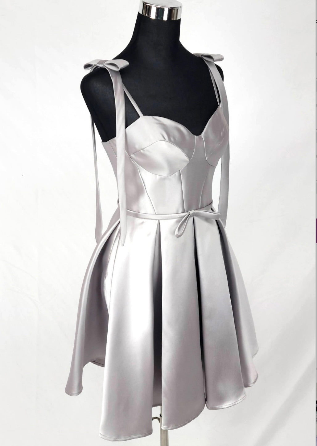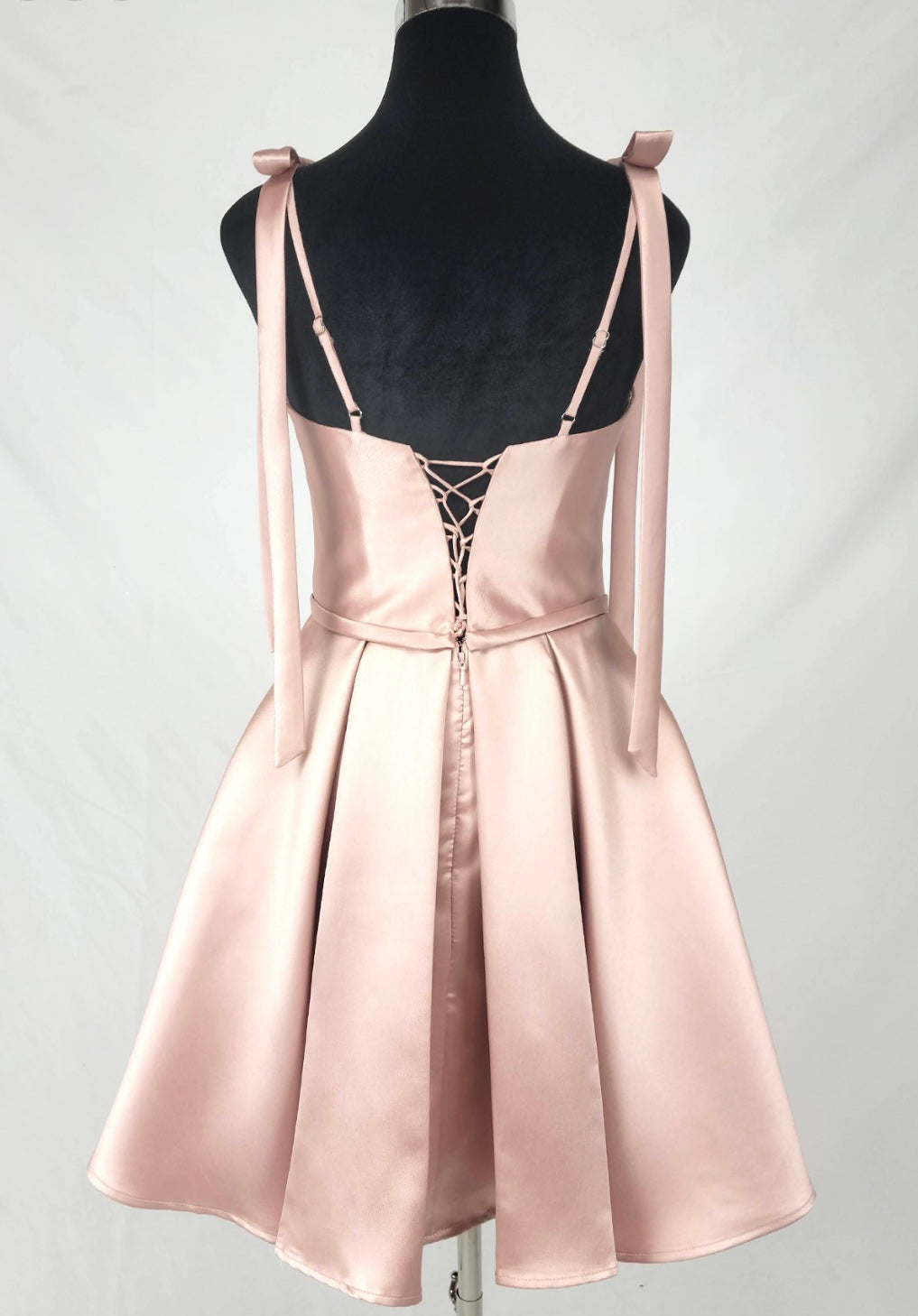 Chic and playful, this short satin dress from Chicas, style DM8133, is a perfect blend of sweetness and sophistication. Designed by Chicas, this blush pink dress features a structured bodice with a sweetheart neckline and supportive cups for a flattering fit. The adjustable shoulder straps are tied into delicate bows, adding a touch of charm. A slim satin belt cinches the waist above a voluminous A-line skirt that flares beautifully with every step. Ideal for parties, semi-formal events, or a stylish night out.