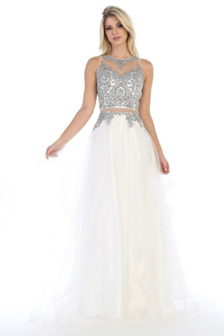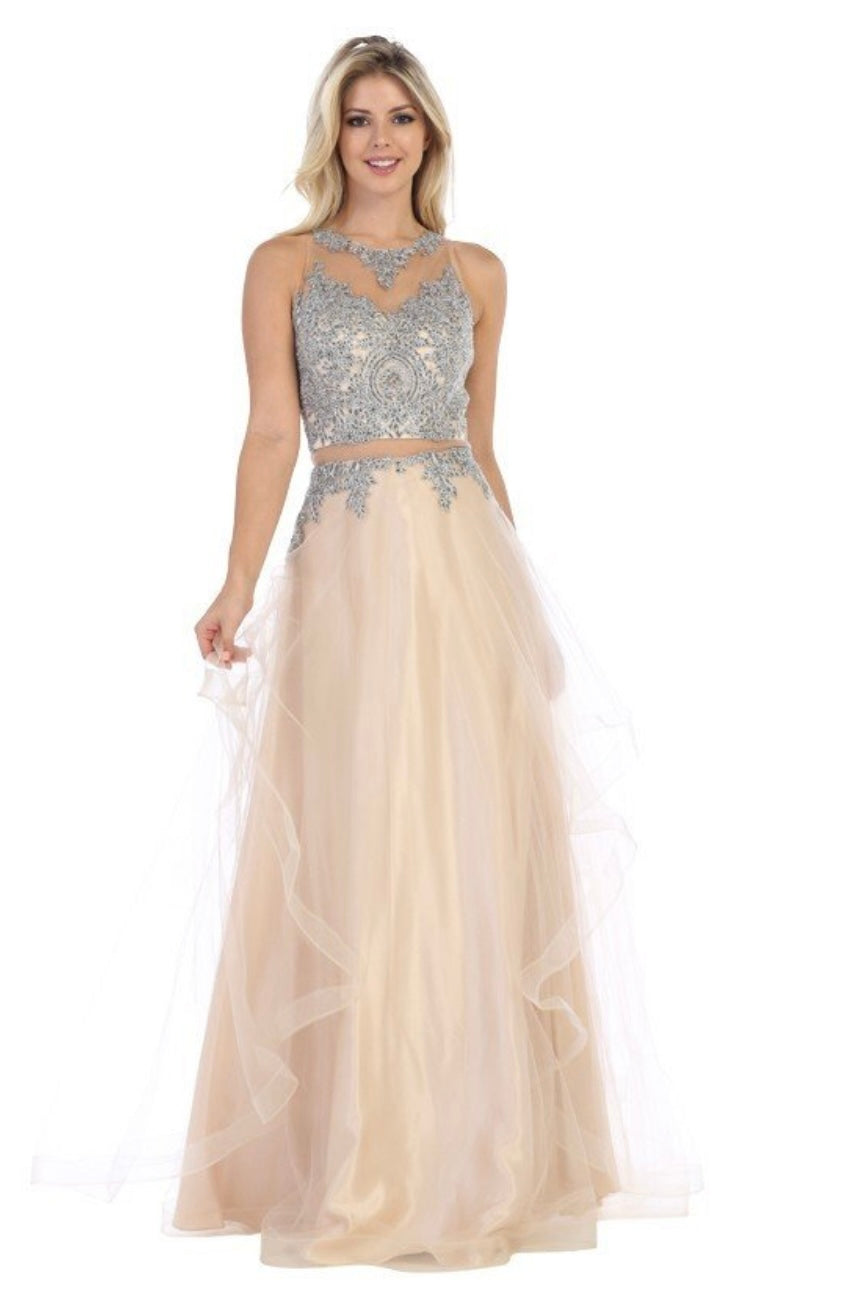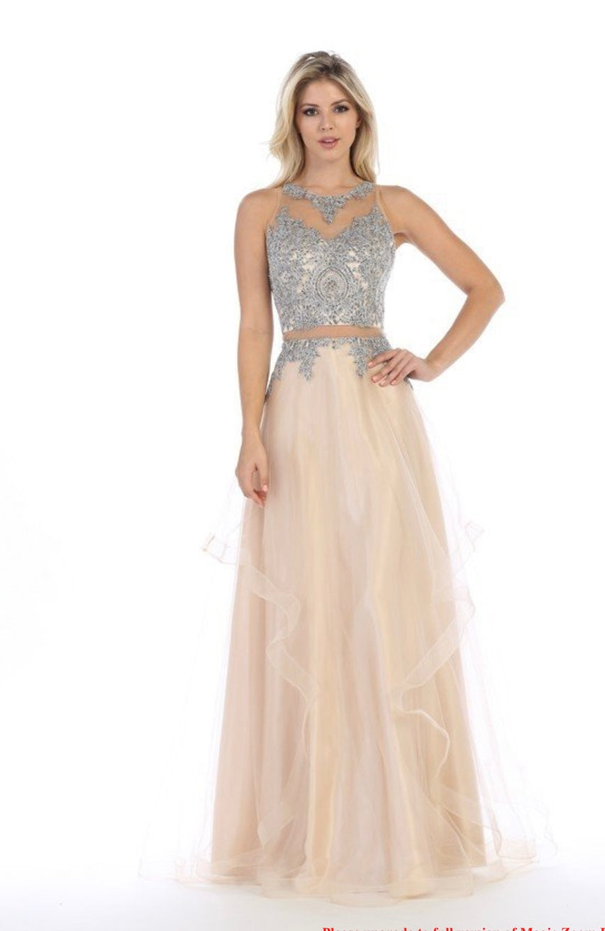 This stunning two-piece evening gown by Chicas, style code DR7004, radiates elegance and glamour. The sleeveless bodice features intricate silver embroidery and beadwork over a sheer illusion neckline, creating a delicate and regal appearance. A slim waistband enhances the silhouette and leads into a flowing, multi-layered tulle A-line skirt that adds movement and charm. Perfect for quinceañeras, proms, or formal events, this gown is available in champagne and off-white.