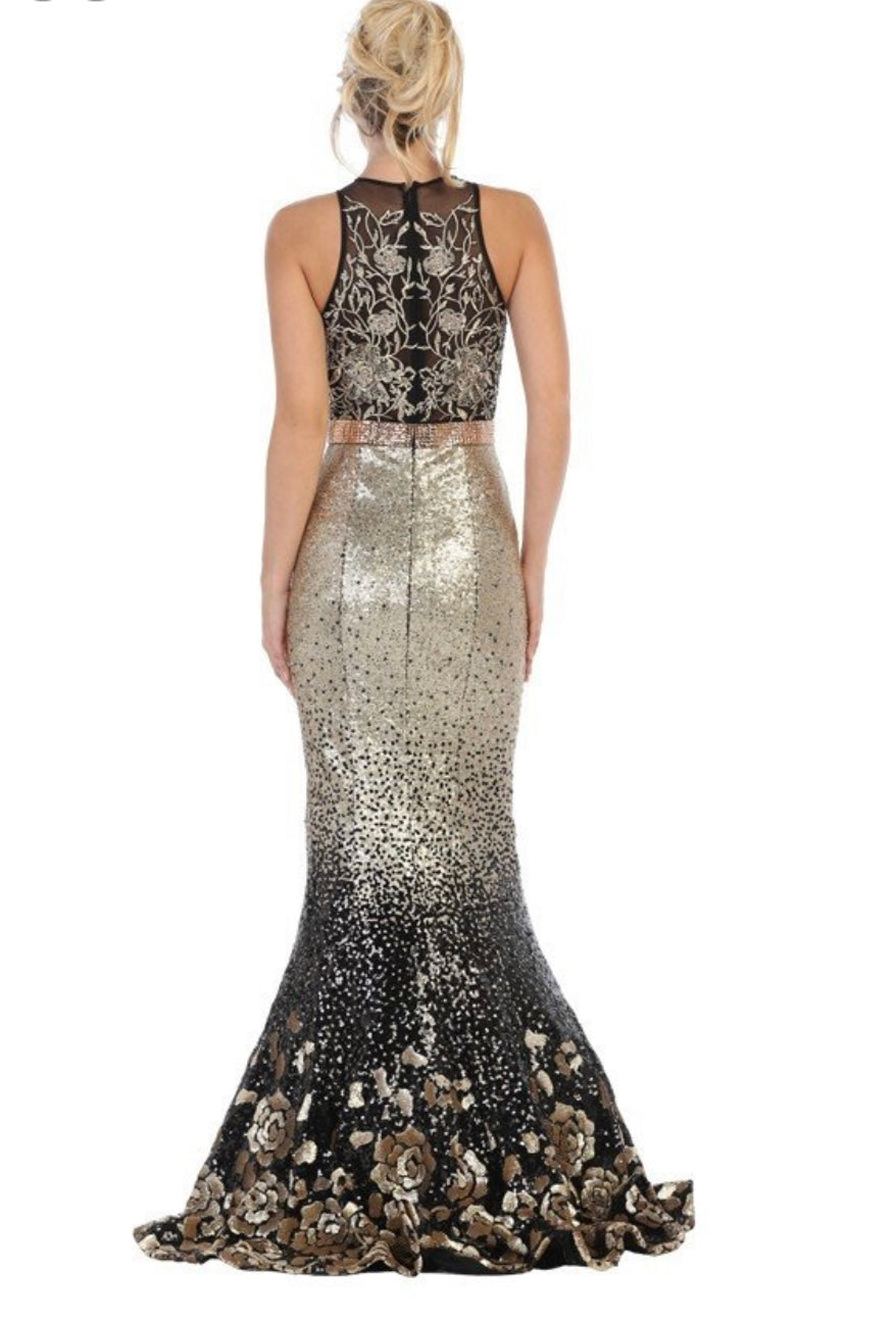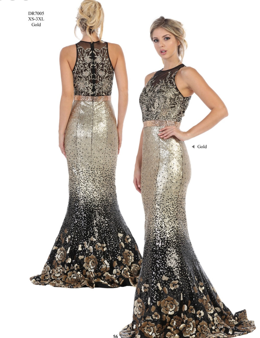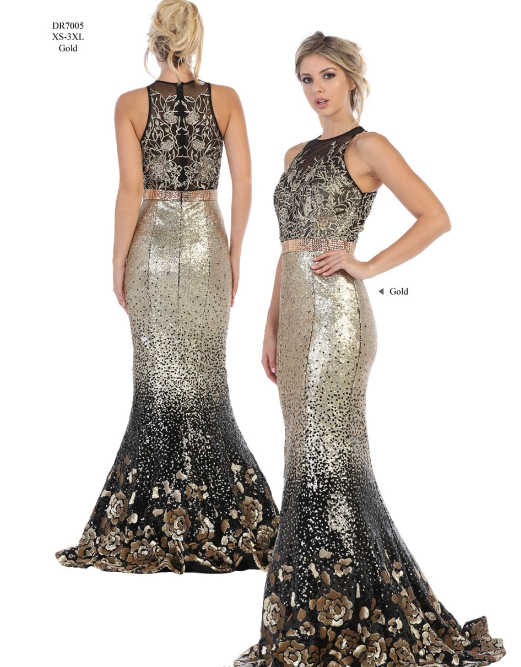 Make a bold and unforgettable statement with this dazzling Chicas evening gown, style code DR7005, available in gold. This fitted mermaid silhouette features a sleeveless bodice with sheer black illusion detailing and intricate metallic floral embroidery. The design cascades into a fully sequined gold and black ombré skirt, flaring out at the hem with luxurious embroidered floral appliqués. A beaded waistband accentuates the waist for a flattering finish. Perfect for galas, red carpet events, or any formal affair where glamour is a must.