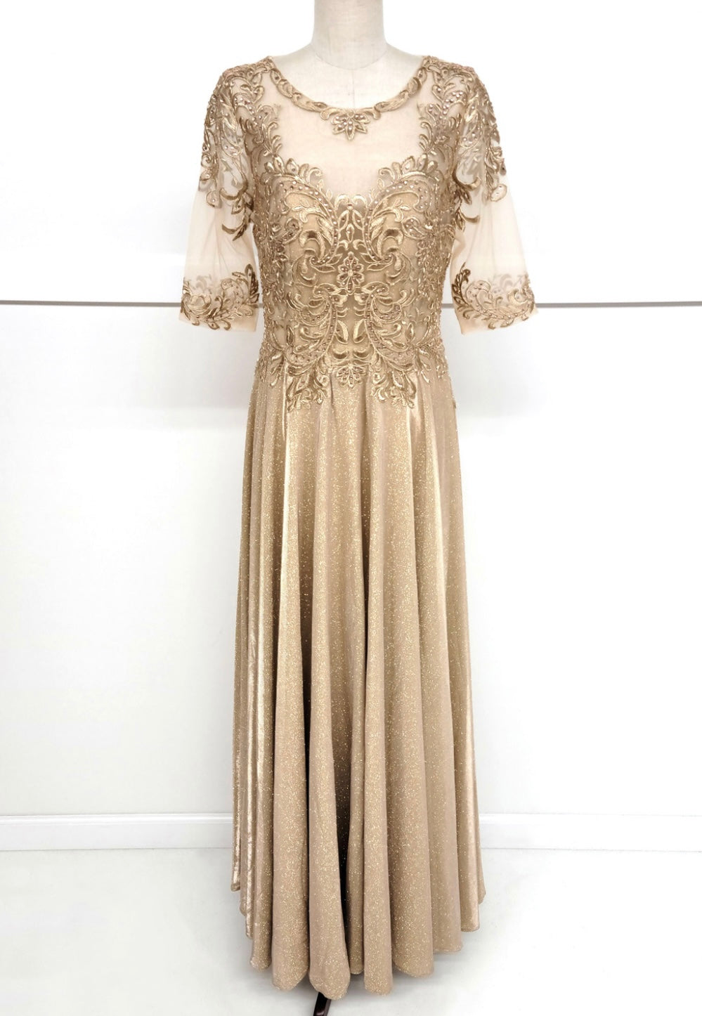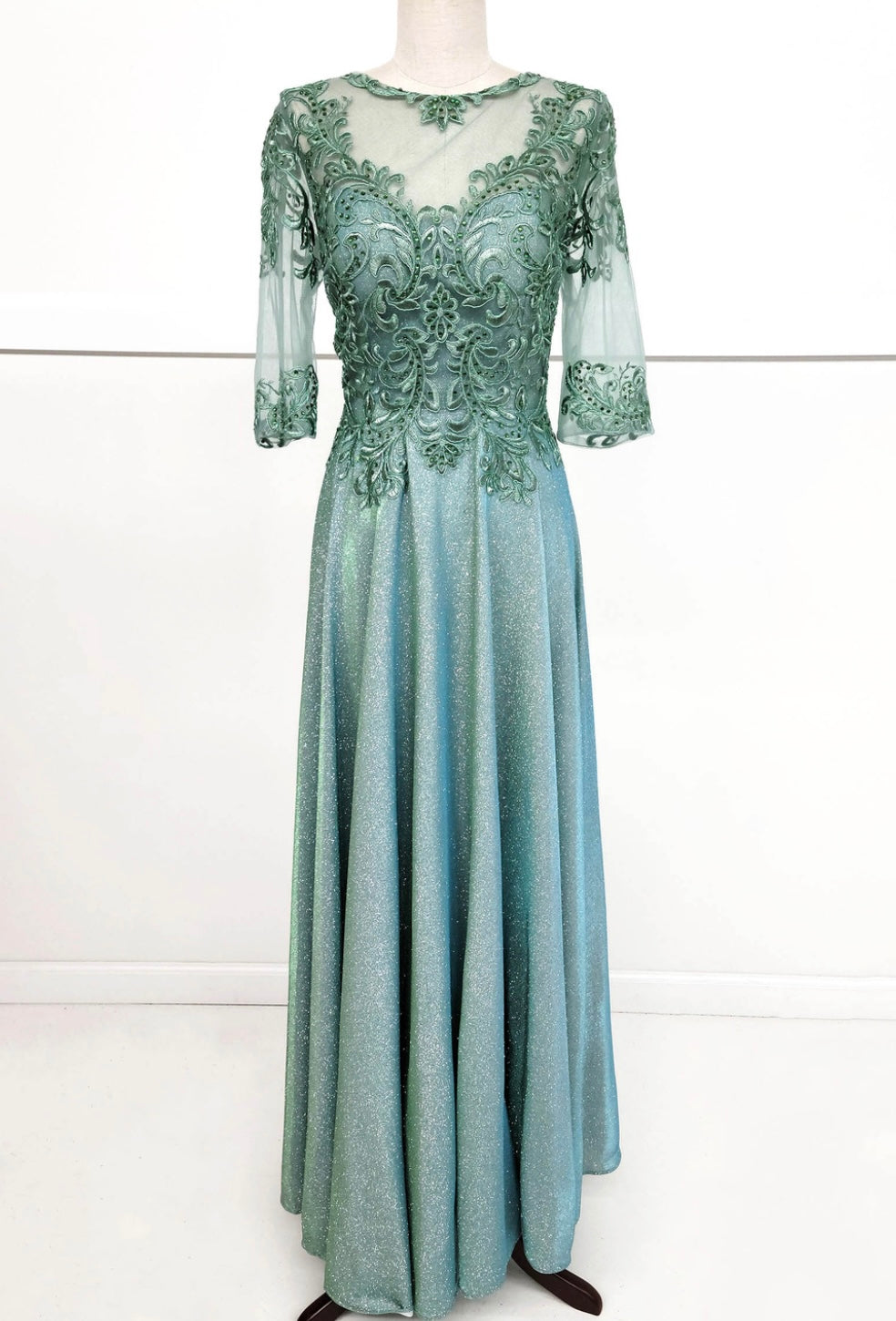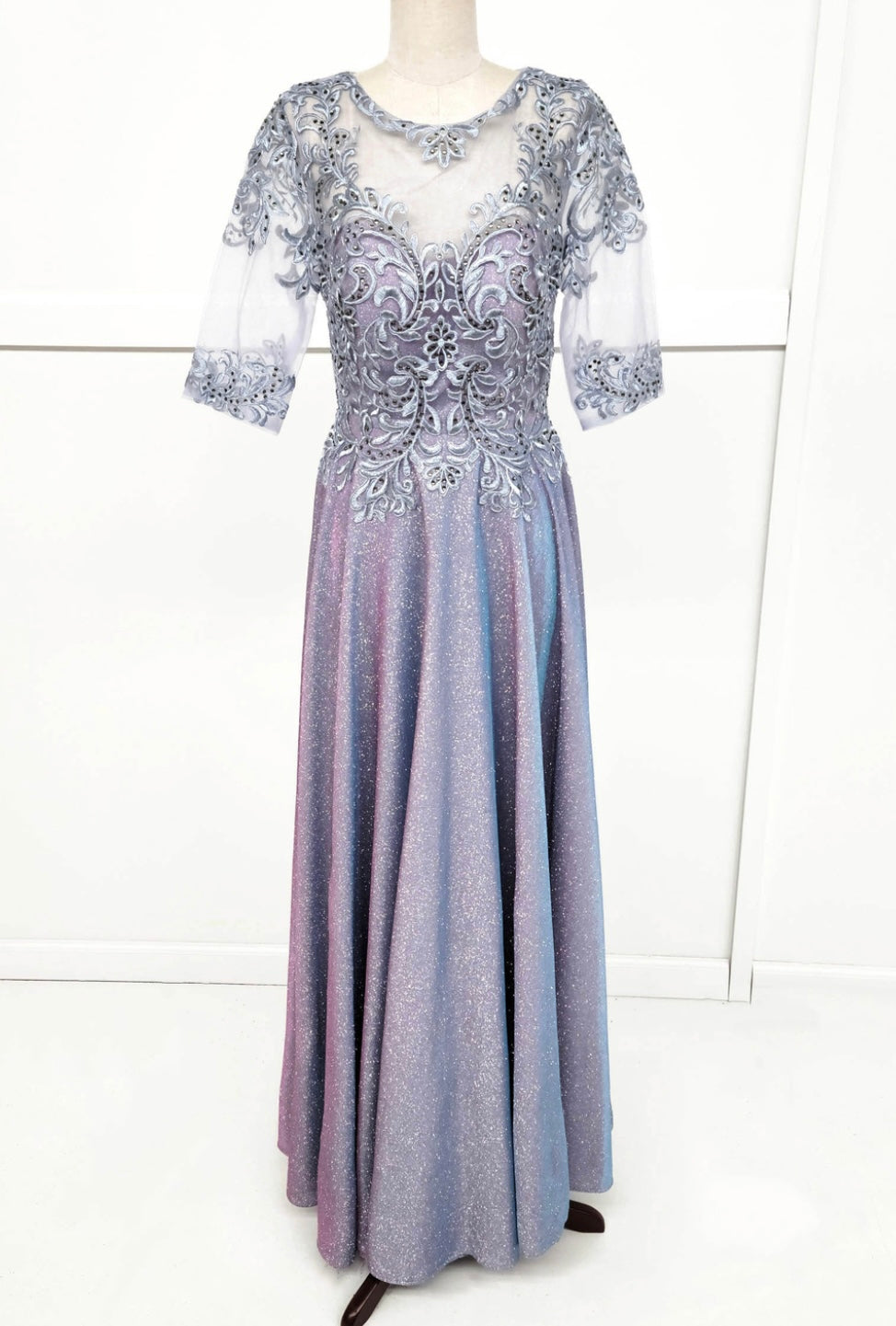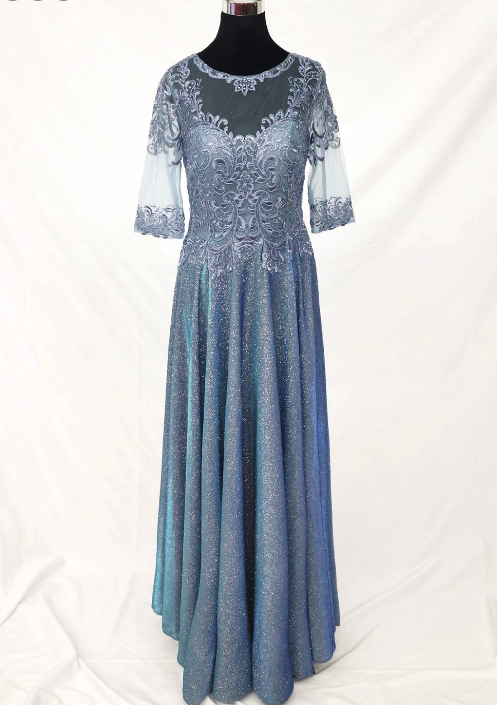 Graceful and refined, this shimmering steel blue gown by Chicas, style J0065XL6XL, is a perfect choice for elegant occasions. The bodice features intricate lace embroidery with delicate sequin accents over a sheer illusion neckline and half sleeves, adding a touch of modesty and sophistication. The A-line skirt flows effortlessly with soft glitter tulle, offering graceful movement and a flattering silhouette. Ideal for mothers of the bride, formal evening events, or special celebrations.