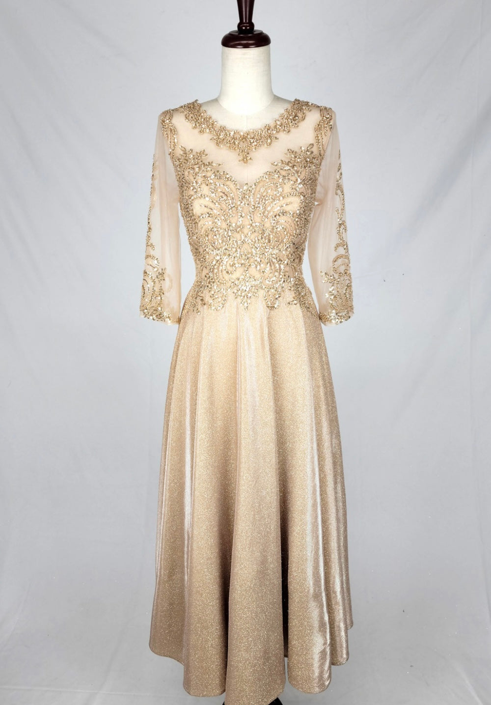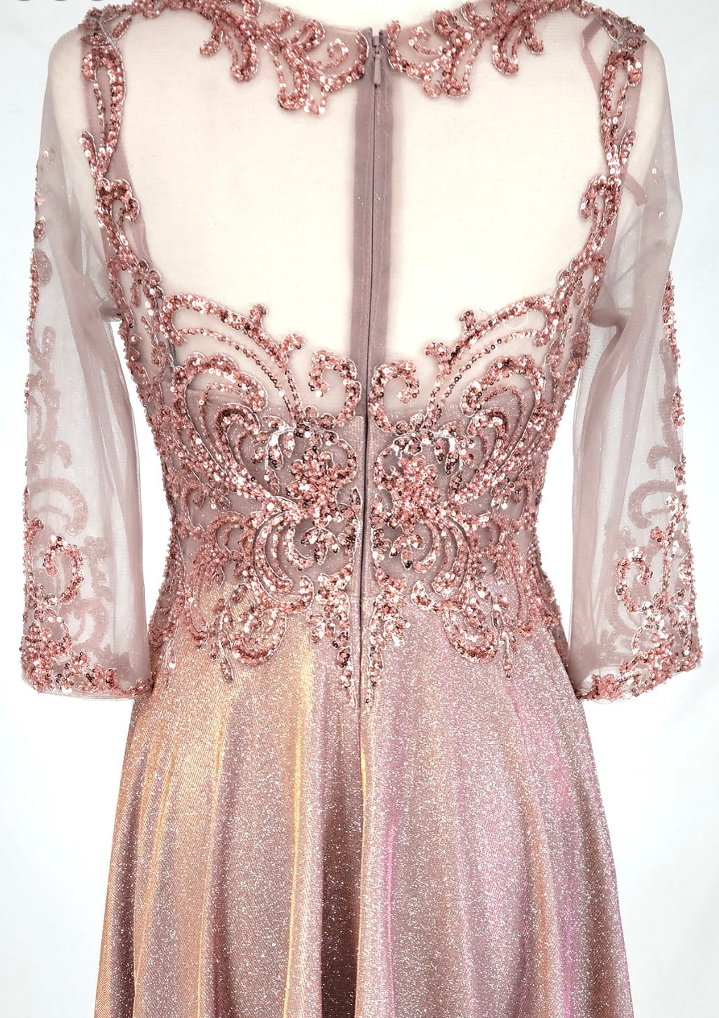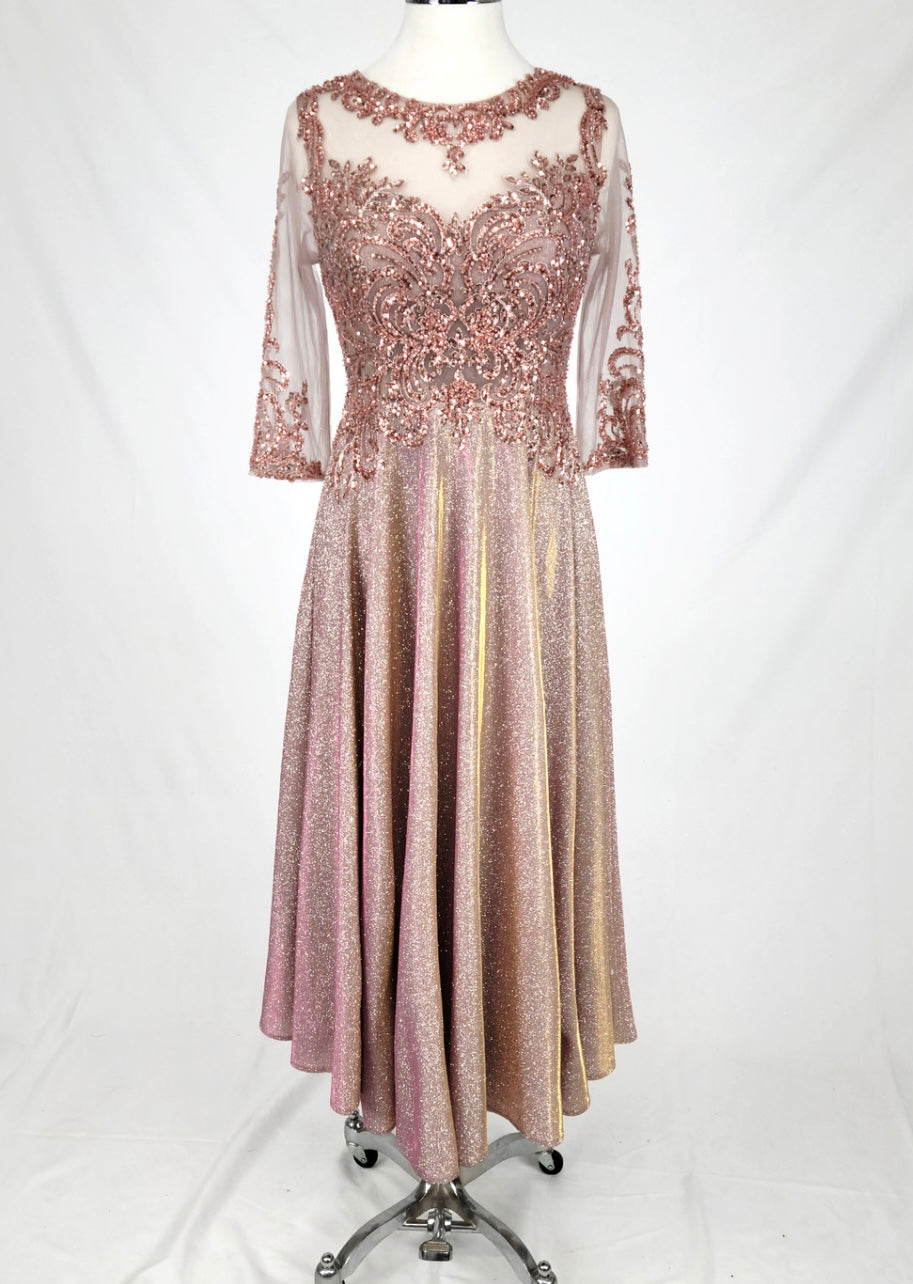 Radiate elegance in this tea-length gown by Chicas, style J040. The dress features a stunning illusion neckline with intricate rose gold embroidery and sequin detailing across the bodice and three-quarter sleeves. The shimmering A-line skirt in a gradient of pink and gold hues adds graceful movement and a touch of sparkle, making it a perfect choice for formal events or special occasions. Designed by Chicas, this dress blends sophistication and glamour effortlessly.
