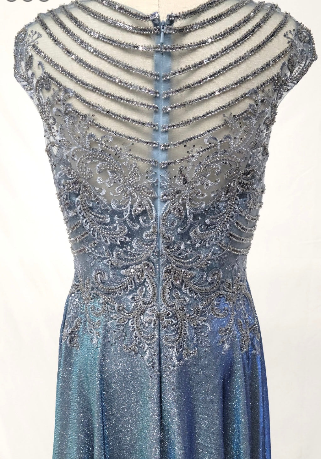 Step into timeless elegance with this beautiful evening gown by Chicas, style J132. Crafted in a shimmering gradient blue fabric, this A-line dress features a delicately embroidered bodice with a keyhole neckline and cap sleeves, offering a perfect blend of modesty and charm. The glittering full-length skirt adds graceful movement and sparkle, making it ideal for formal events. Designed by Chicas, this gown is a sophisticated choice for any special occasion.