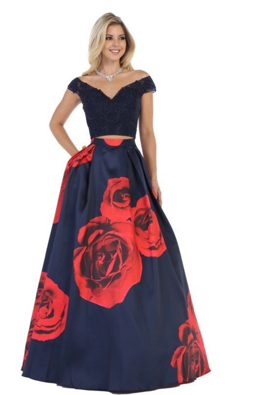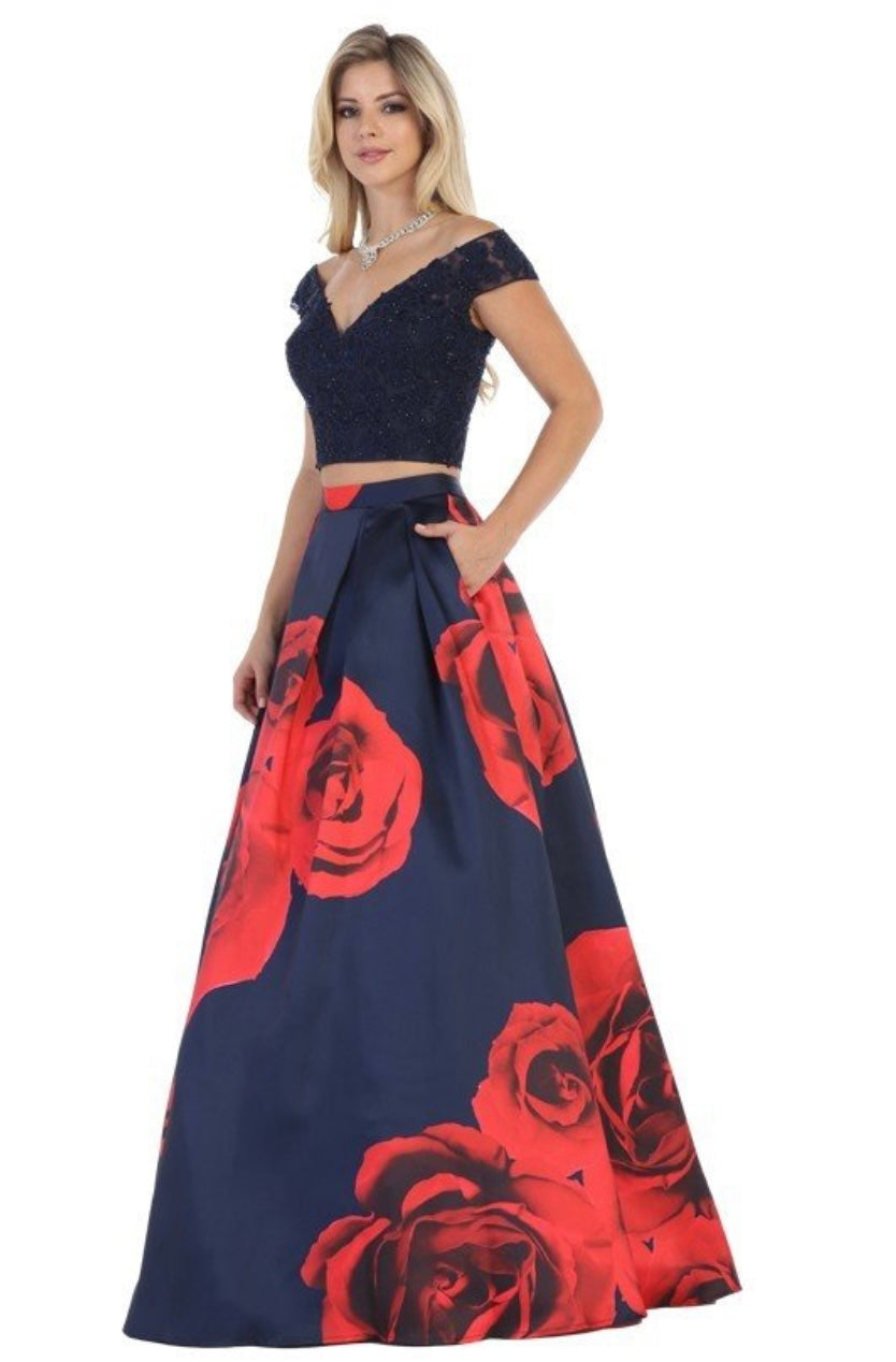 This two-piece gown from the brand Chicas, style LM8011, features a stunning off-the-shoulder navy blue lace crop top embellished with delicate beading for a touch of sparkle and elegance. The full-length A-line skirt in satin showcases a bold floral print with oversized red roses, creating a dramatic contrast against the deep navy background. Finished with hidden pockets and a bow detail at the waist, this look is both romantic and fashion-forward—perfect for quinceañeras, formal events, or any occasion where you want to stand out.