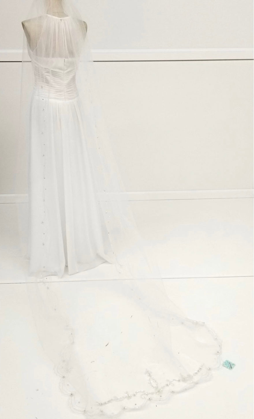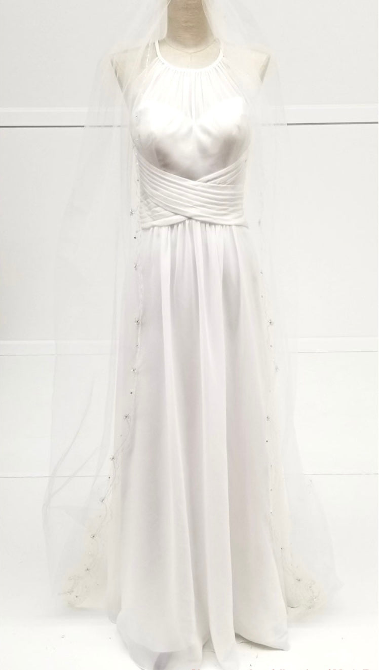 Graceful and romantic, this white bridal gown by Chicas, style V201295, designed by Chicas, features a halter neckline and softly pleated bodice for an elegant silhouette. The ruched waistband accentuates the waistline, while the flowy A-line skirt offers timeless charm and ease of movement. Paired with a delicate veil adorned with subtle embellishments, this gown is perfect for a bride seeking classic sophistication and modern simplicity.