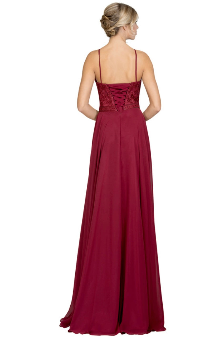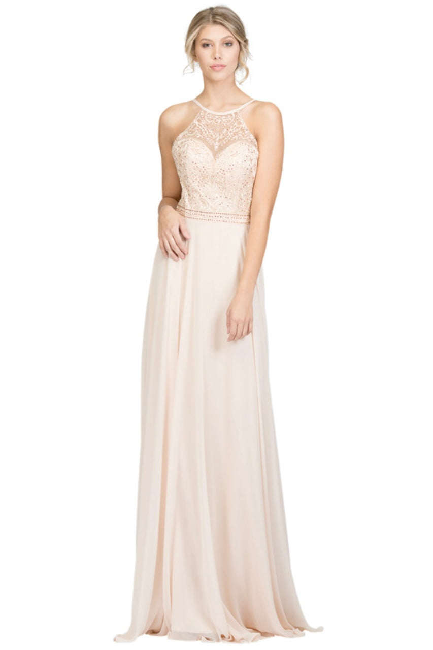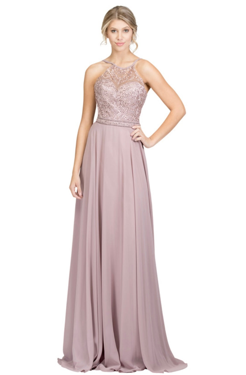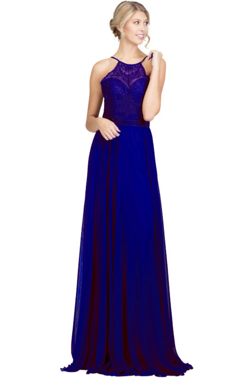 Make a lasting impression in this elegant long gown by Chicas, design YG5005. This sleeveless dress features a fitted illusion bodice with intricate lace embroidery and sparkling beadwork, creating a sophisticated and feminine look. The high halter neckline and sheer detailing add a modern touch, while the flowy chiffon skirt falls gracefully to the floor, offering soft movement and timeless charm. Perfect for evening occasions, bridesmaids, or formal events, this style is available in a variety of colors to suit your theme.
