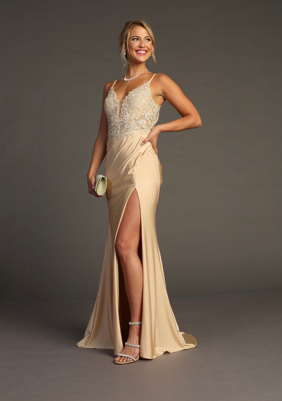 Command attention in this glamorous fitted gown by Chicas, style YG5033. This sleek design features a plunging illusion neckline with delicate spaghetti straps and a lace-embellished bodice that adds a touch of elegance. The figure-hugging silhouette flows into a floor-length skirt with a daring high slit, offering both sophistication and allure. Ideal for prom, evening events, or formal occasions where you want to shine.